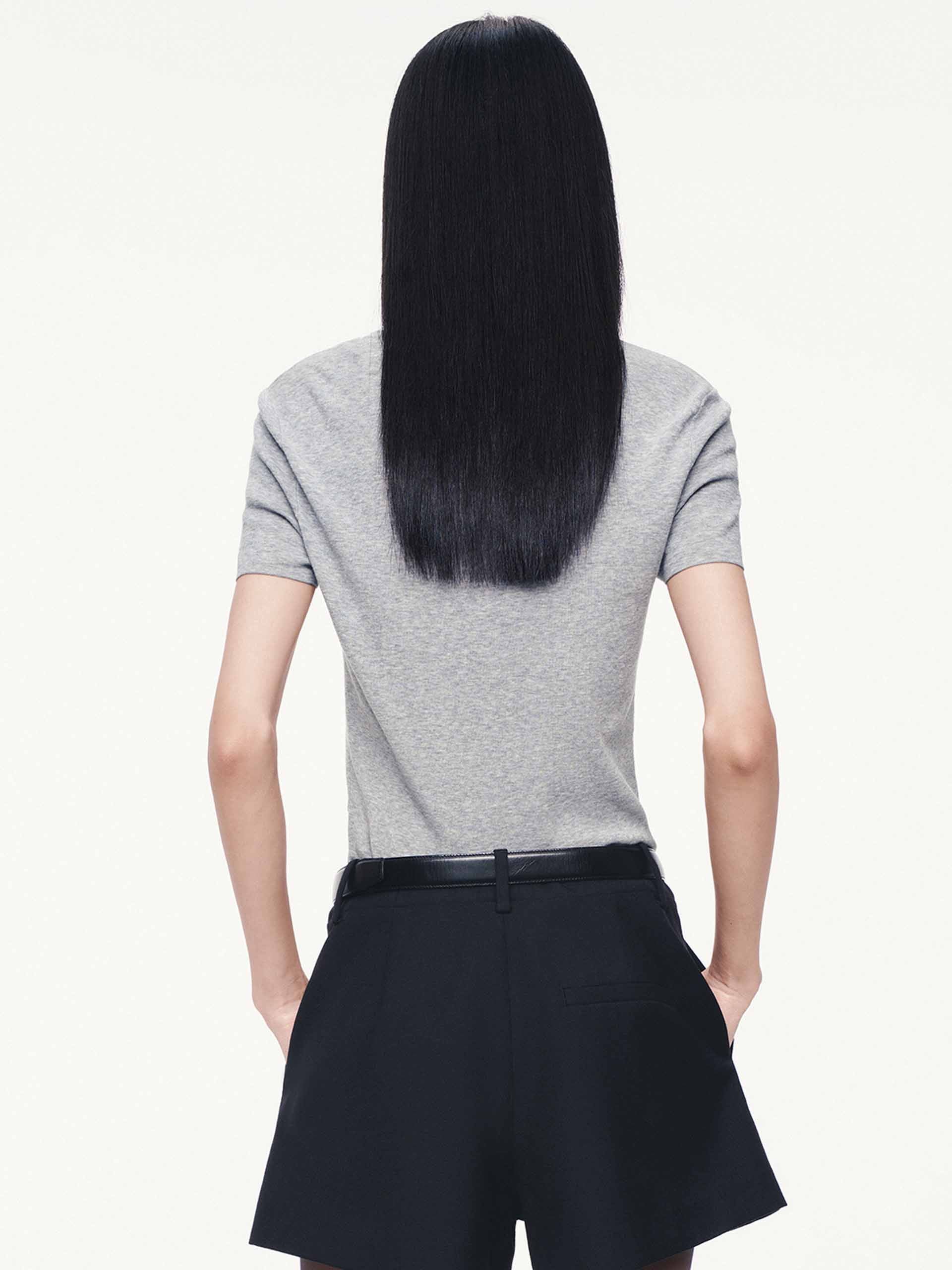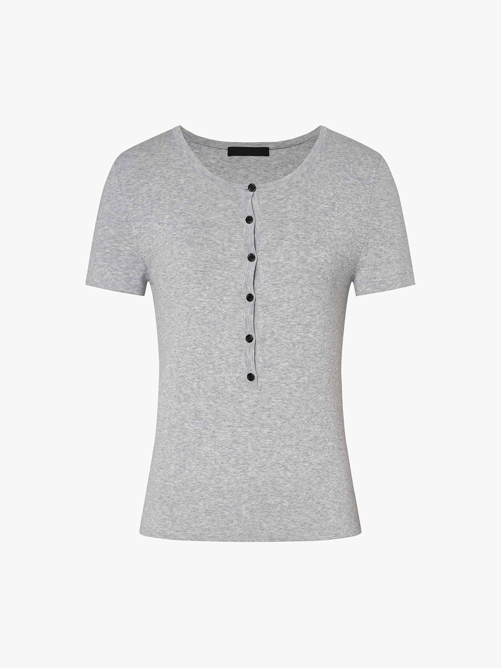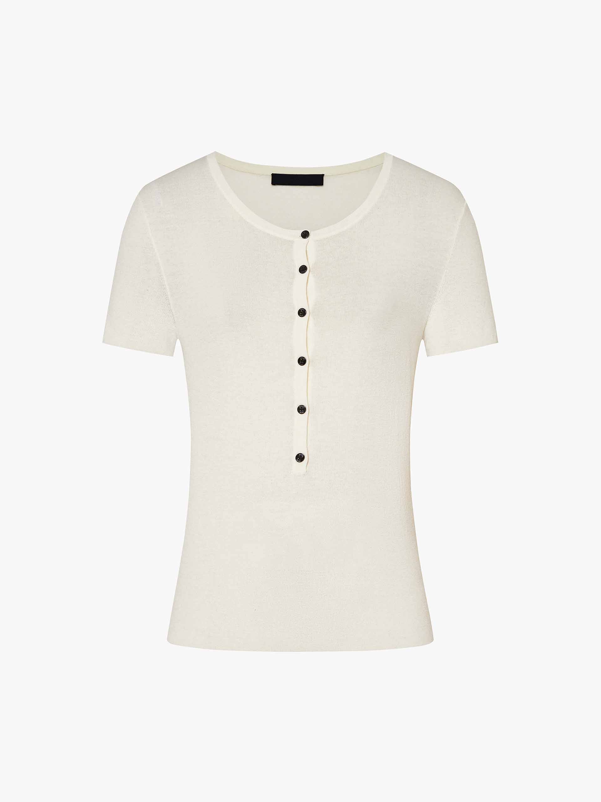 Effortless elegance meets modern femininity in our top, designed to flatter with its slim fit silhouette that gracefully skims the body. The custom half-button closure adds a unique twist to a classic design, allowing for versatile styling options while the round neckline and short sleeves create a timeless, clean aesthetic.