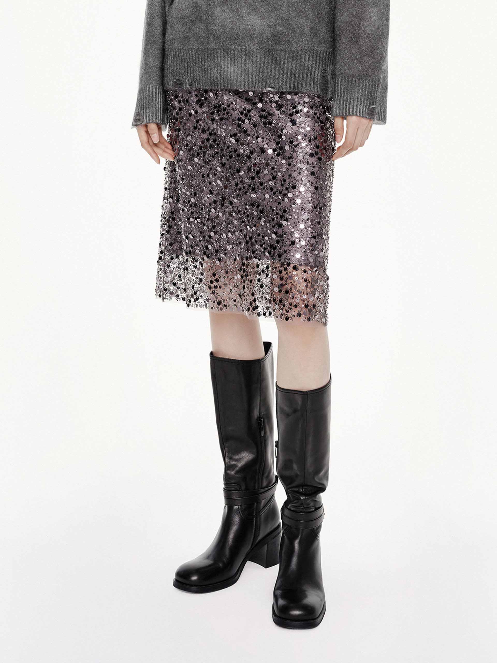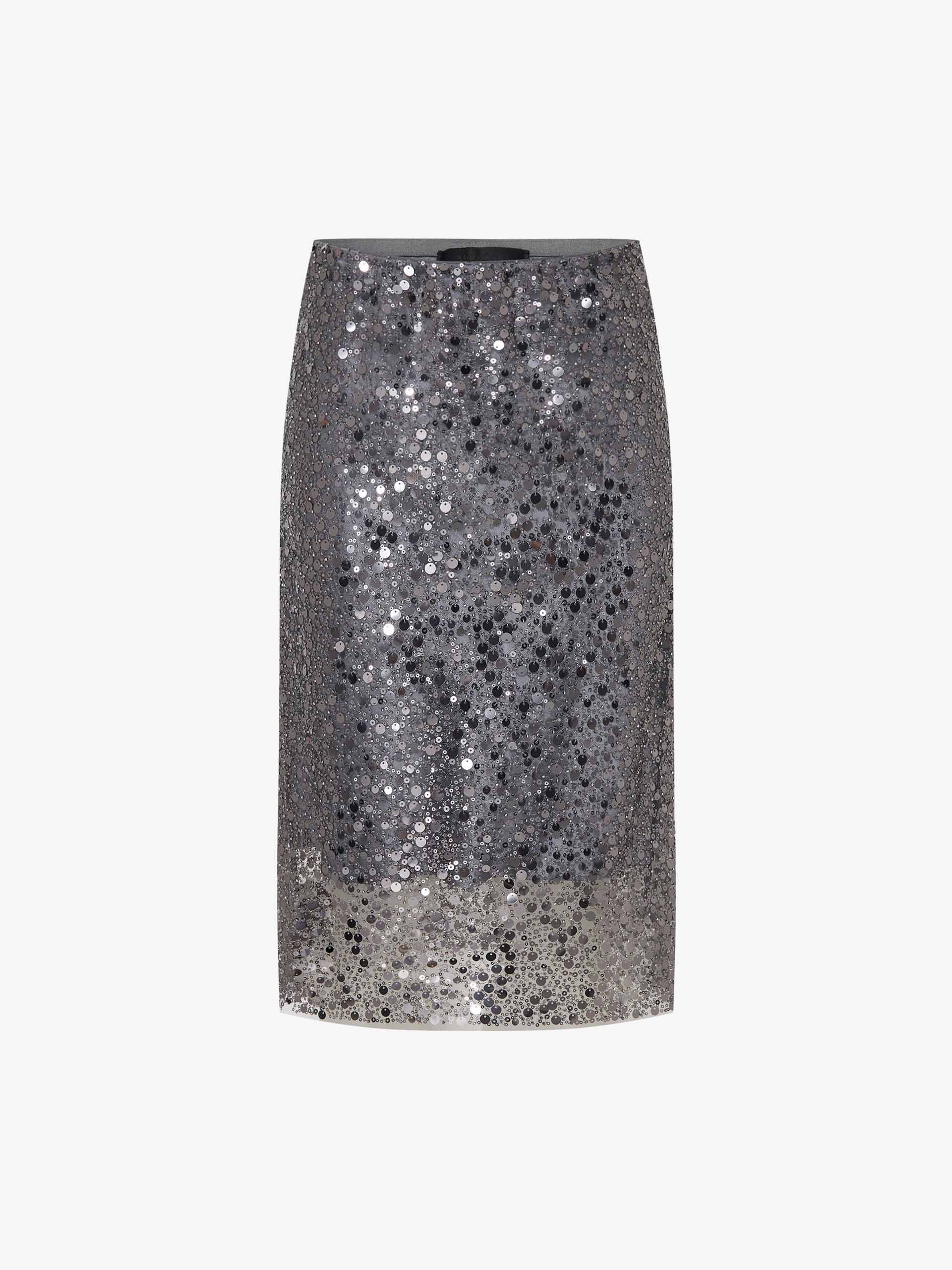 Dazzle with understated glamour in this skirt, where structure meets shimmer in perfect harmony. What makes it extraordinary is its all-over sequin embroidery, catching light with every movement like scattered moonlight. The elasticated waistband ensures comfort without compromising the sleek lines, making it as easy to wear for cocktail hours as it is for spontaneous twirls.