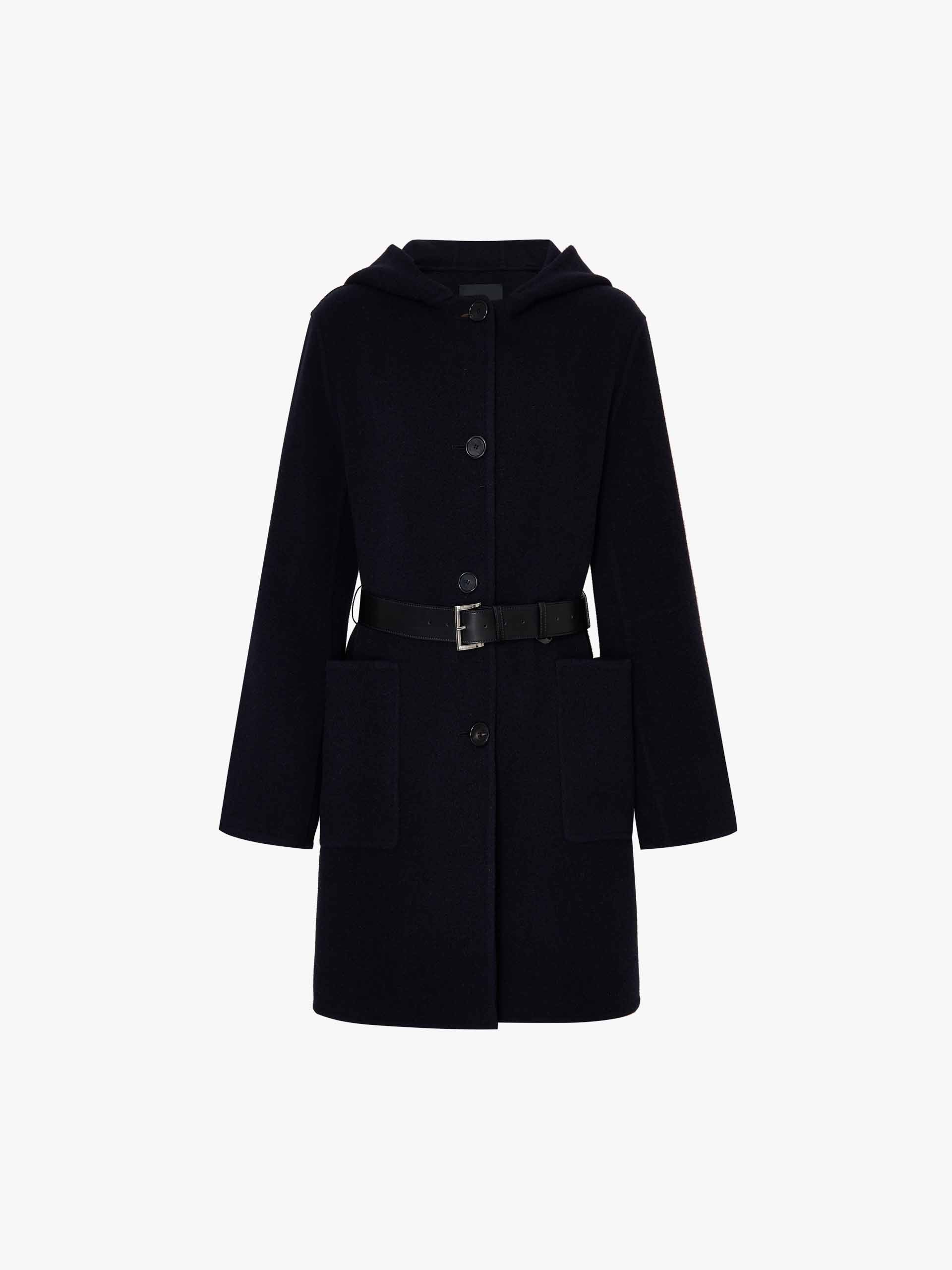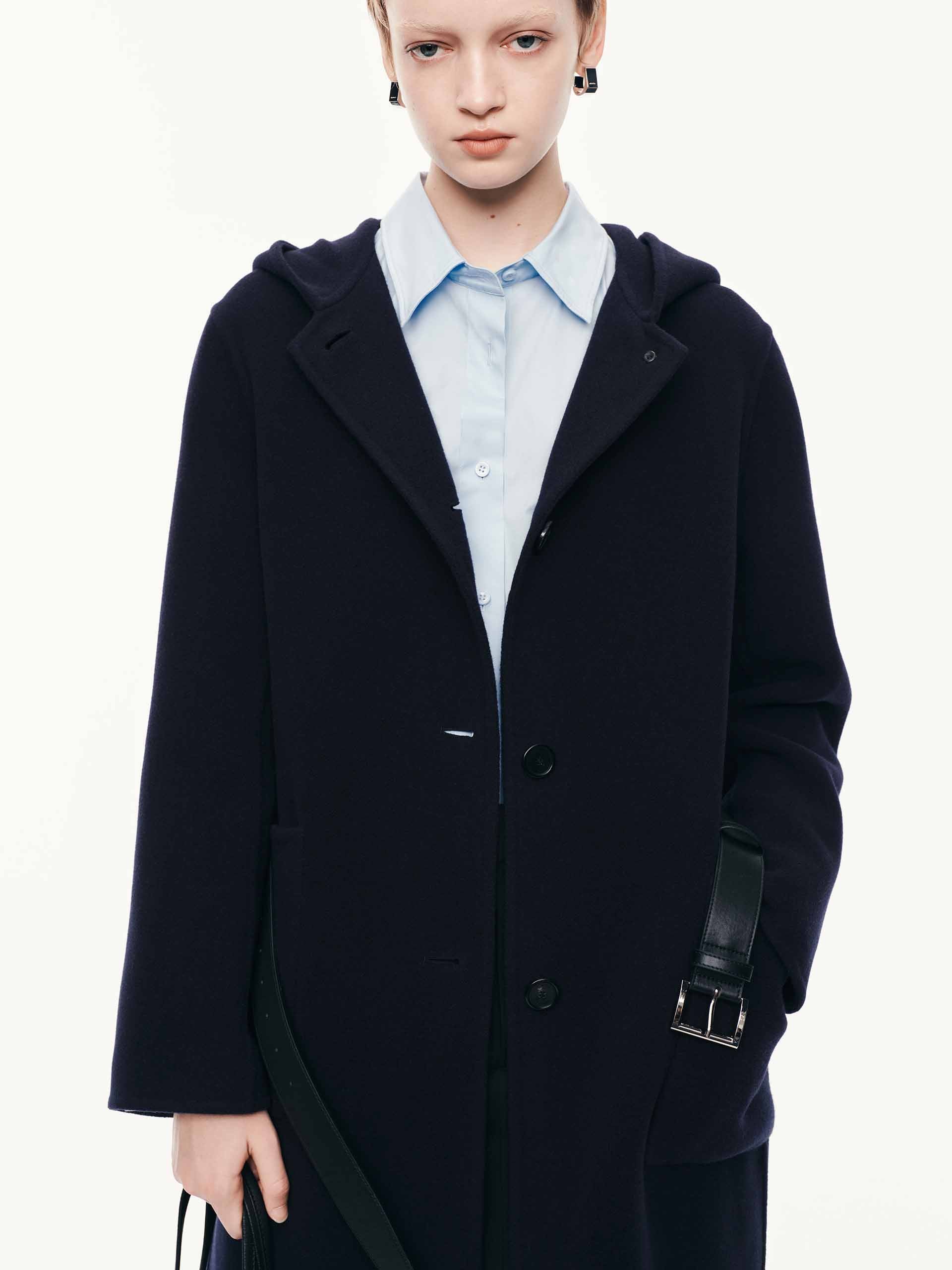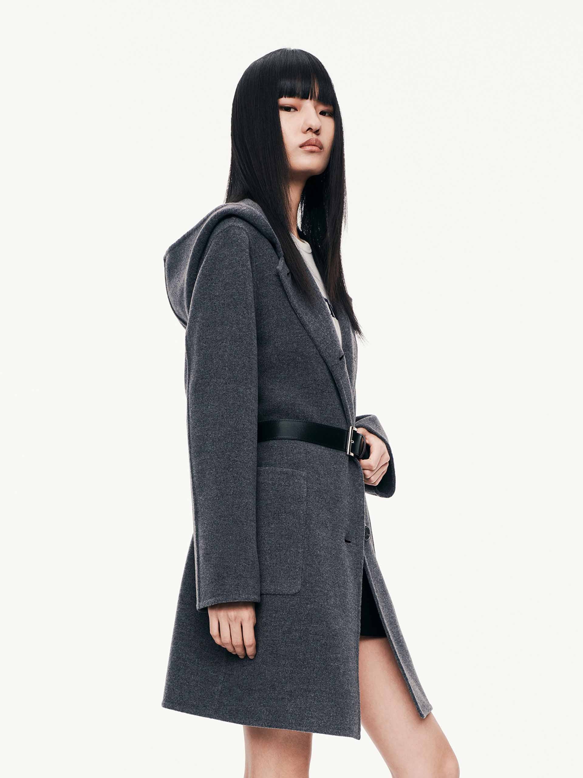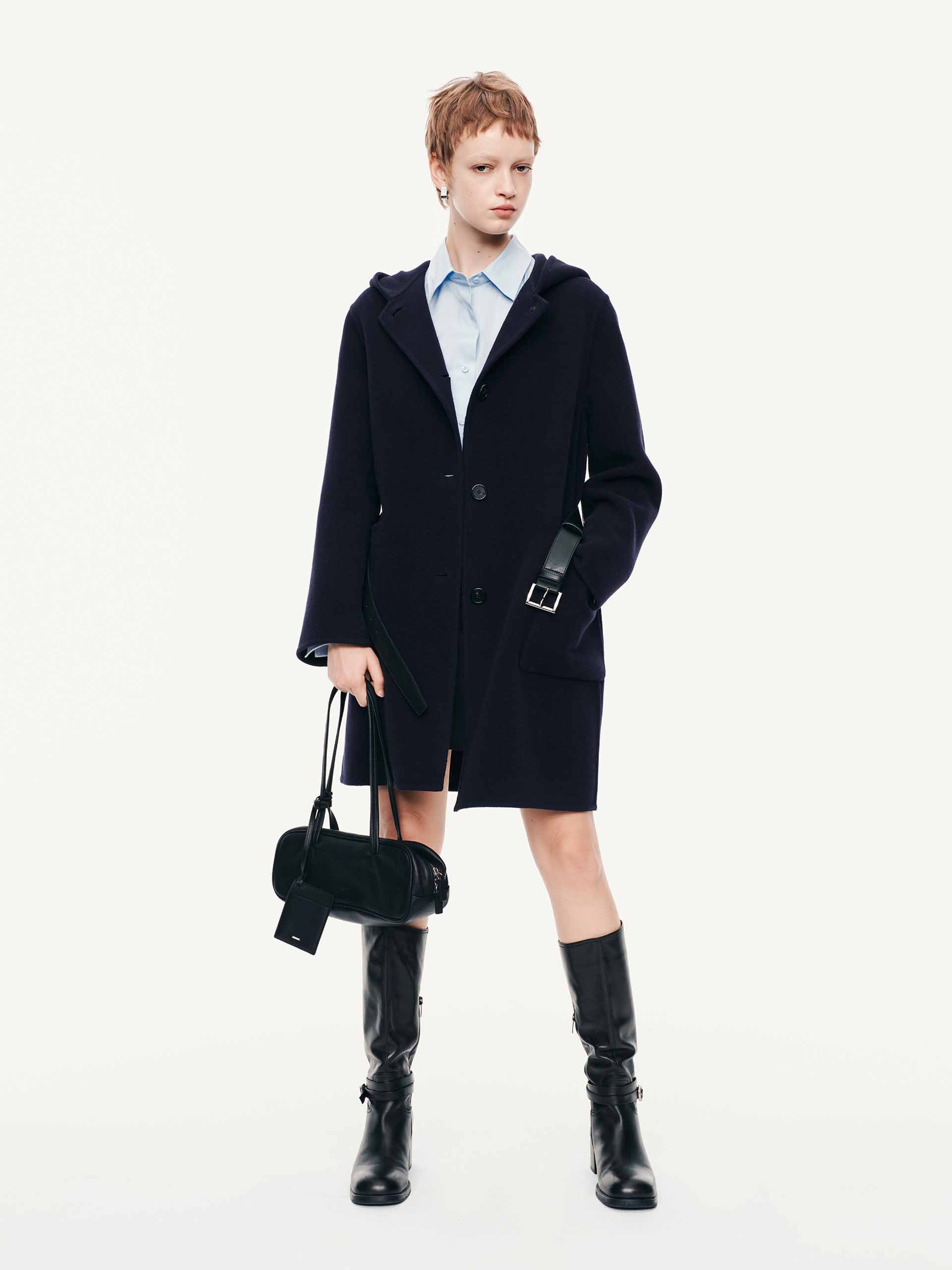 Embrace timeless elegance and modern functionality with the coat, expertly tailored for those who appreciate refined outerwear. It features a sophisticated button closure and practical patch pockets, blending classic tailoring with everyday convenience. The attached hood adds a touch of relaxed utility, while the included belt allows you to cinch the waist for a defined, elegant shape.