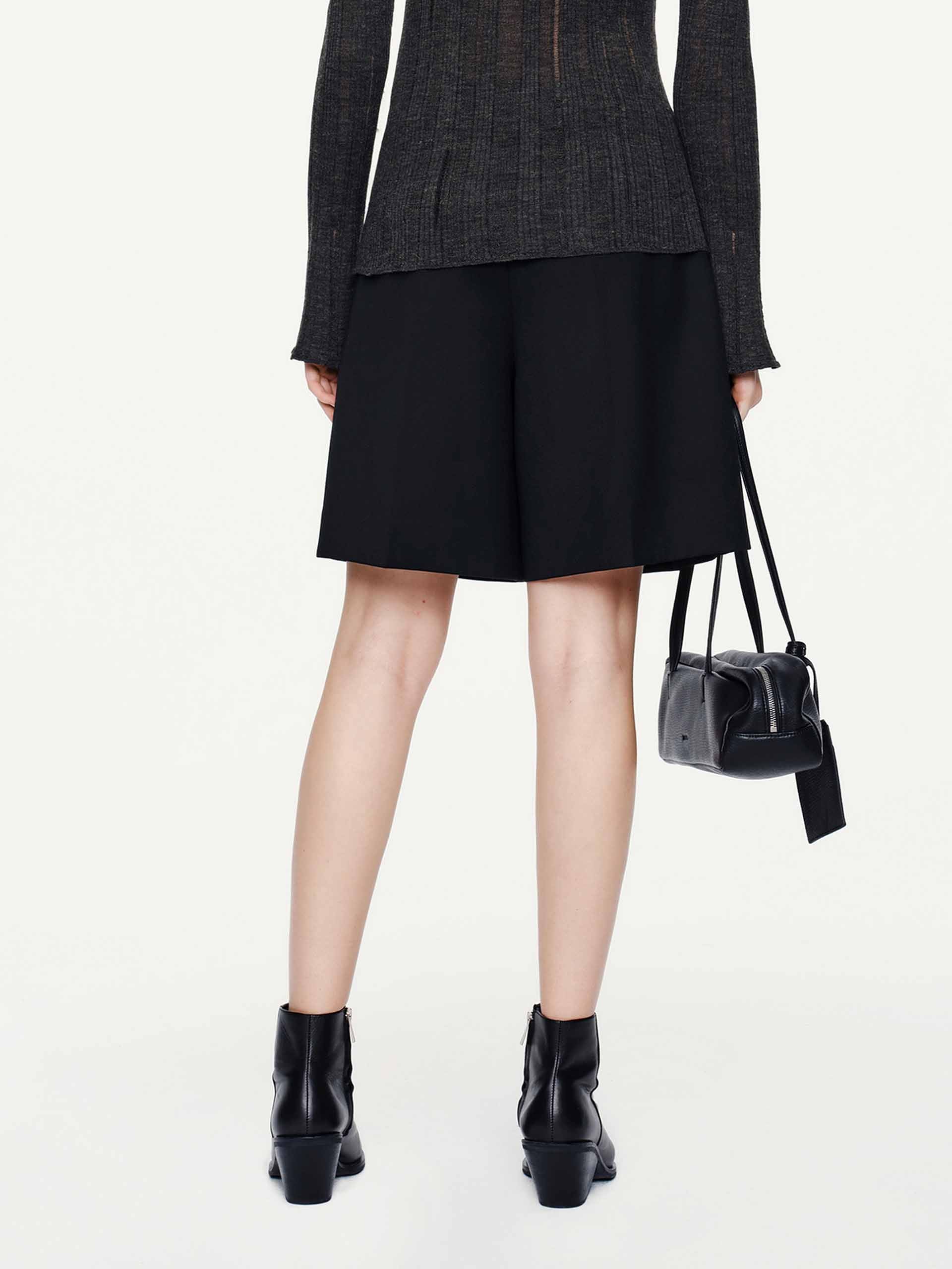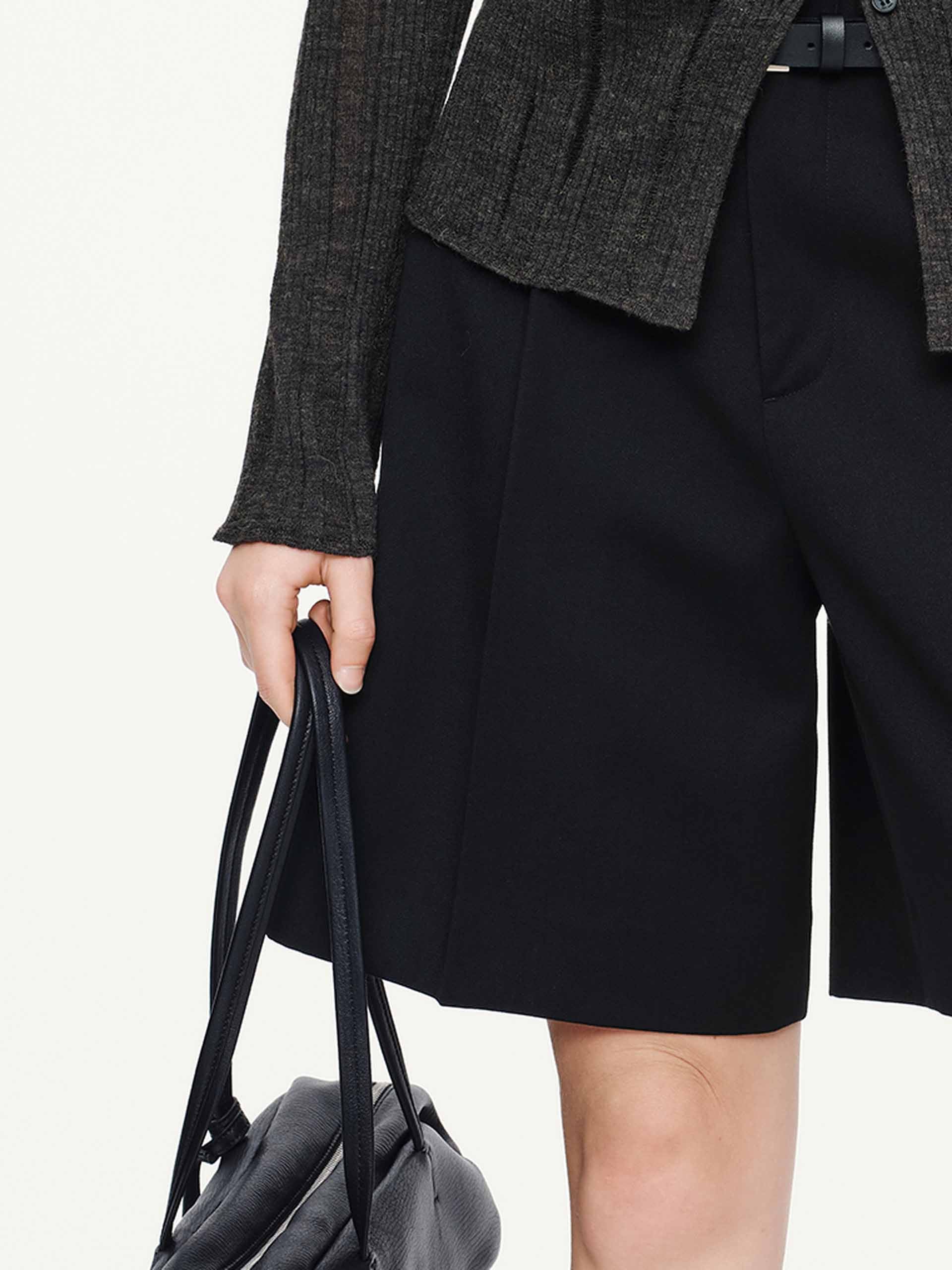 These shorts redefine casual elegance with their impeccable tailoring and thoughtful details. A high-waisted design elongates the legs while providing a sleek, polished look, accentuated by the delicate pleating that adds subtle movement and dimension. The hook, bar, and zip closure ensure a secure yet comfortable fit, while the functional side pockets blend practicality with style.