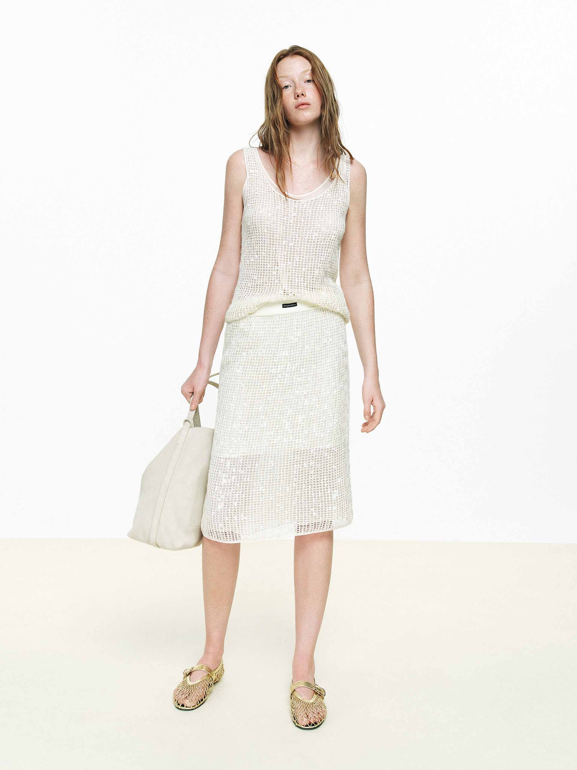 A midi skirt that balances ease and elegance. The soft cotton crochet base is delicately adorned with sequins—sparkle that catches the light without overwhelming. A straight silhouette, thoughtful lining, and elasticated waistband make it as comfortable as it is refined. Pair with the matching knit top for a cohesive, considered look.