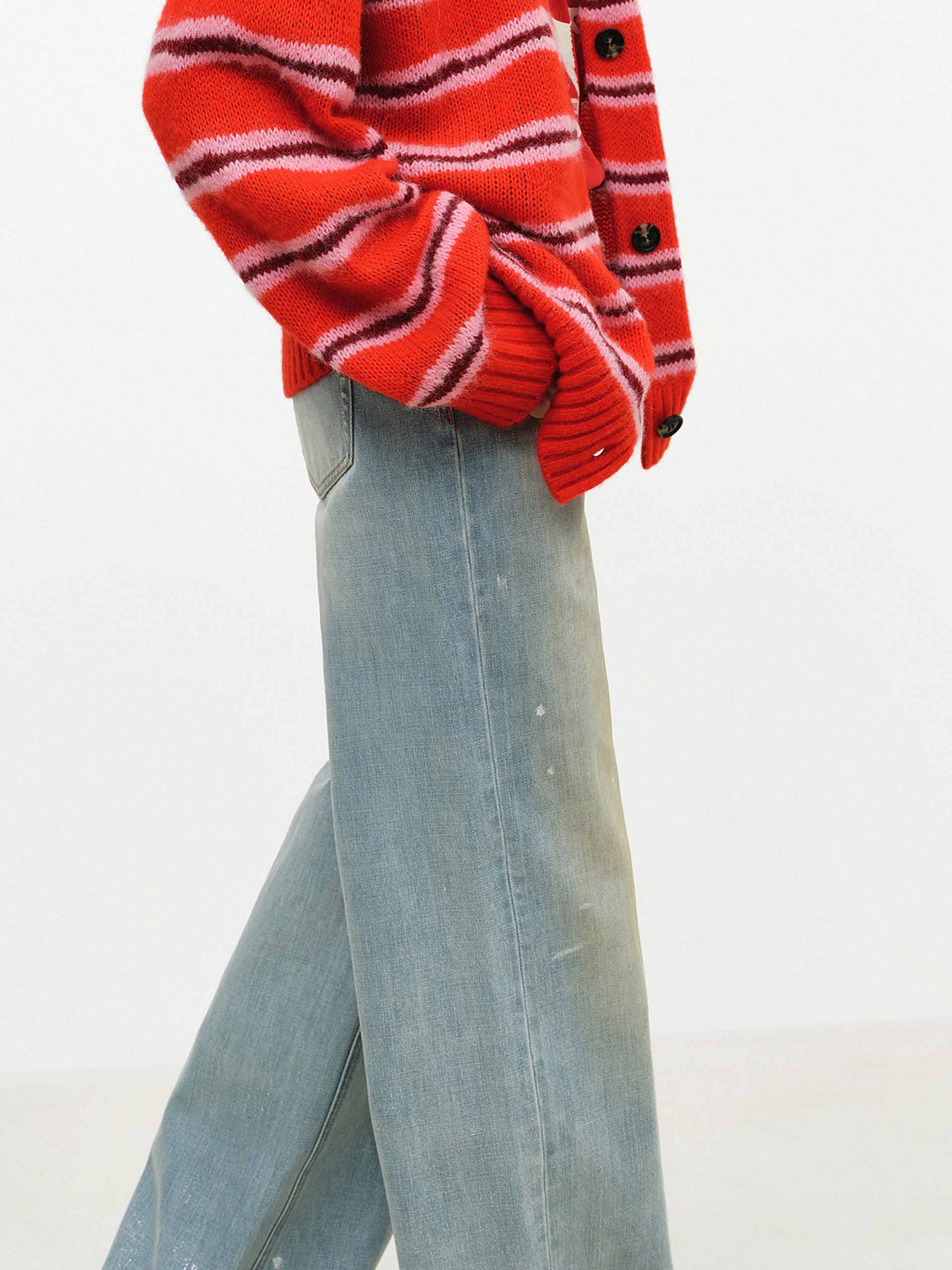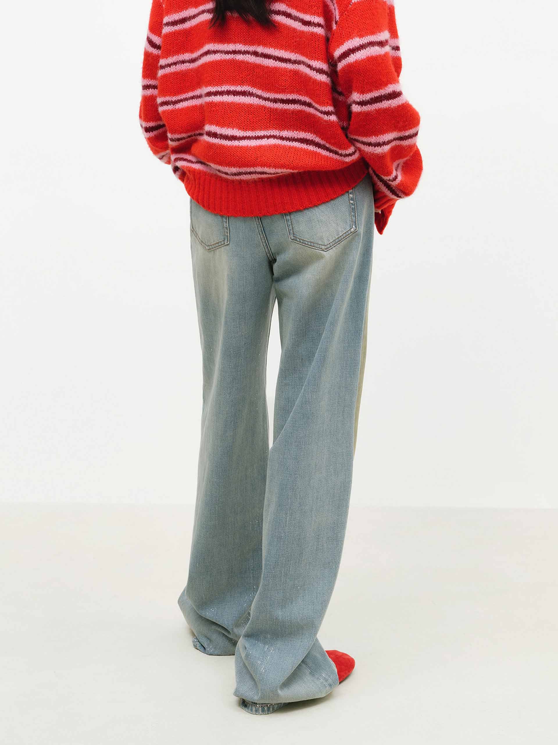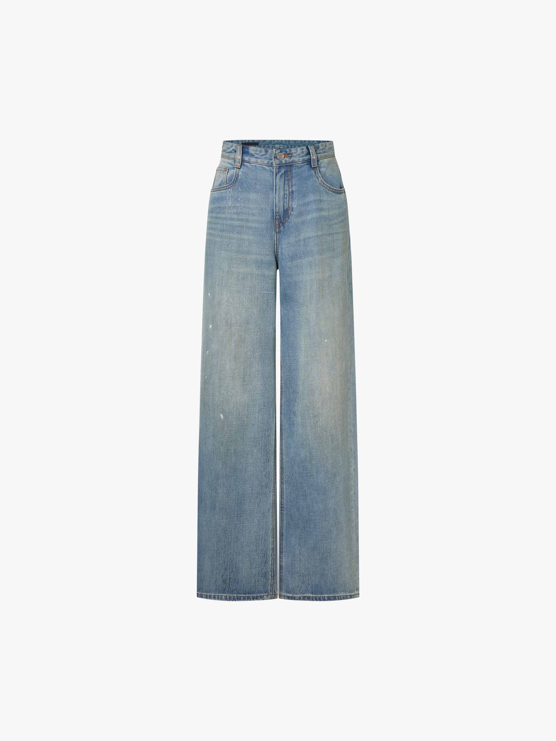 These 100% breathable cotton jeans combine a washed distressed design with artistic ink splash decoration and a leather waist tag, emphasizing a free-spirited street style. A high-value fashion item for spring, they easily create a laid-back yet trendy look, whether styled for everyday wear or travel outfits.