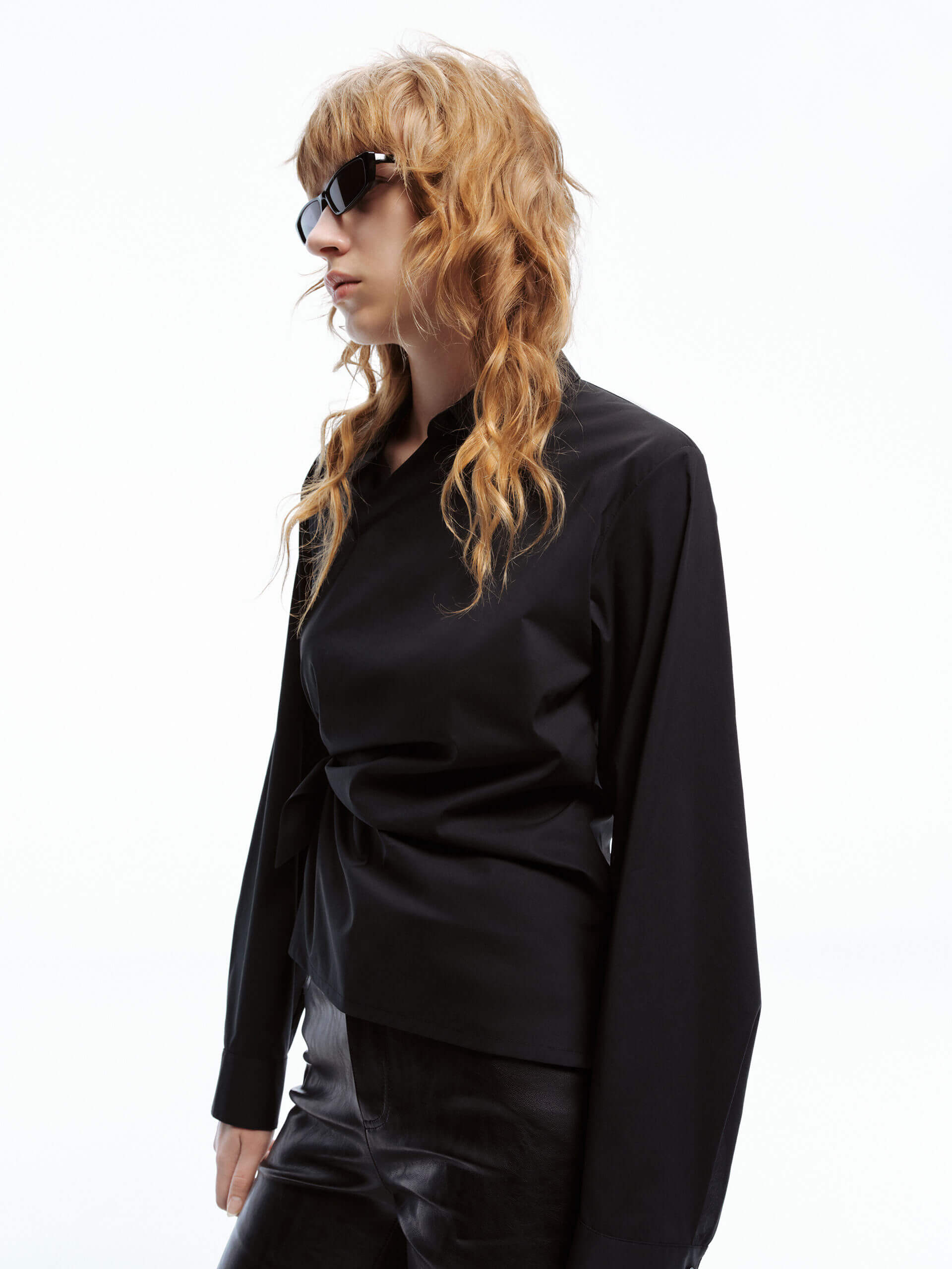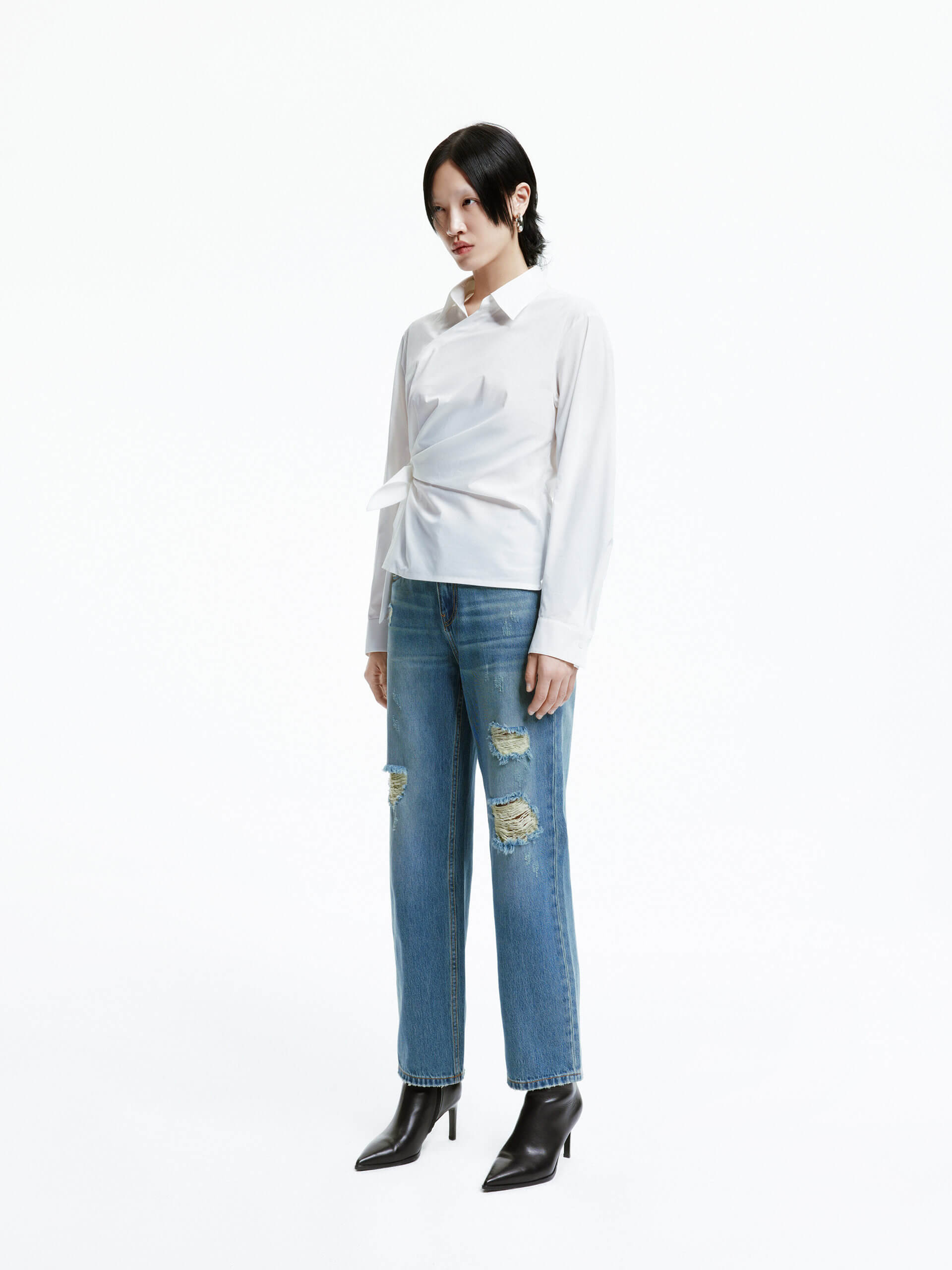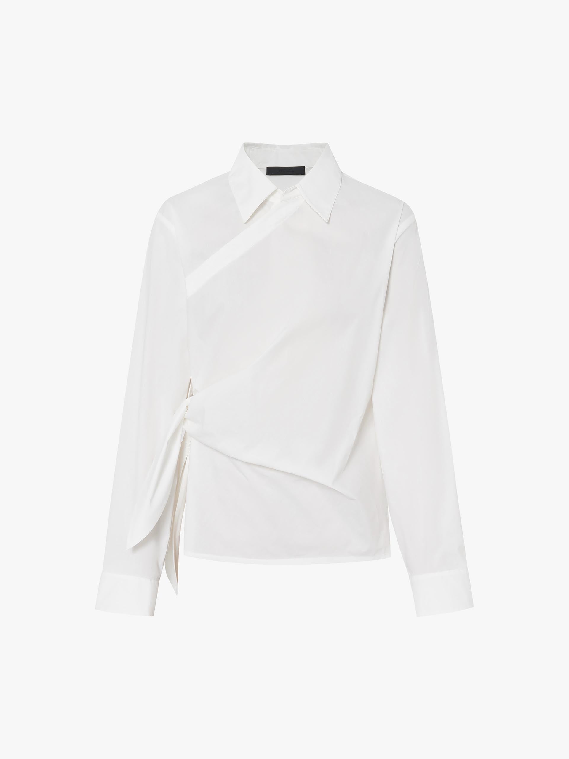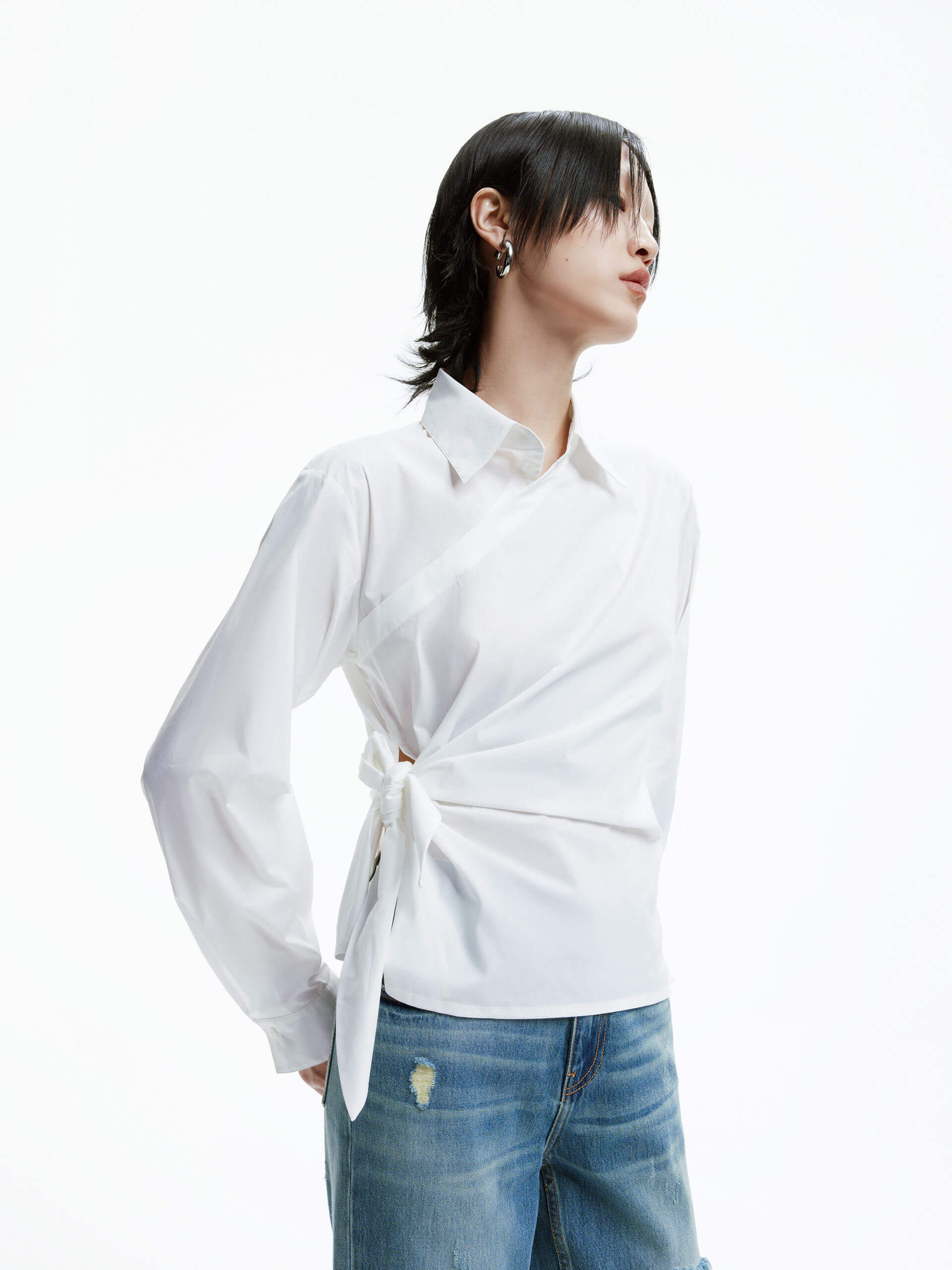 Crafted from a comfortable cotton blend, this shirt features a classic shirt style with a unique slanted placket and self-tie waist for a flattering fit.