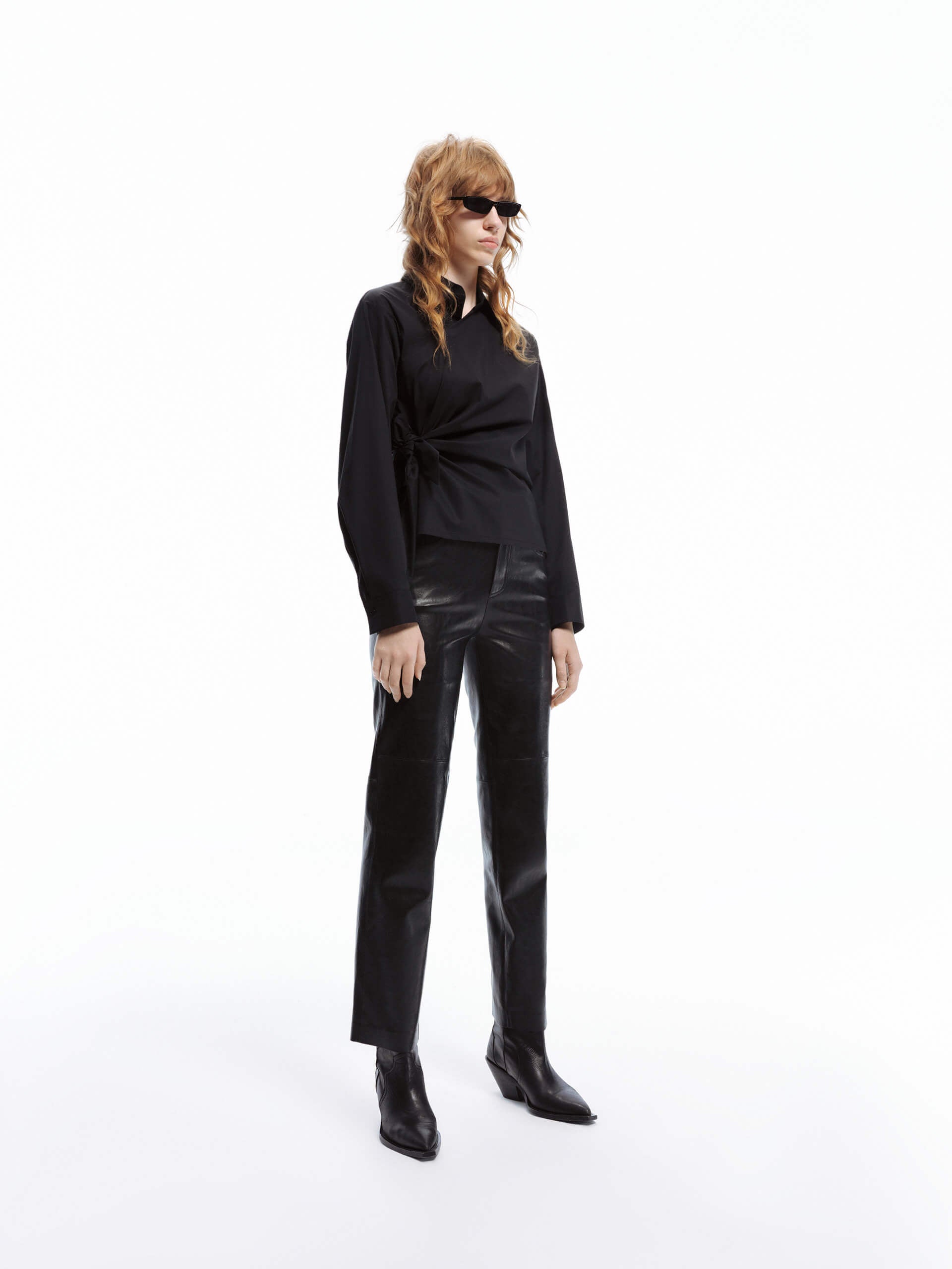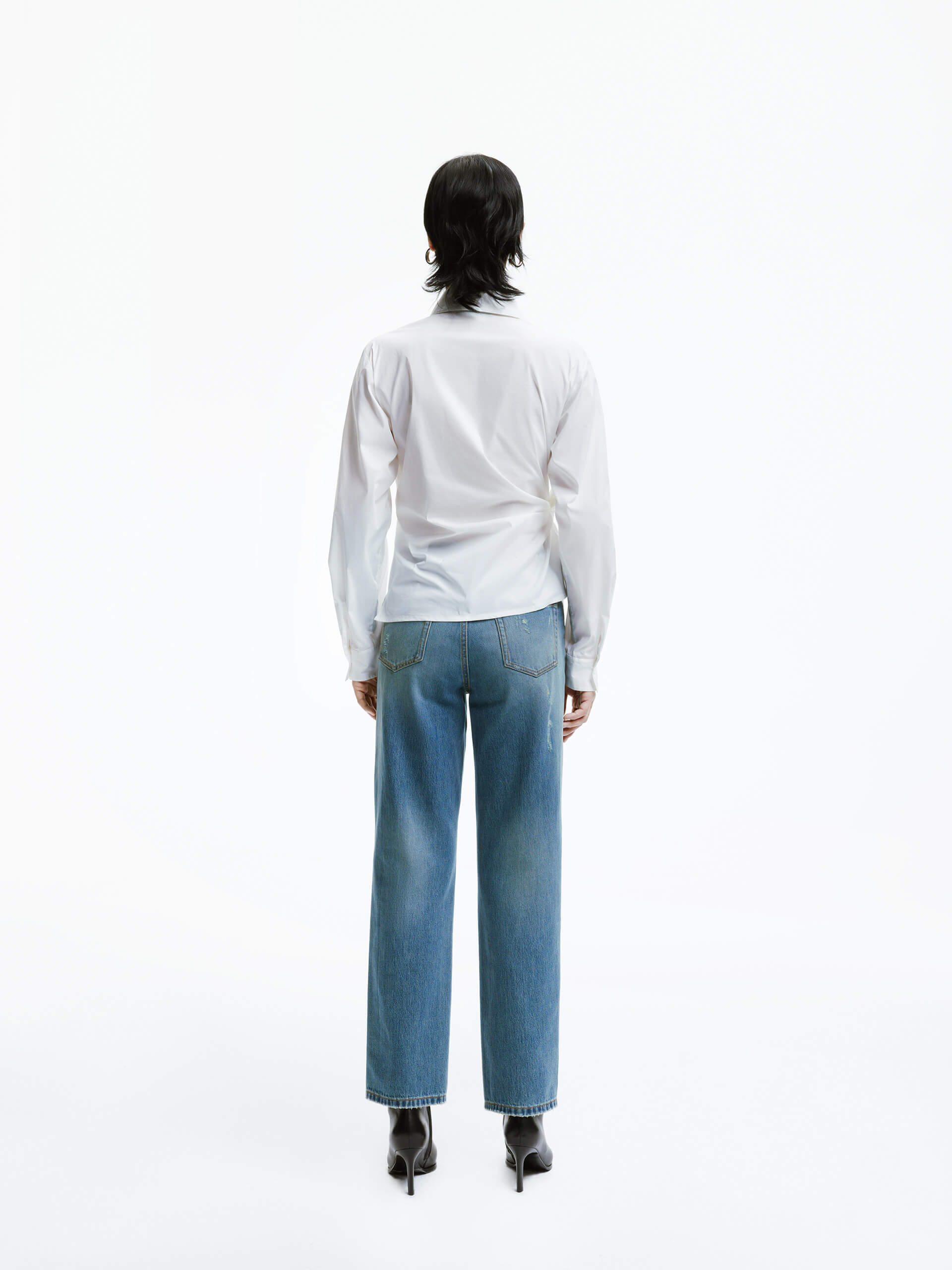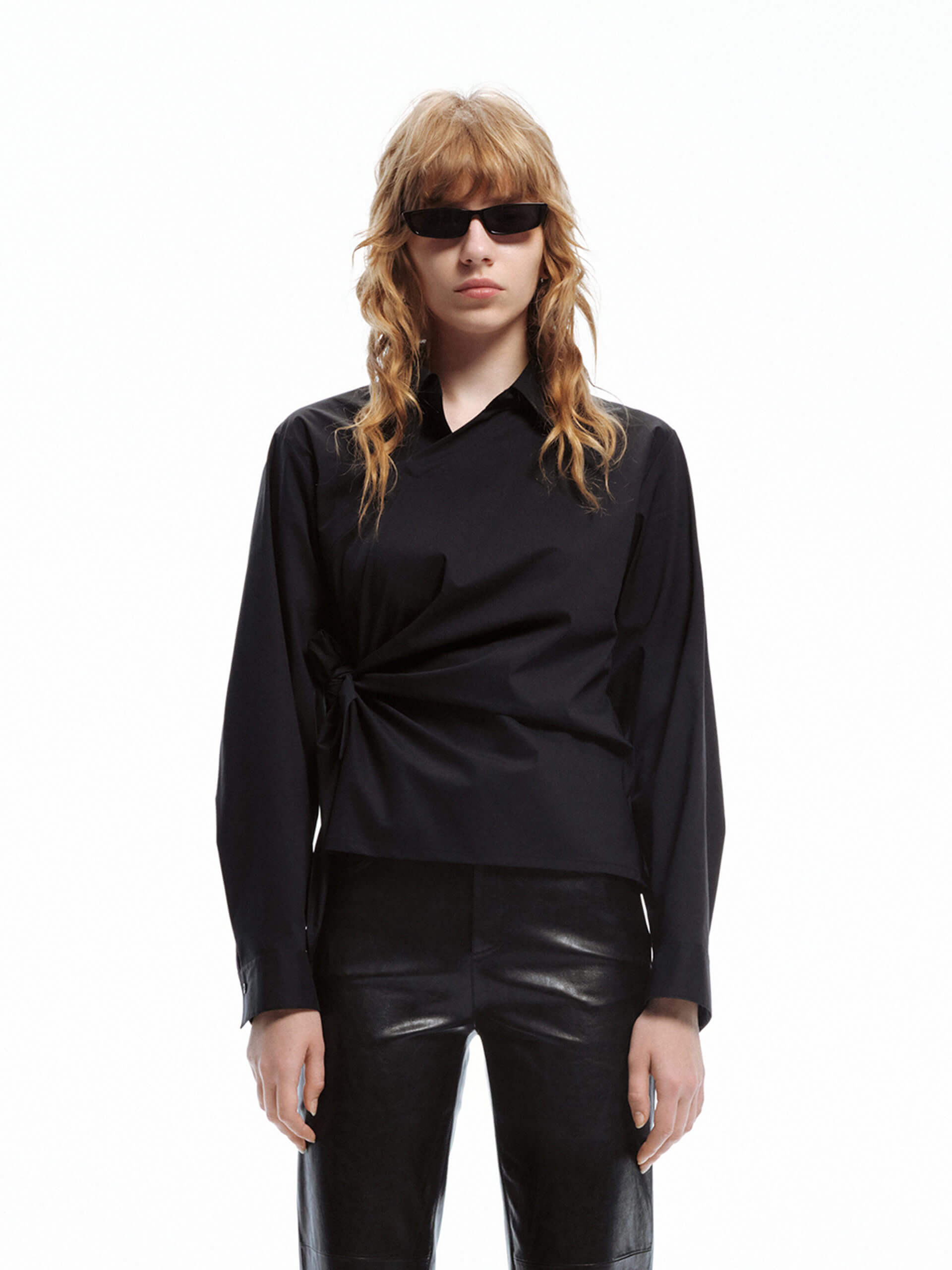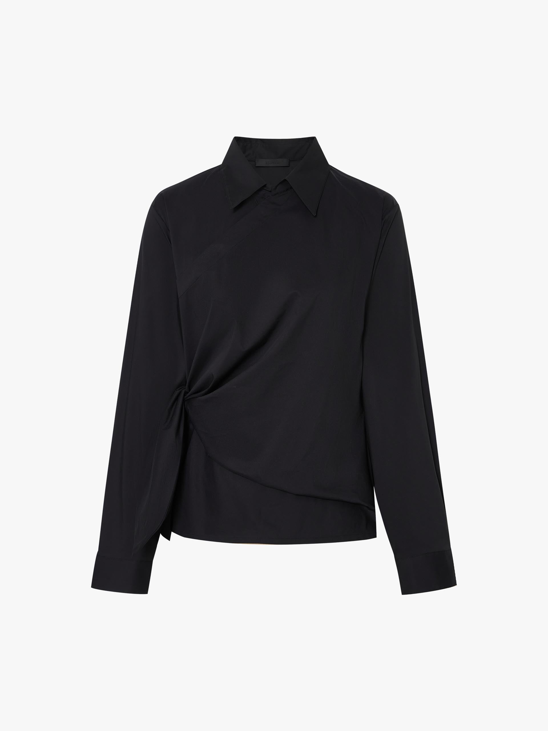 Crafted from a comfortable cotton blend, this shirt features a classic shirt style with a unique slanted placket and self-tie waist for a flattering fit.