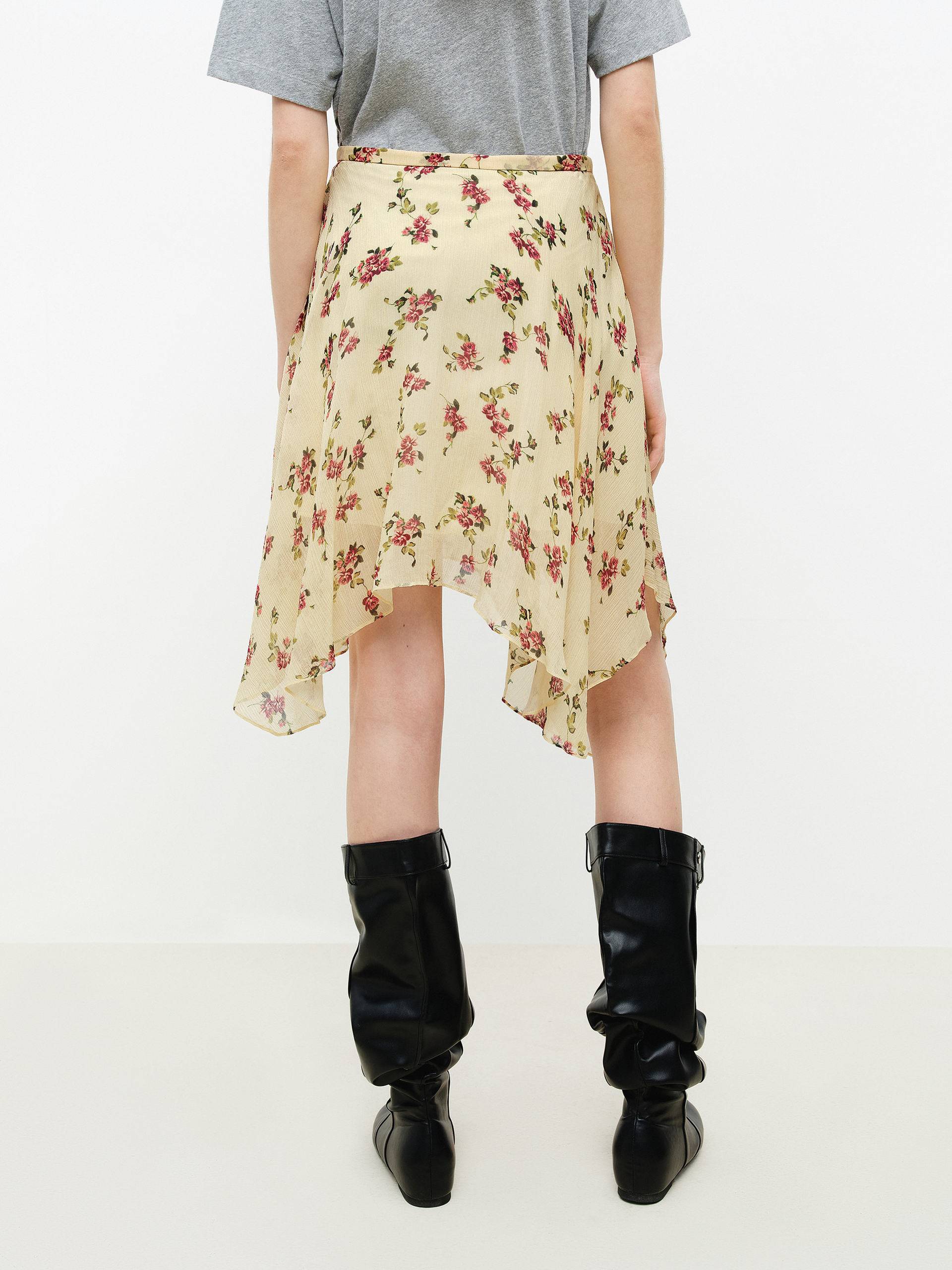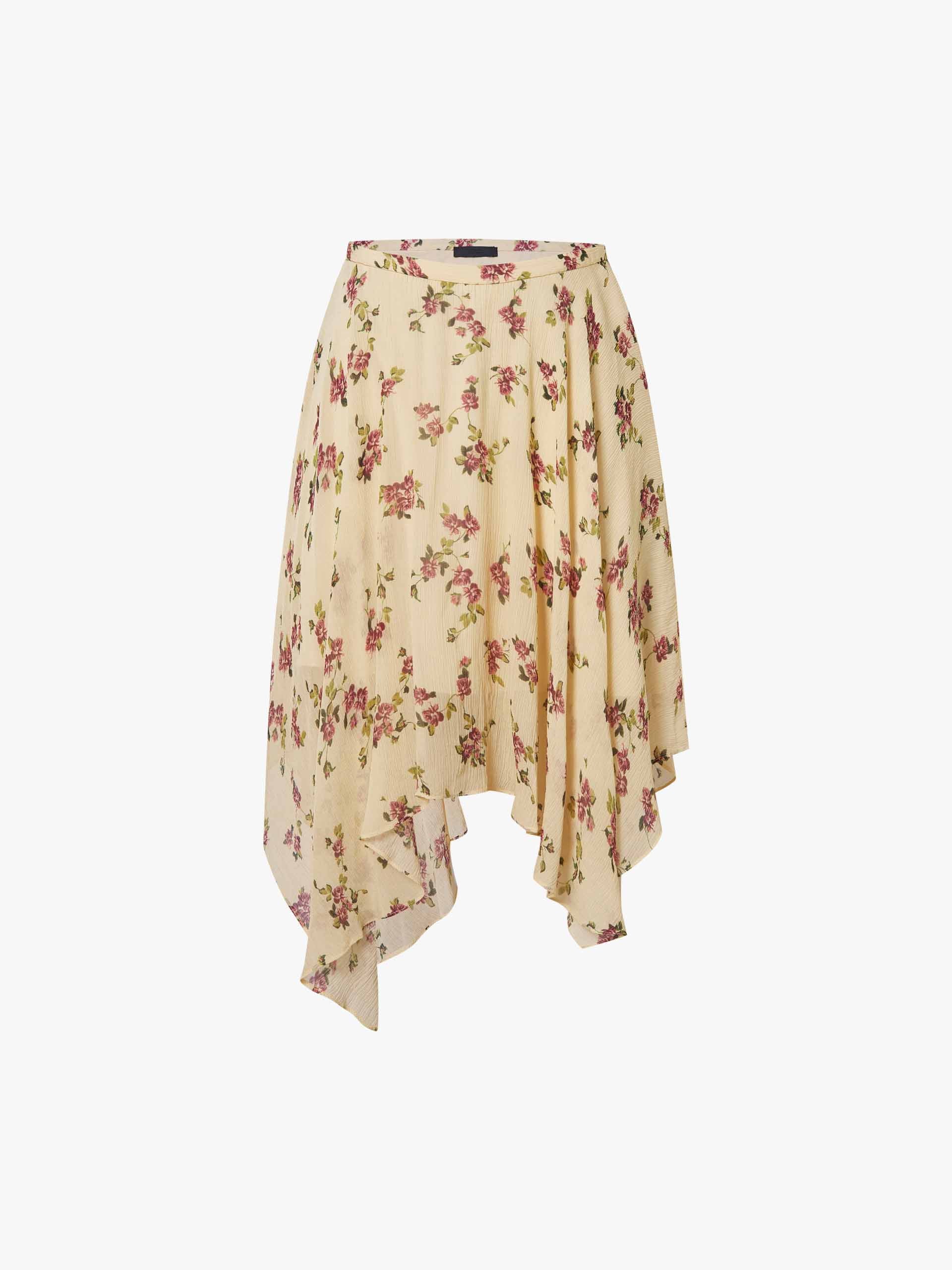 This skirt includes a lining and features an irregular hem that sways gracefully with movement. The full floral pattern design is fresh and bright, like a spring garden in bloom. Perfect for dates or getaways, it pairs easily with solid‑color tops and woven accessories to create a romantic, lightweight spring look.