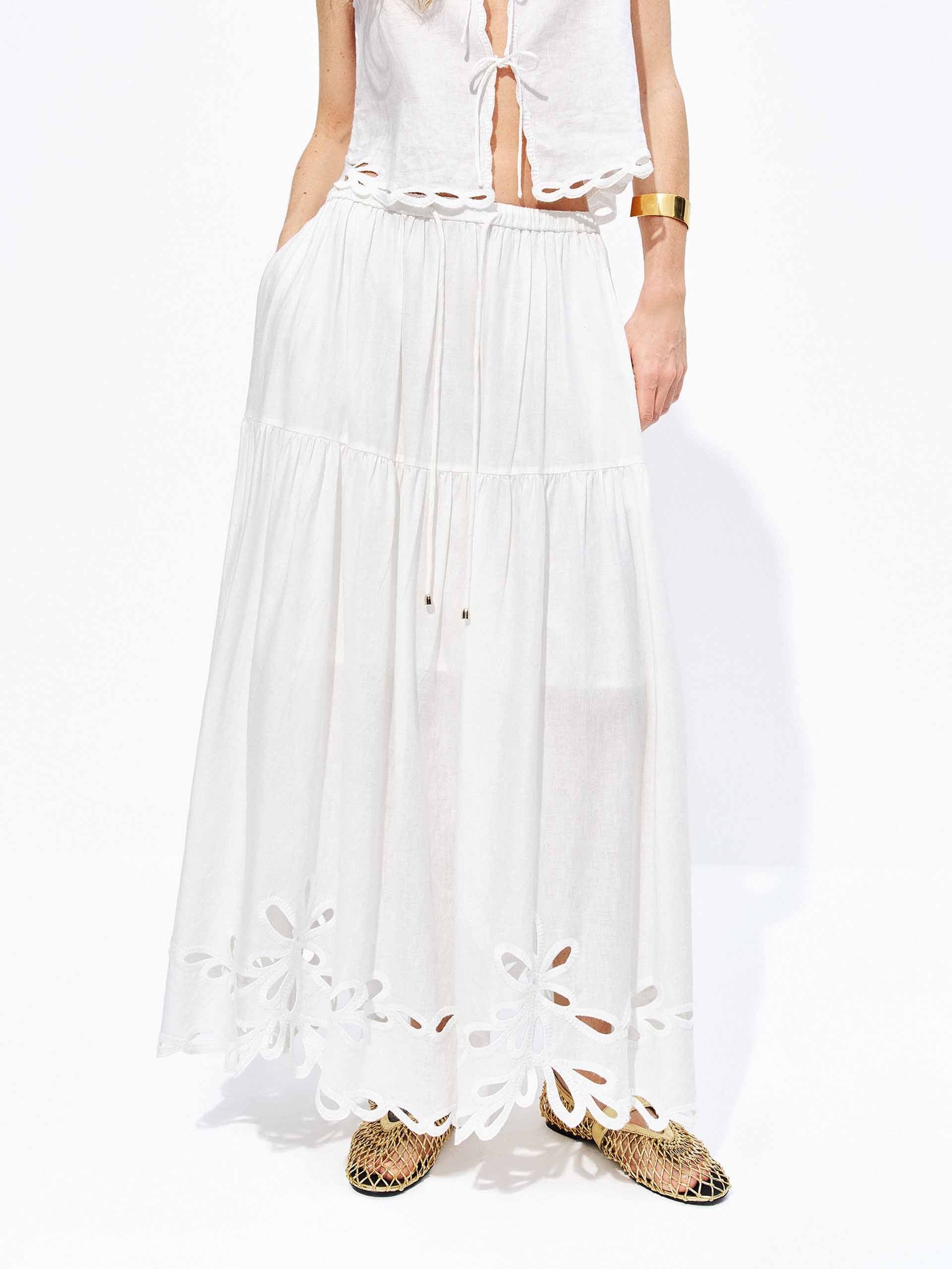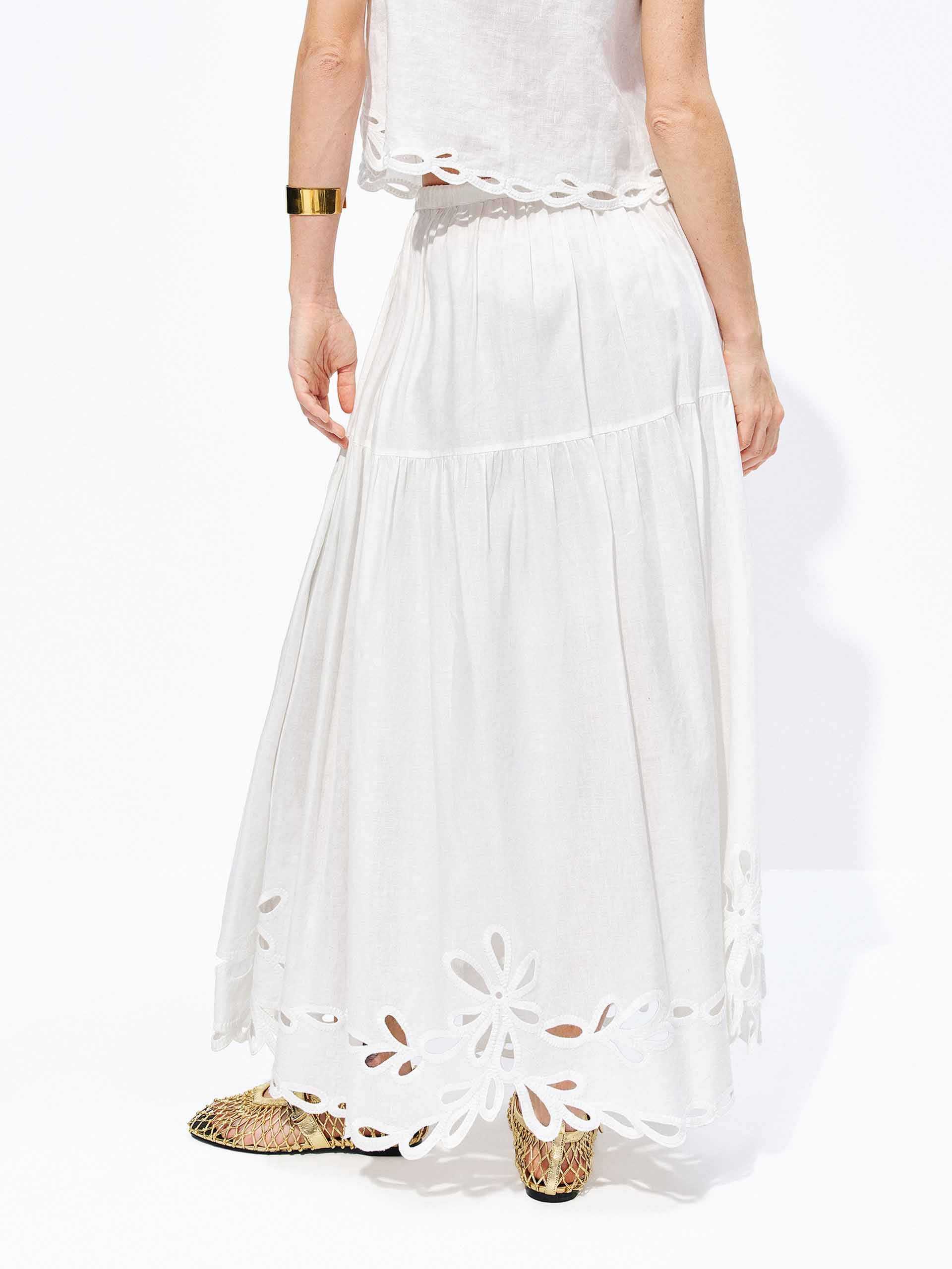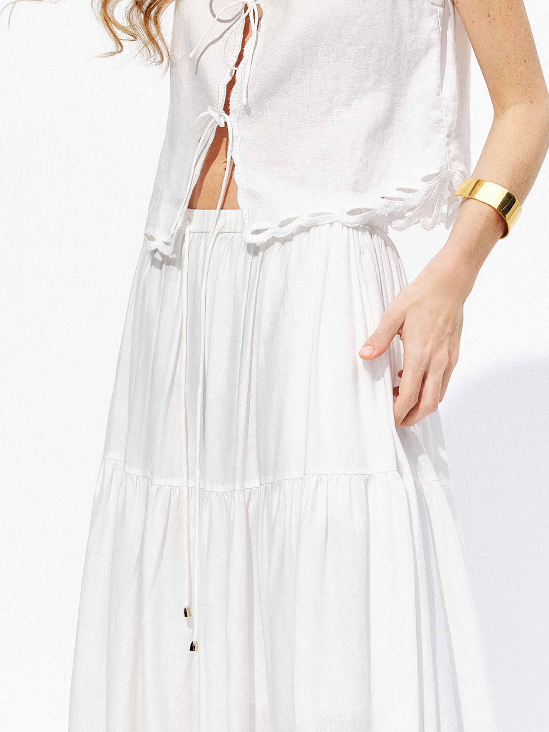 A study in movement and texture. Crafted from a comfortable linen-cotton blend in a fresh white hue, this maxi skirt is designed with a flowy, voluminous silhouette. It features an elasticated waistband for ease of wear and is detailed with soft ruched pleats that create fluid drapes. The bottom is finished with delicate broderie anglaise for a subtle textured contrast. Style it with the coordinating vest for a complete, monochromatic look.