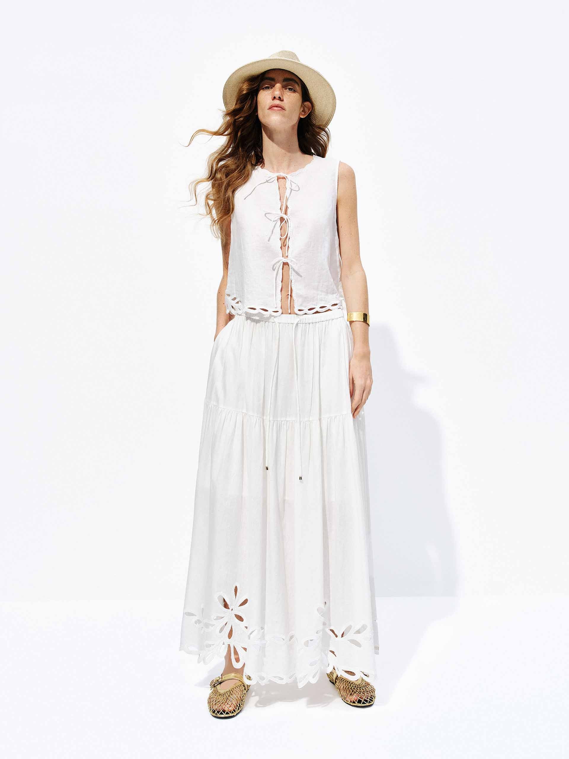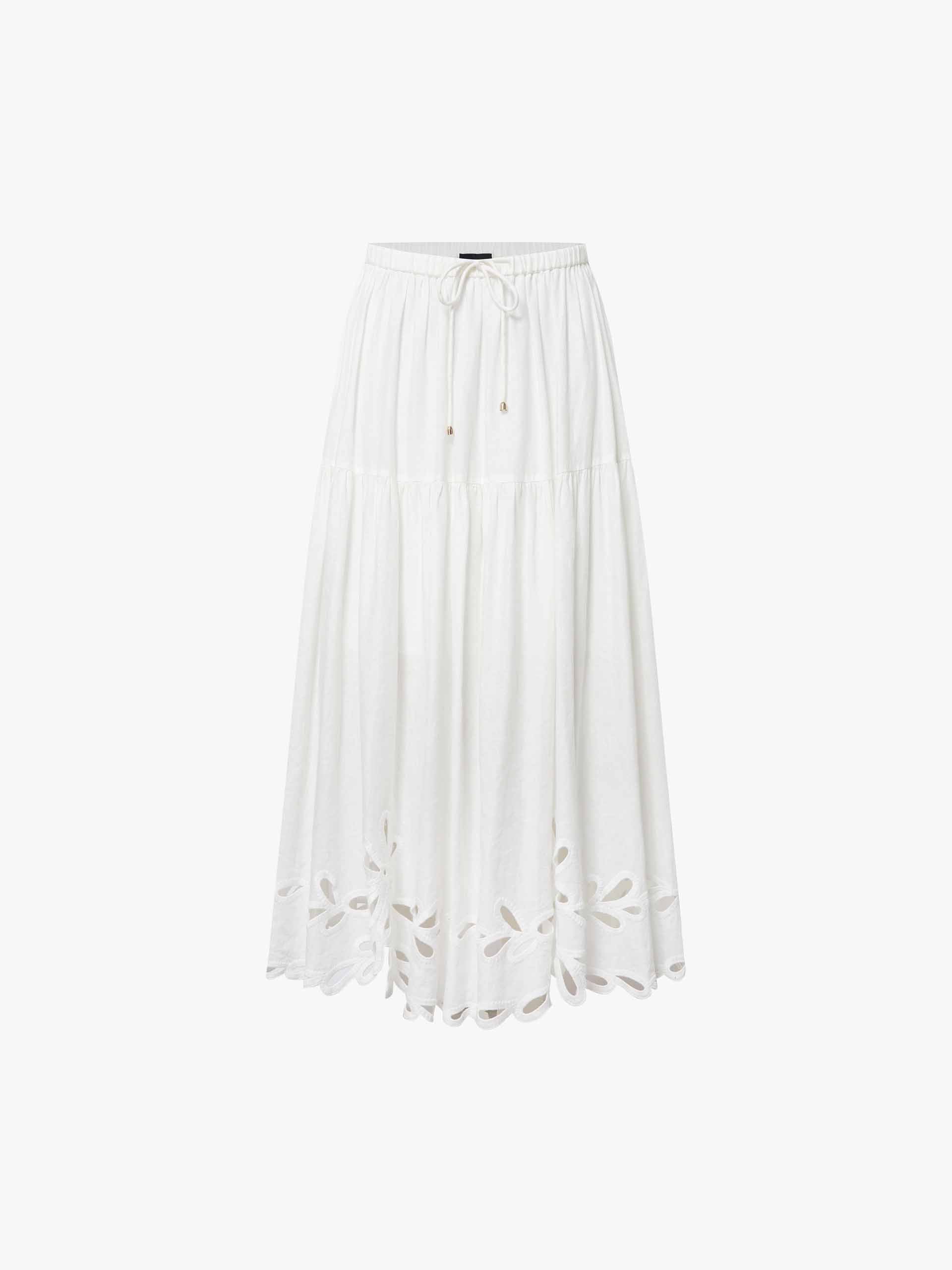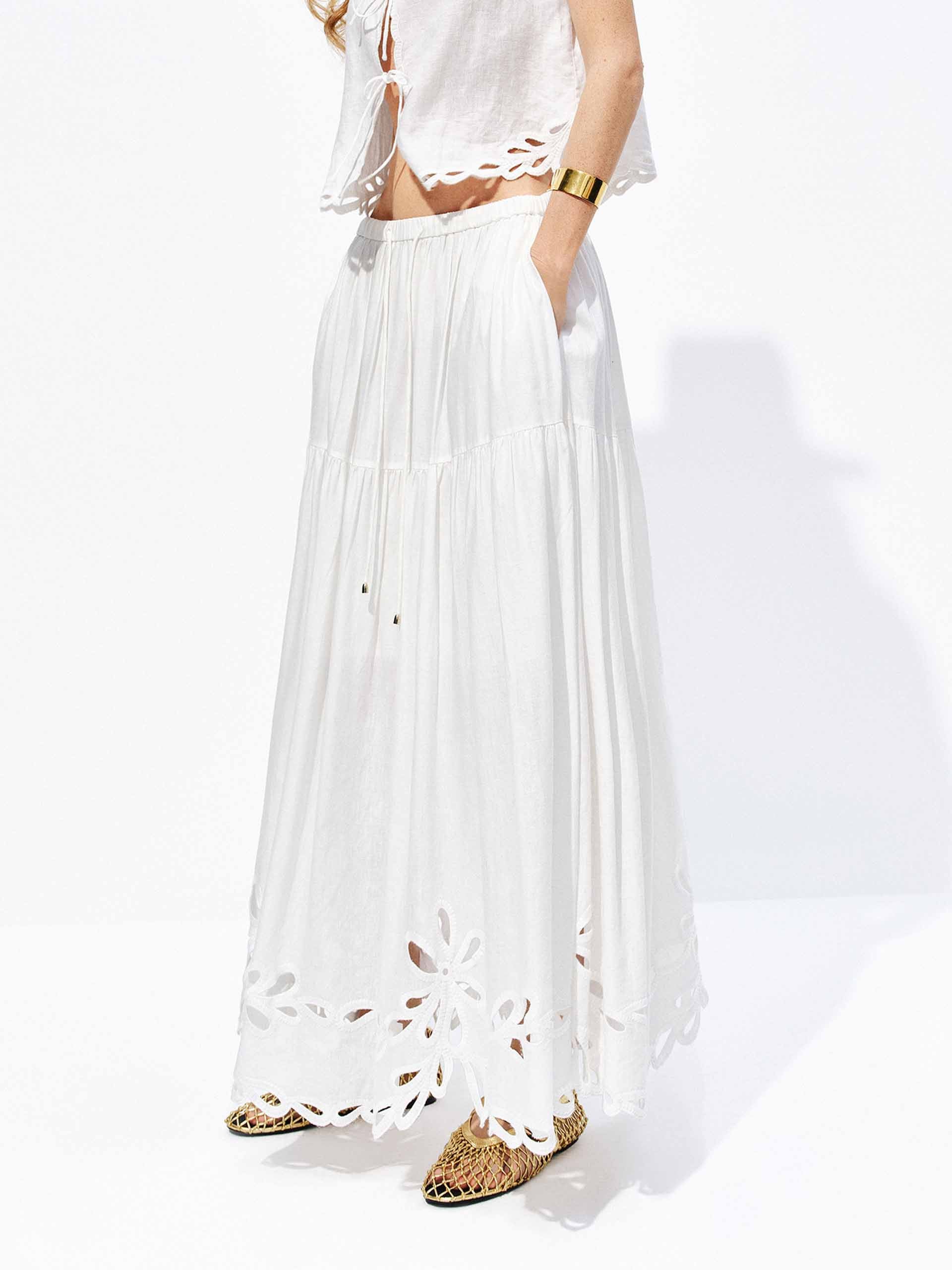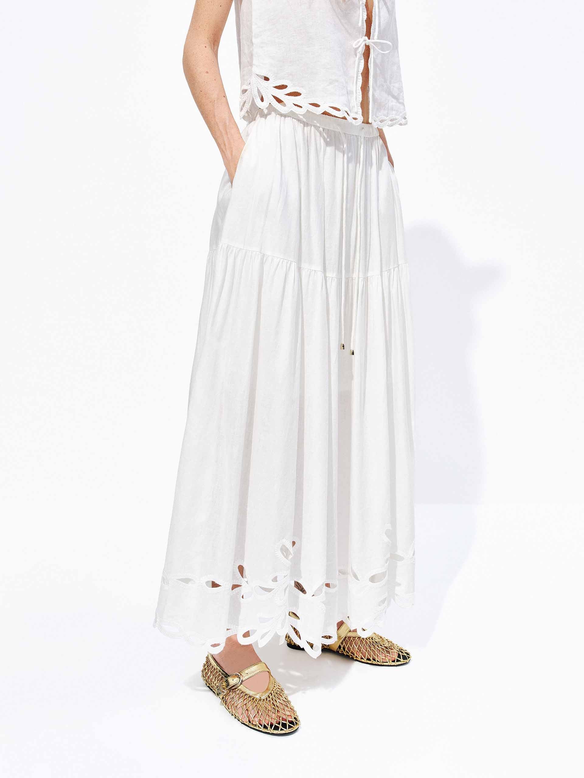 A study in movement and texture. Crafted from a comfortable linen-cotton blend in a fresh white hue, this maxi skirt is designed with a flowy, voluminous silhouette. It features an elasticated waistband for ease of wear and is detailed with soft ruched pleats that create fluid drapes. The bottom is finished with delicate broderie anglaise for a subtle textured contrast. Style it with the coordinating vest for a complete, monochromatic look.