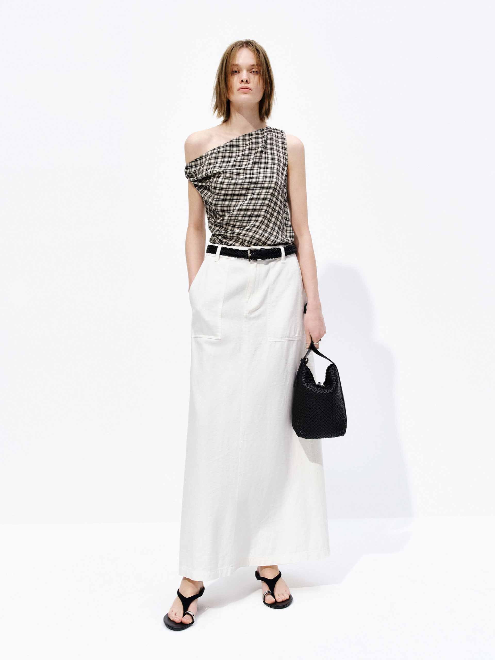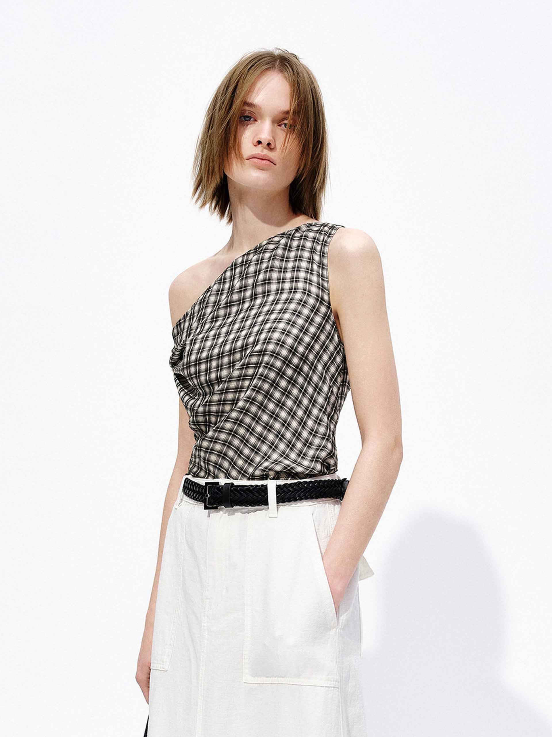 Cut from a soft-handle fabric, this cropped top offers a modern take on asymmetric design. It features a striking one-shoulder neckline and is detailed with side ruching that creates soft gathers across the body. Complete with a discreet side zip for a clean finish. Style it with crisp white jeans or tailored shorts to balance the patterned fabric.