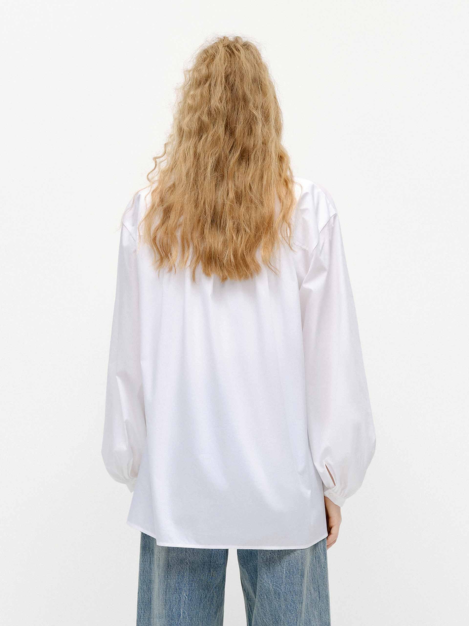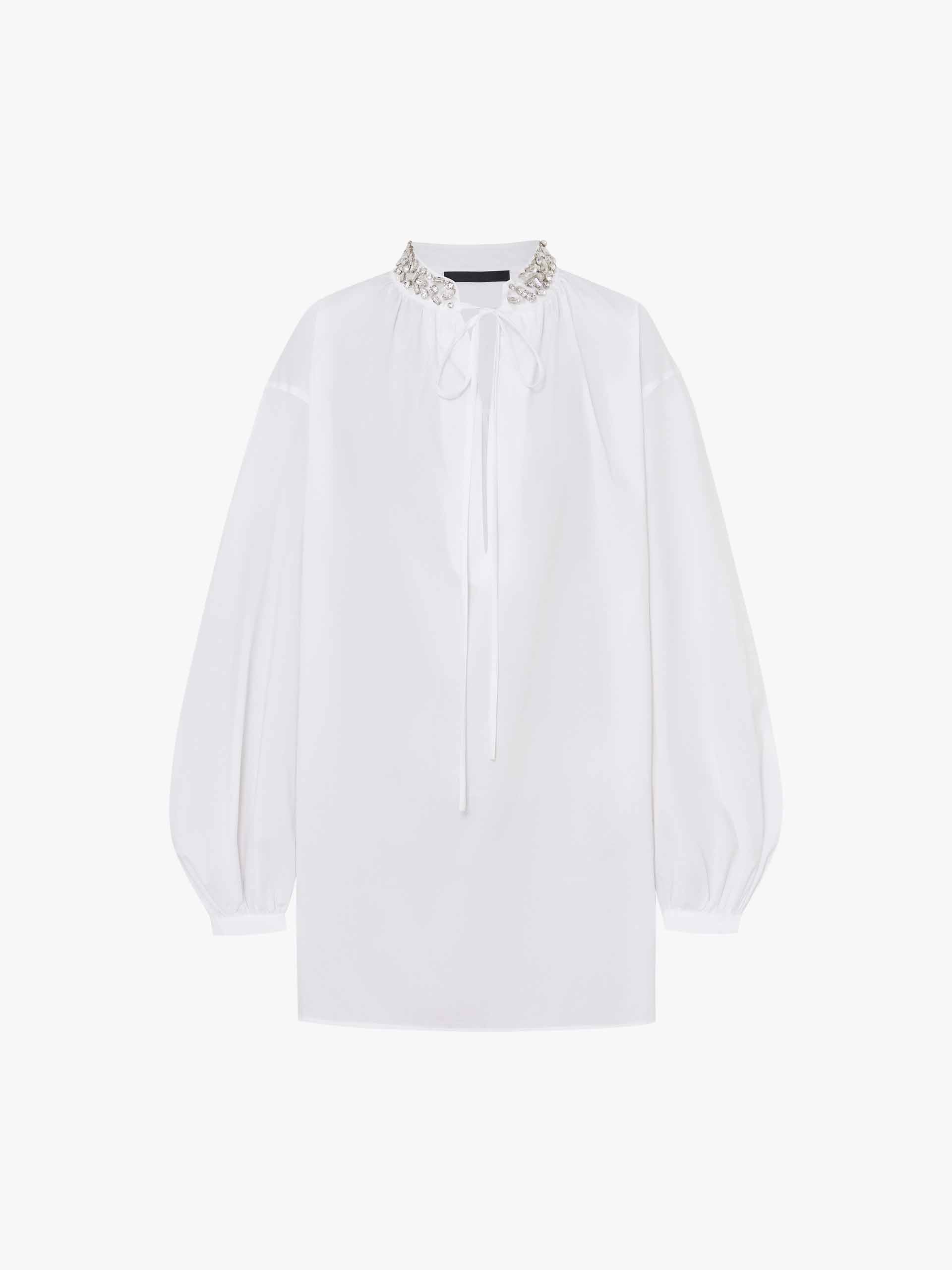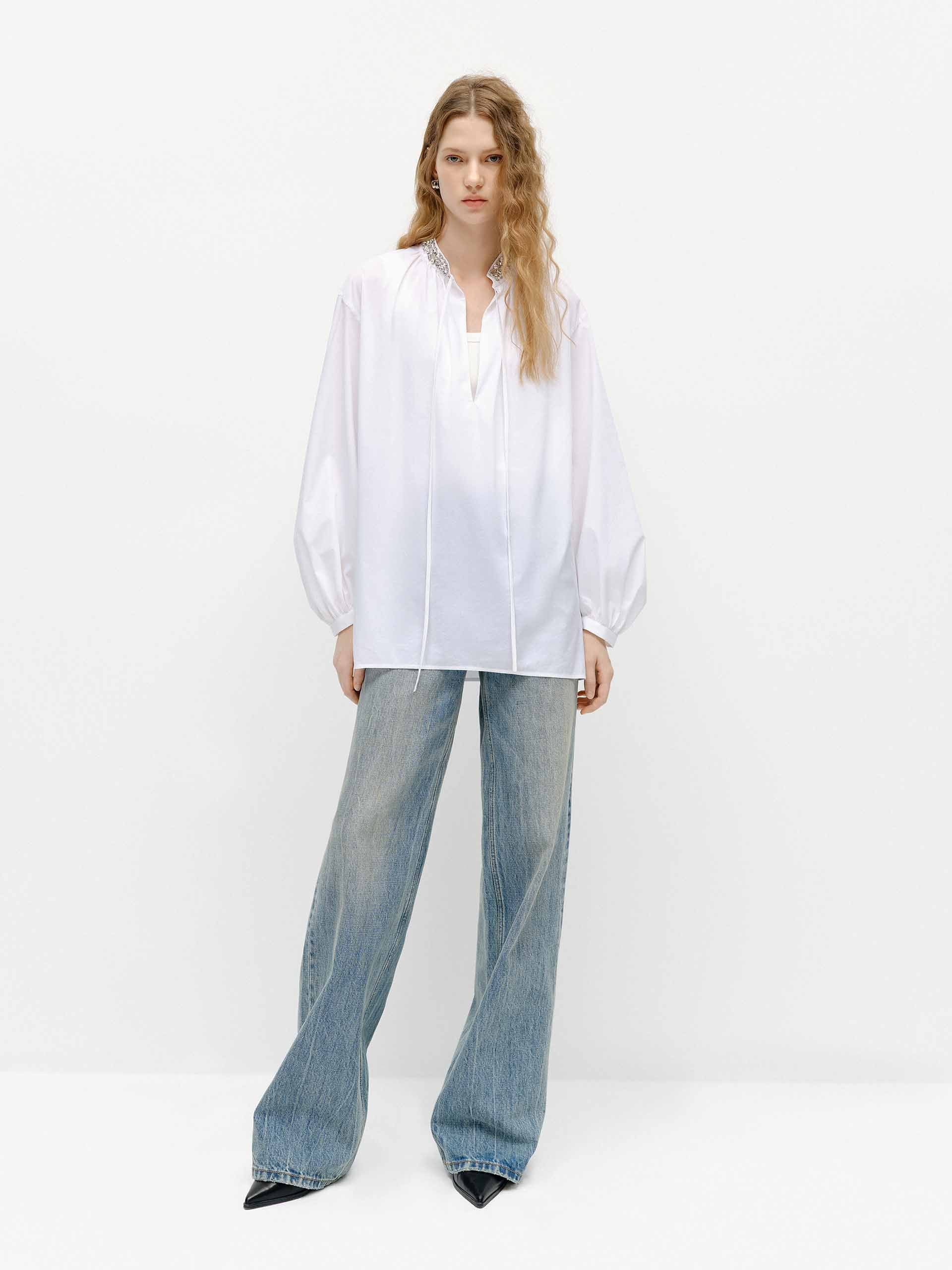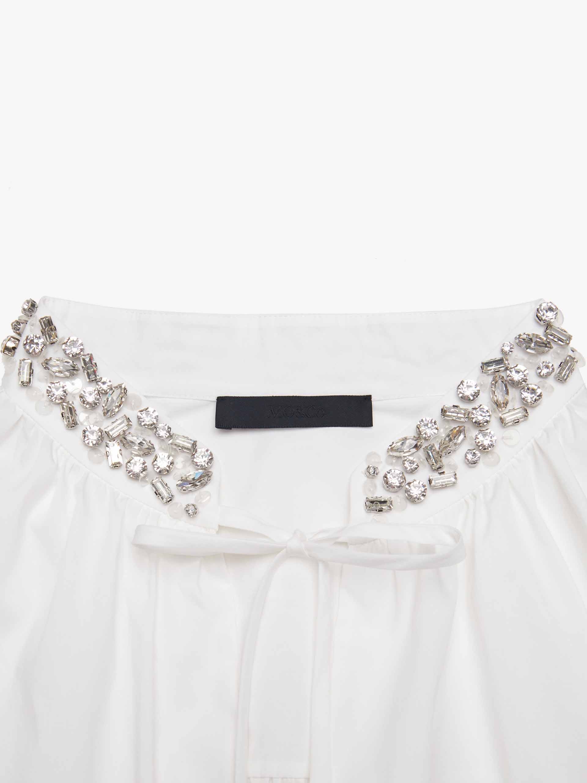 Expertly crafted from a comfortable cotton blend, this blouse features a relaxed shape, volume sleeves, back gathering, and sparkling crystal decorations at the neckline.