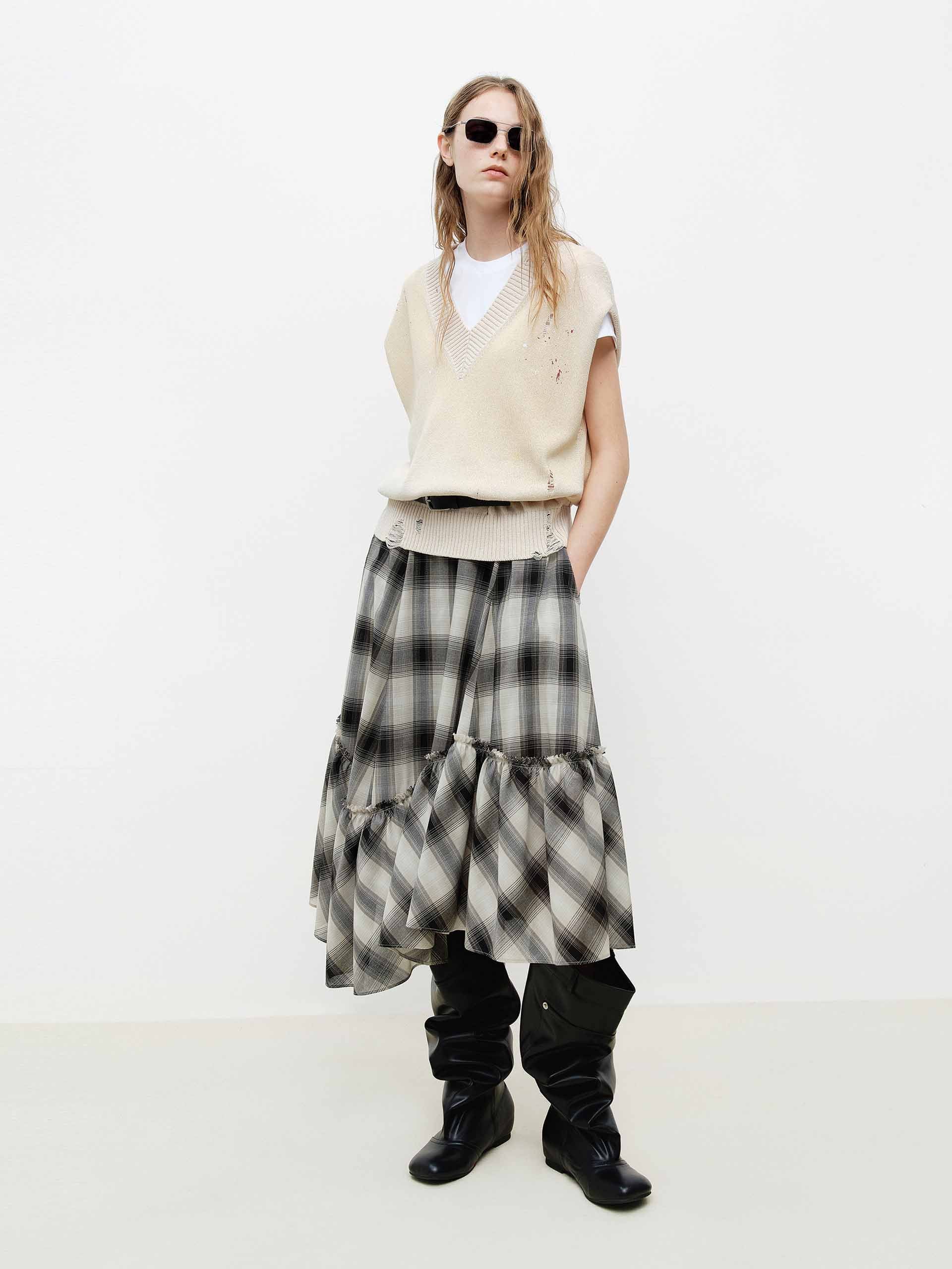 This skirt features a plaid pattern combined with an irregularly spliced hem, breaking away from convention. Side pockets offer both practicality and stylistic layering. Crafted from a soft, skin-friendly wool-blend fabric with excellent drape, the skirt moves beautifully with every step—perfect for spring and summer wear.