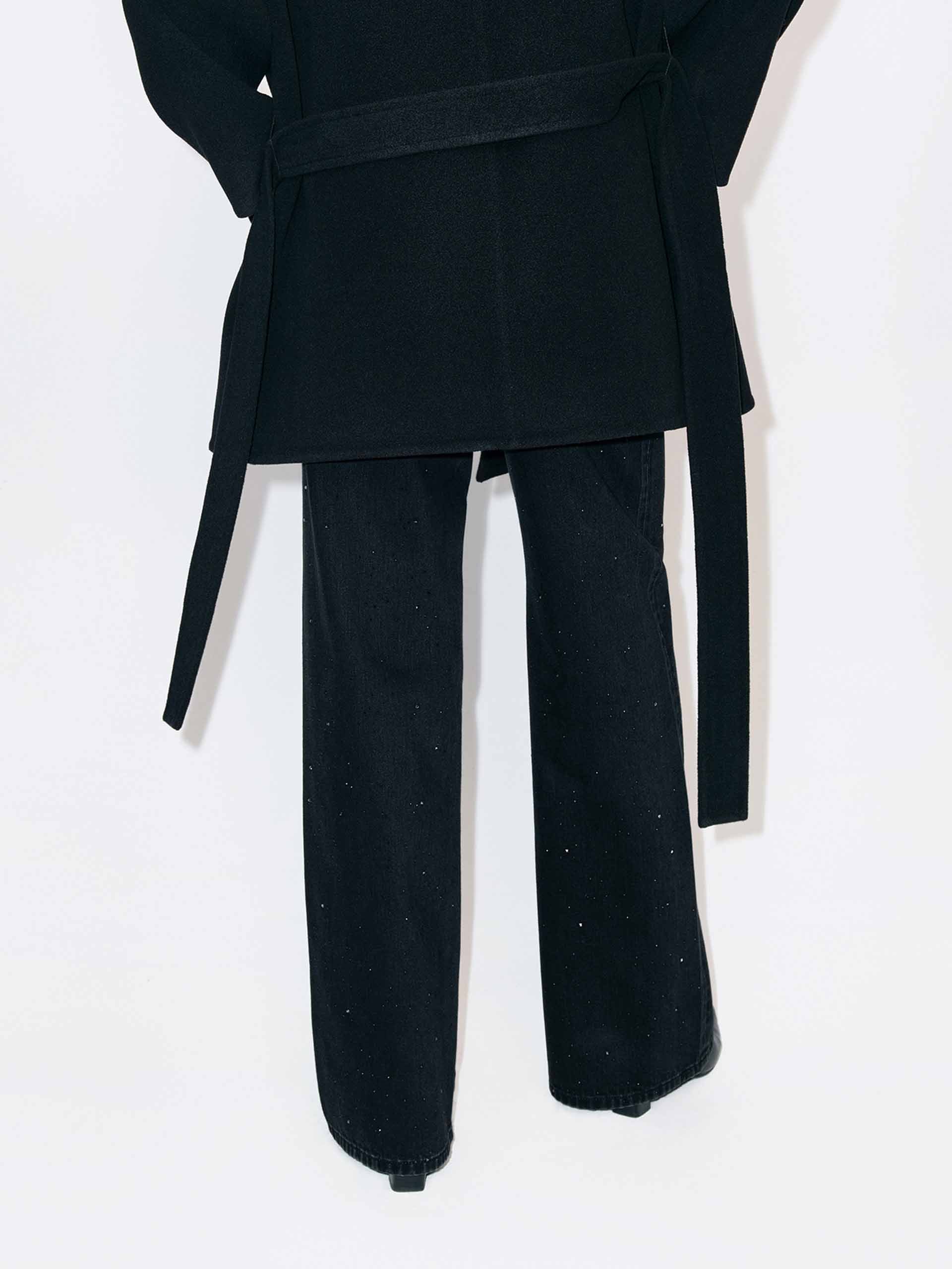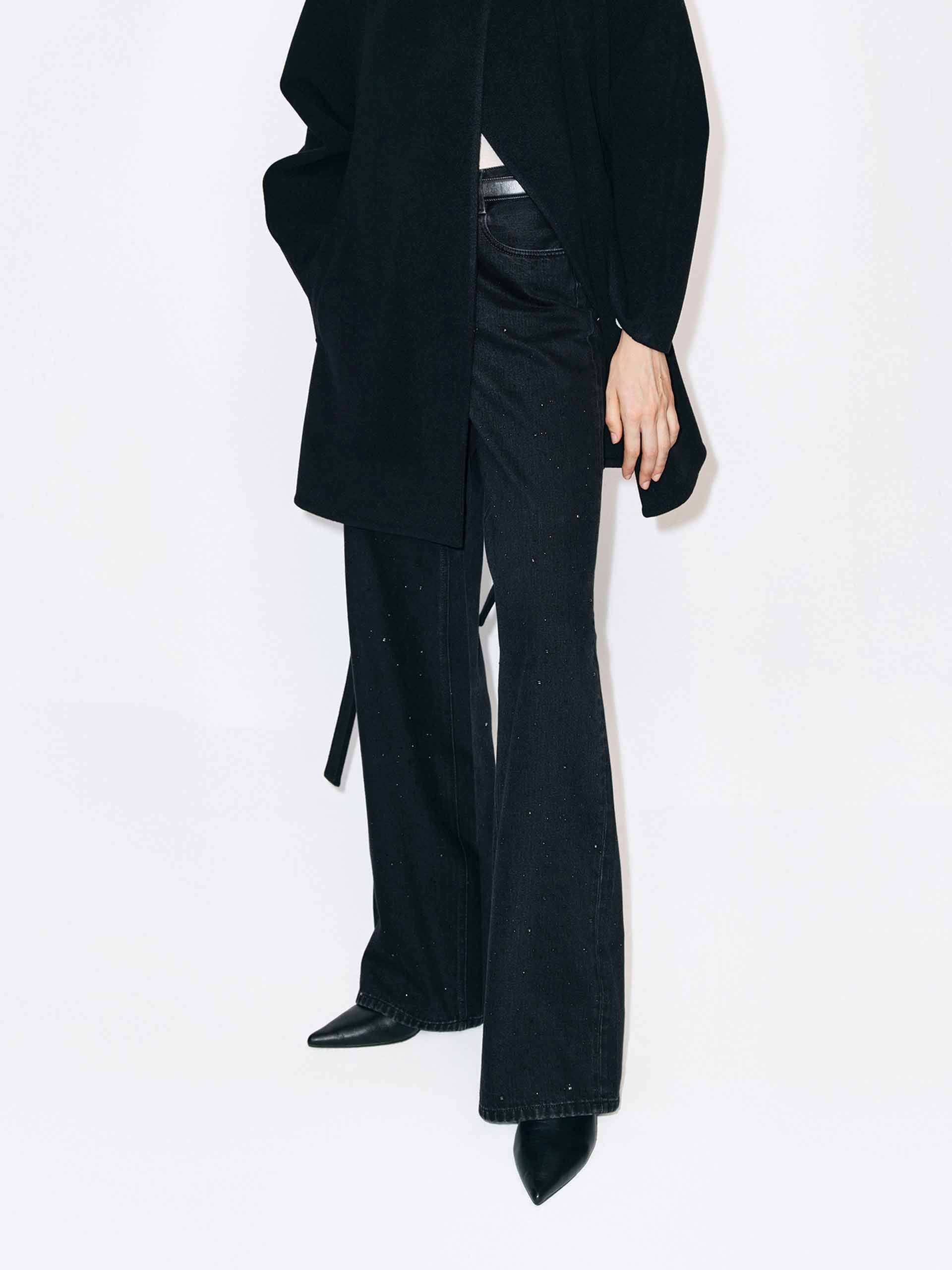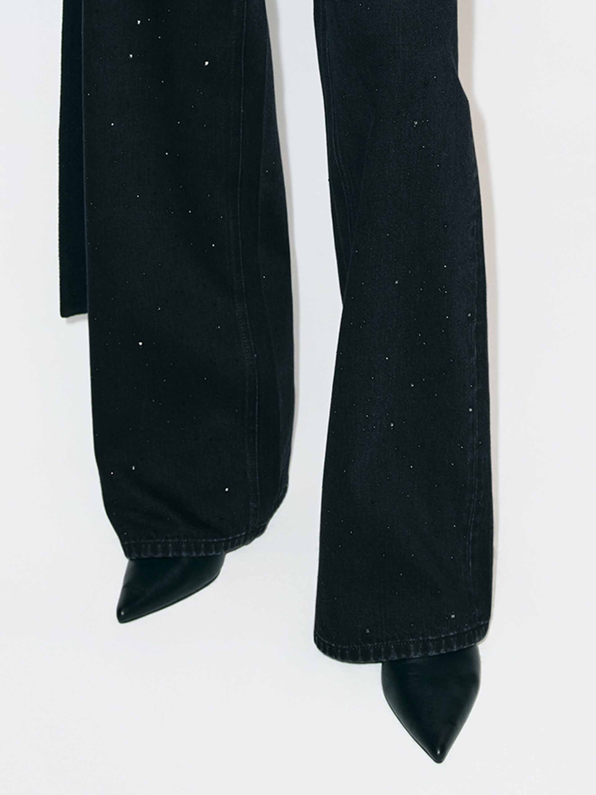 Elevate your everyday denim with these jeans, cut in a versatile regular fit that offers a clean, modern line from hip to ankle. The classic zip-button closure and five-pocket layout provide timeless functionality. Artfully applied black hotfix rhinestones create a shimmering, all-over pattern that catches the light, while the comfortable stretch fabric ensures a plush, soft-touch feel against the skin.