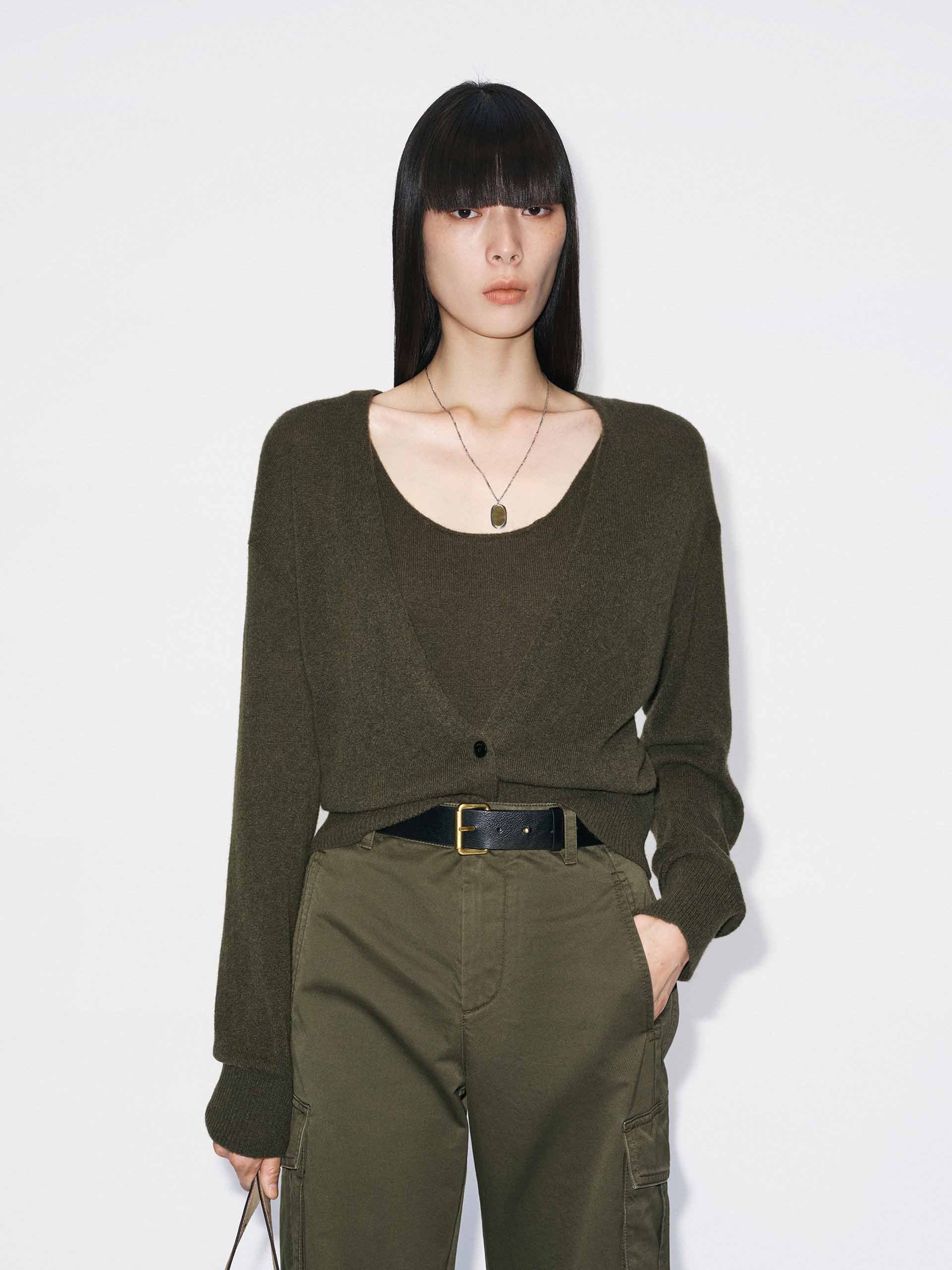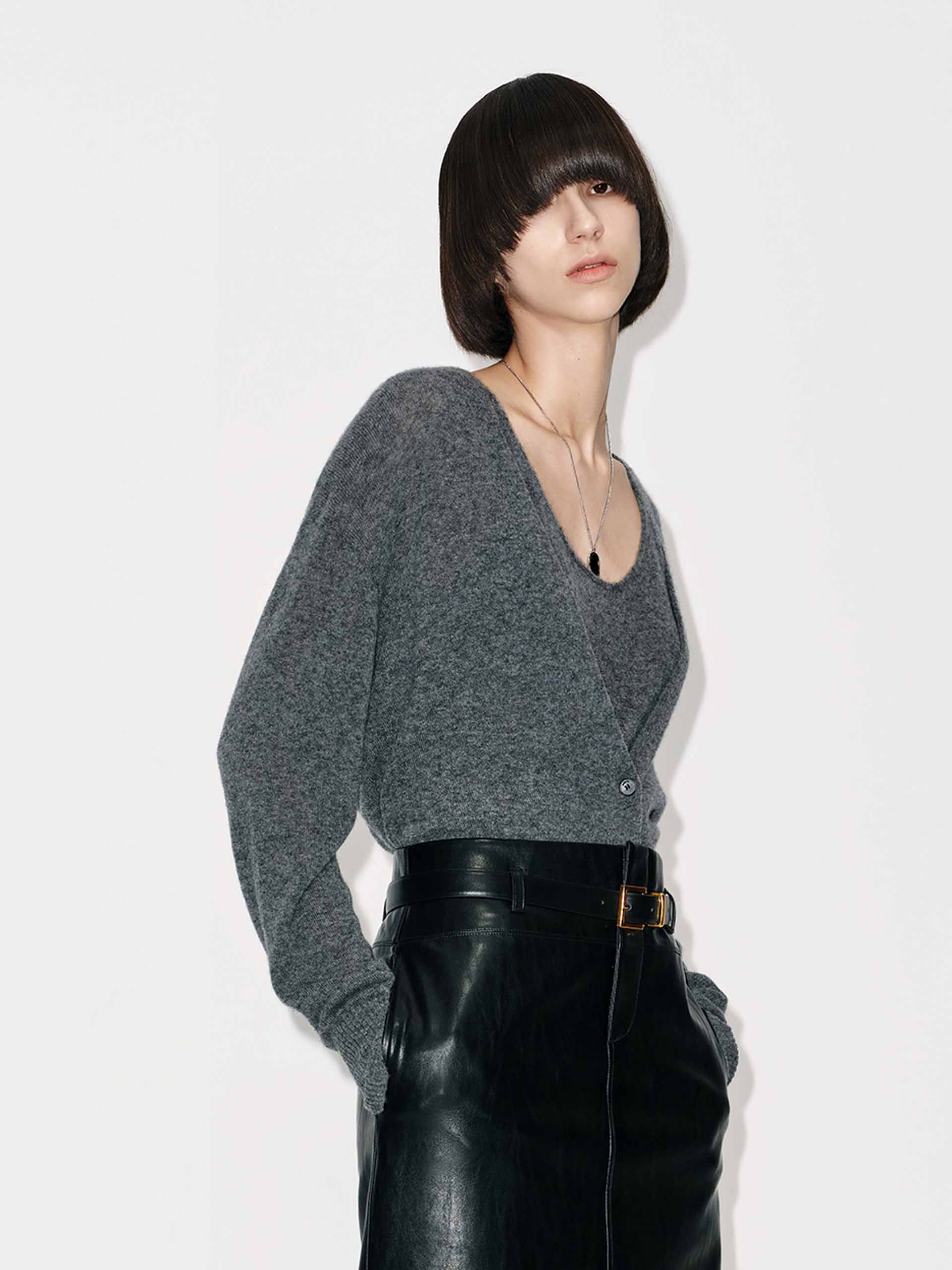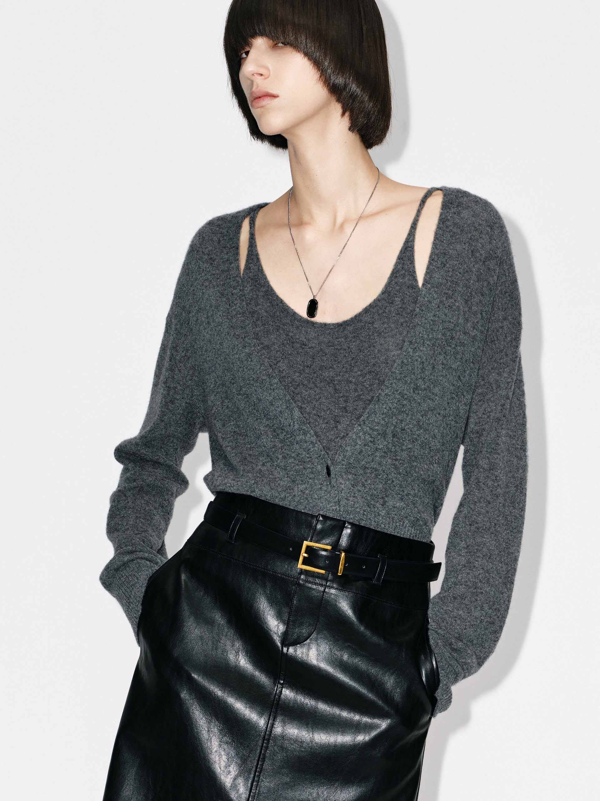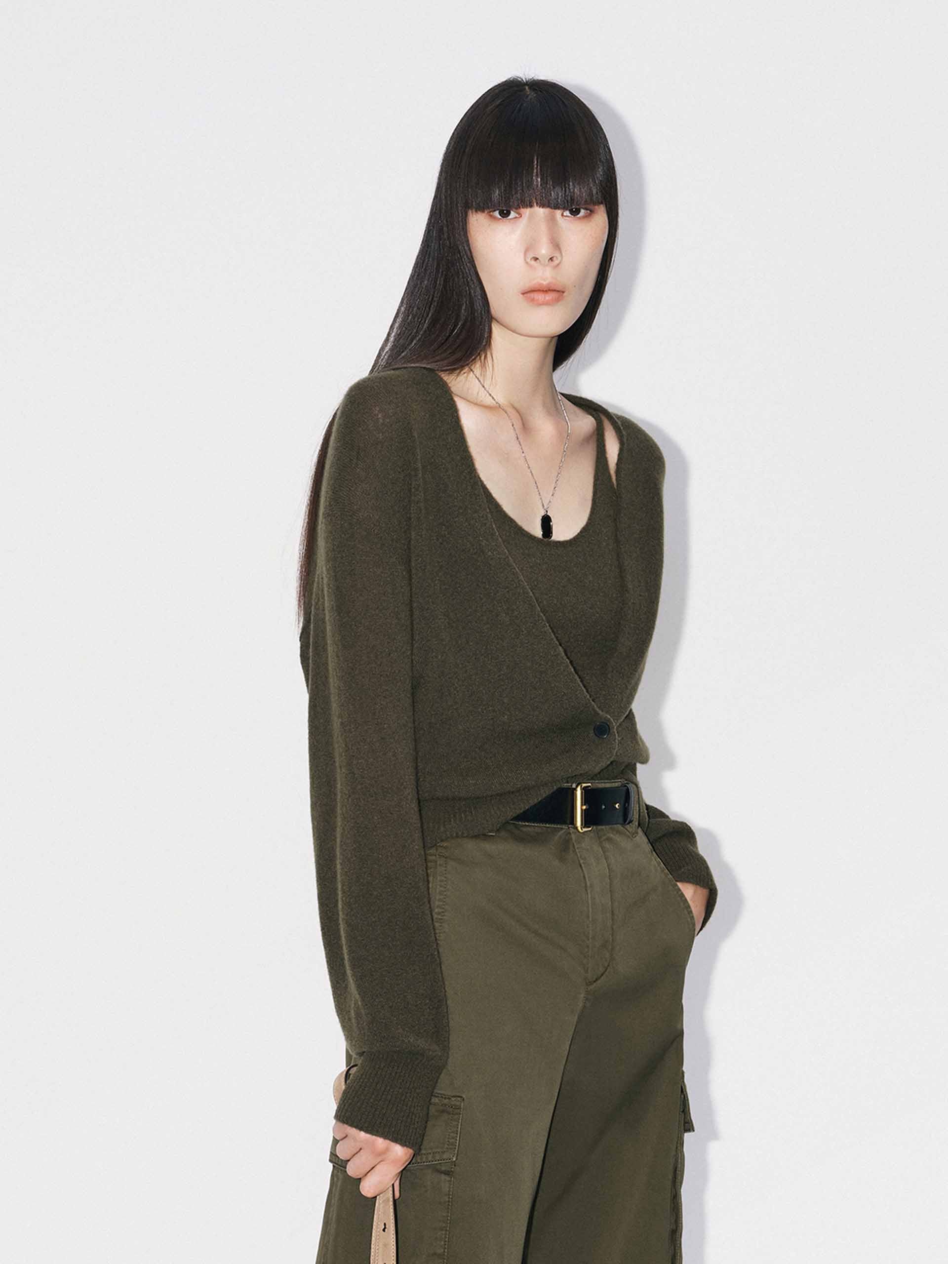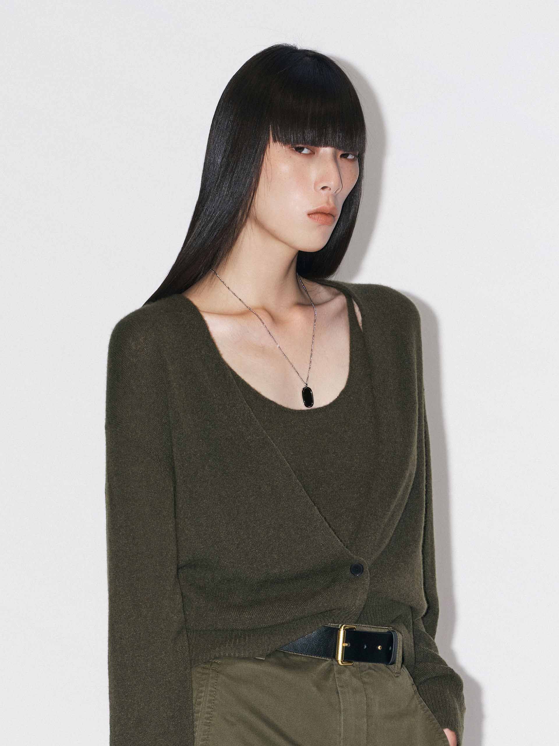 This elegant cardigan set, complete with a soft tank top, is included for effortless layered styling. The cardigan showcases a distinctive deep asymmetrical V-neckline, adding a modern and sophisticated touch, while the long sleeves and subtle ribbed hem offer a polished finish. With a convenient button-front closure, it allows for easy adjustment and a flattering drape.