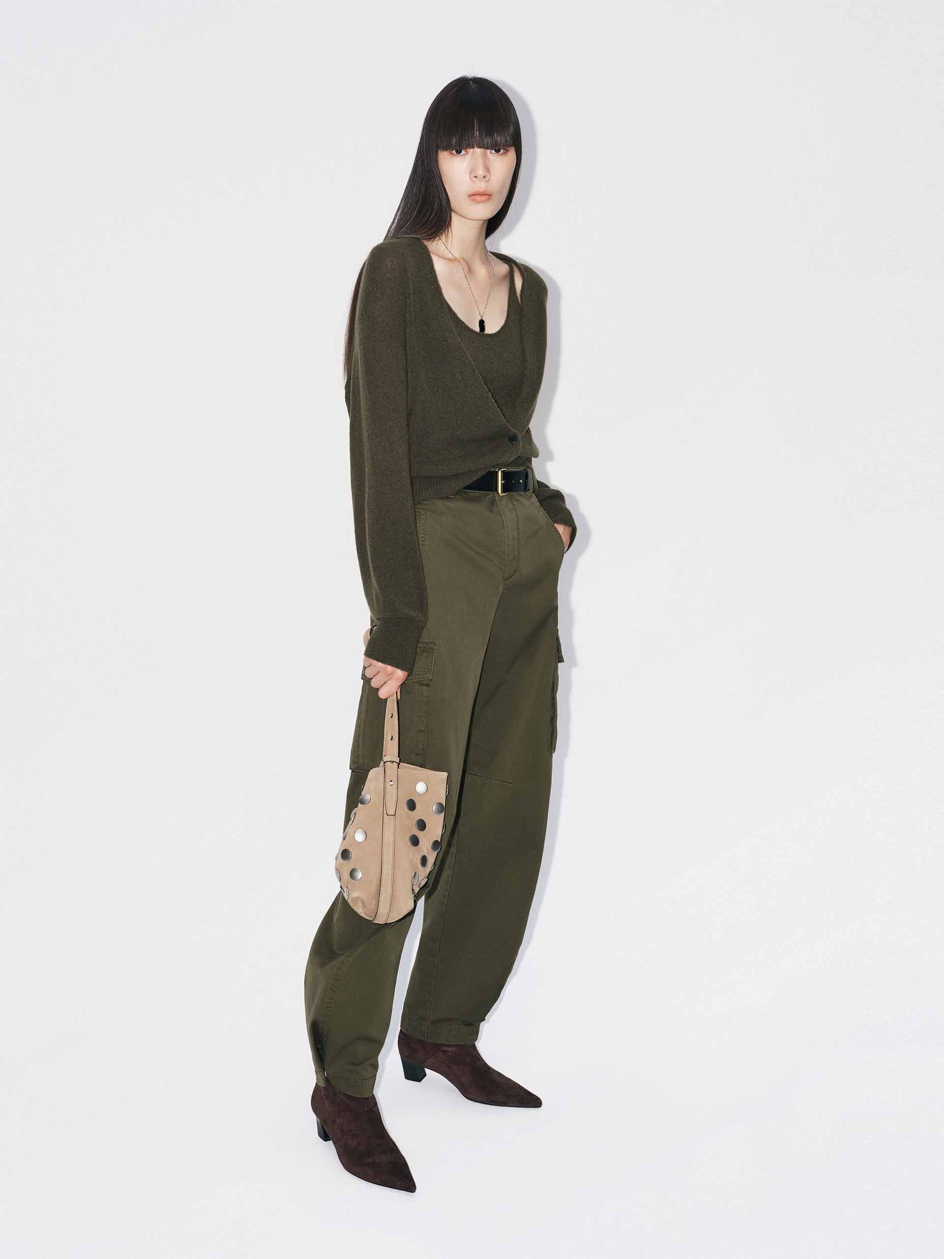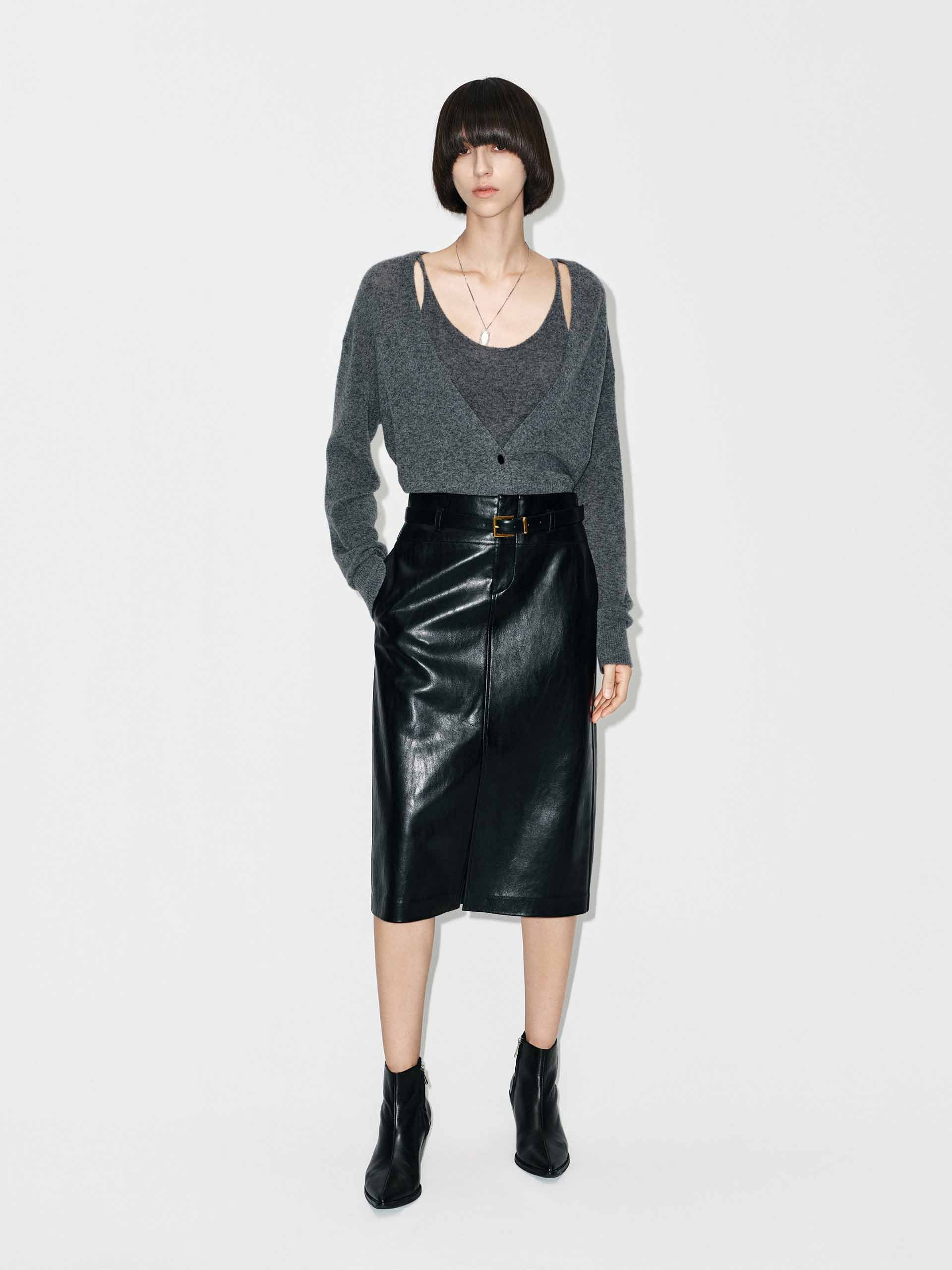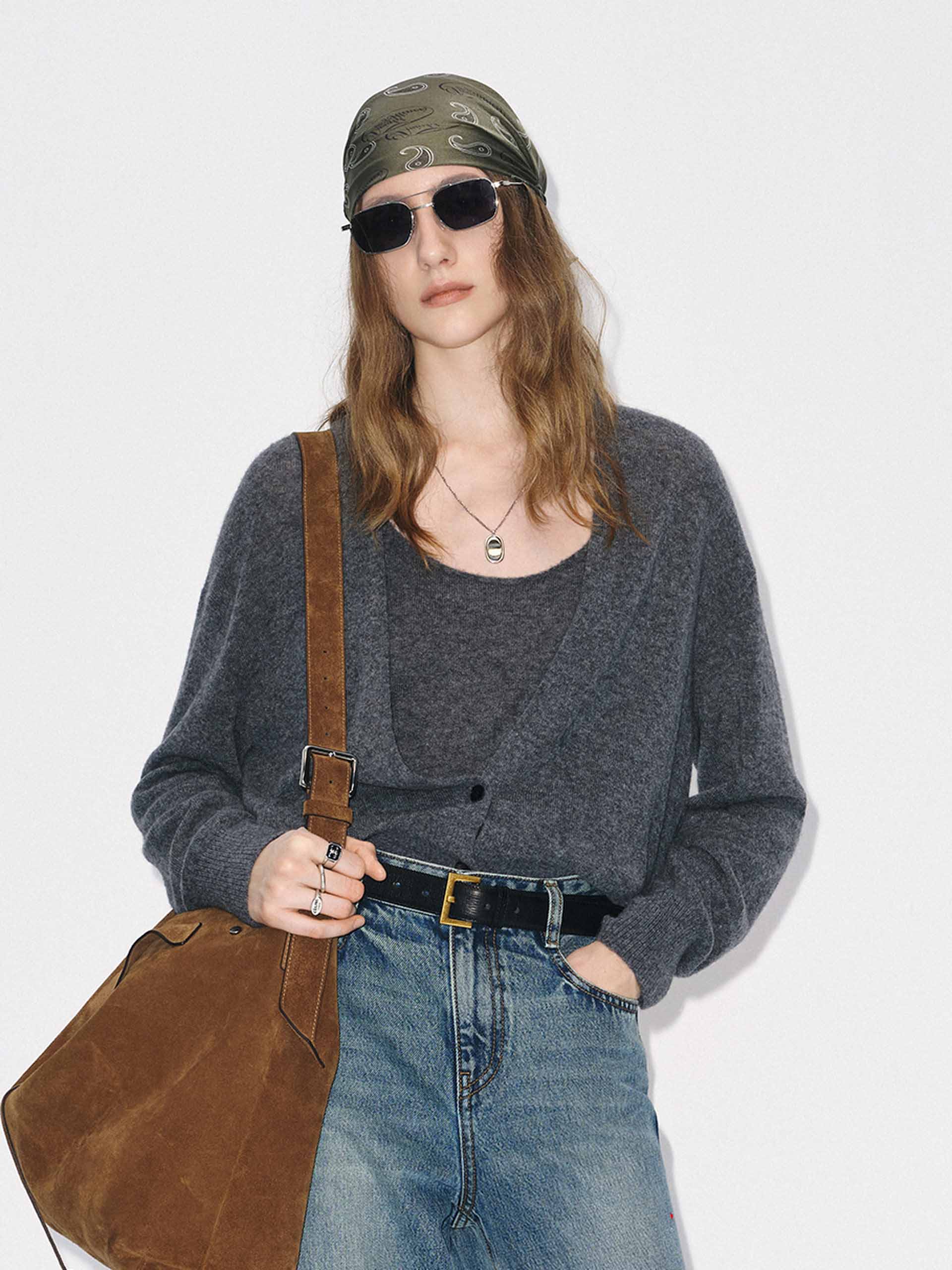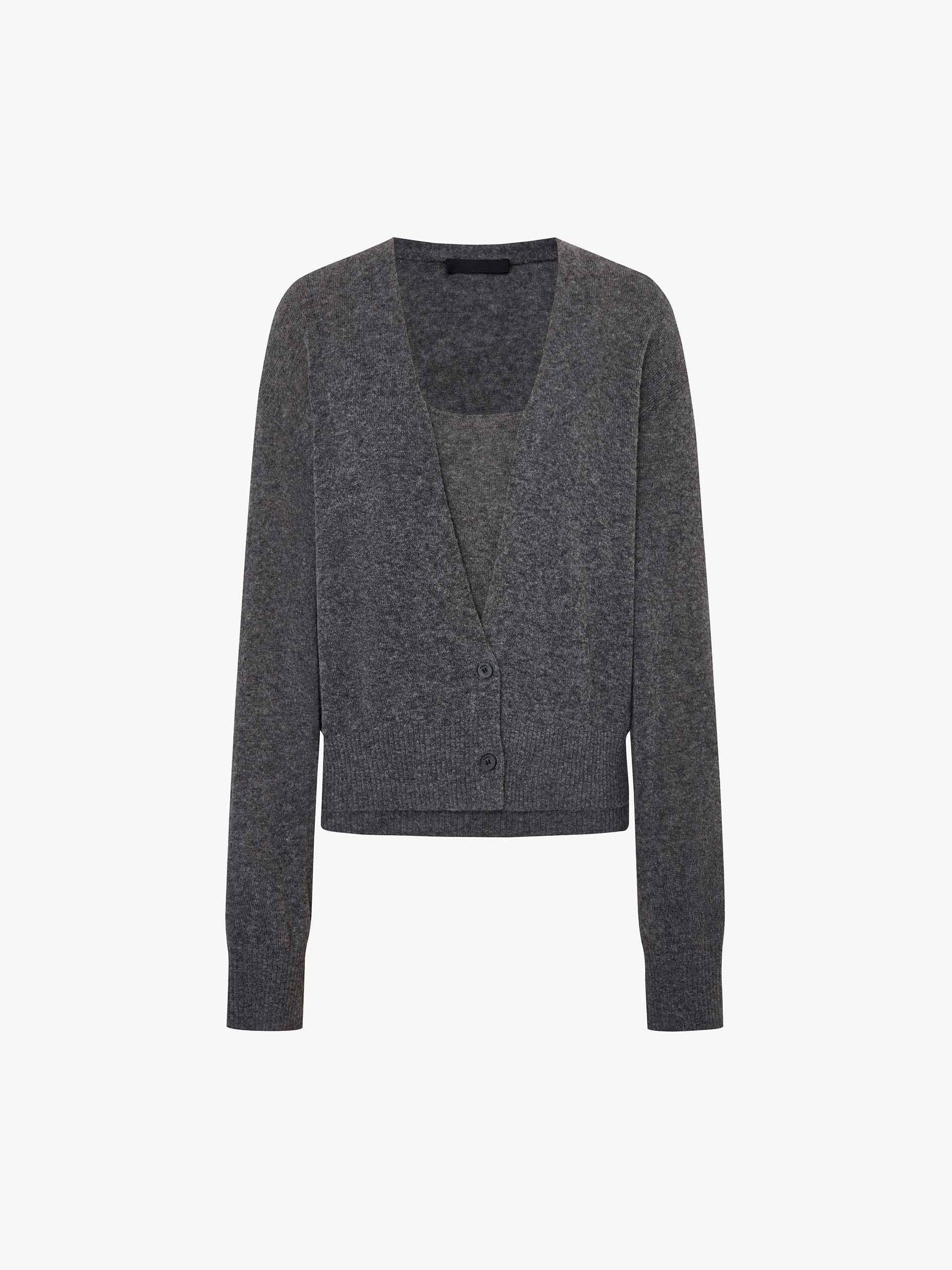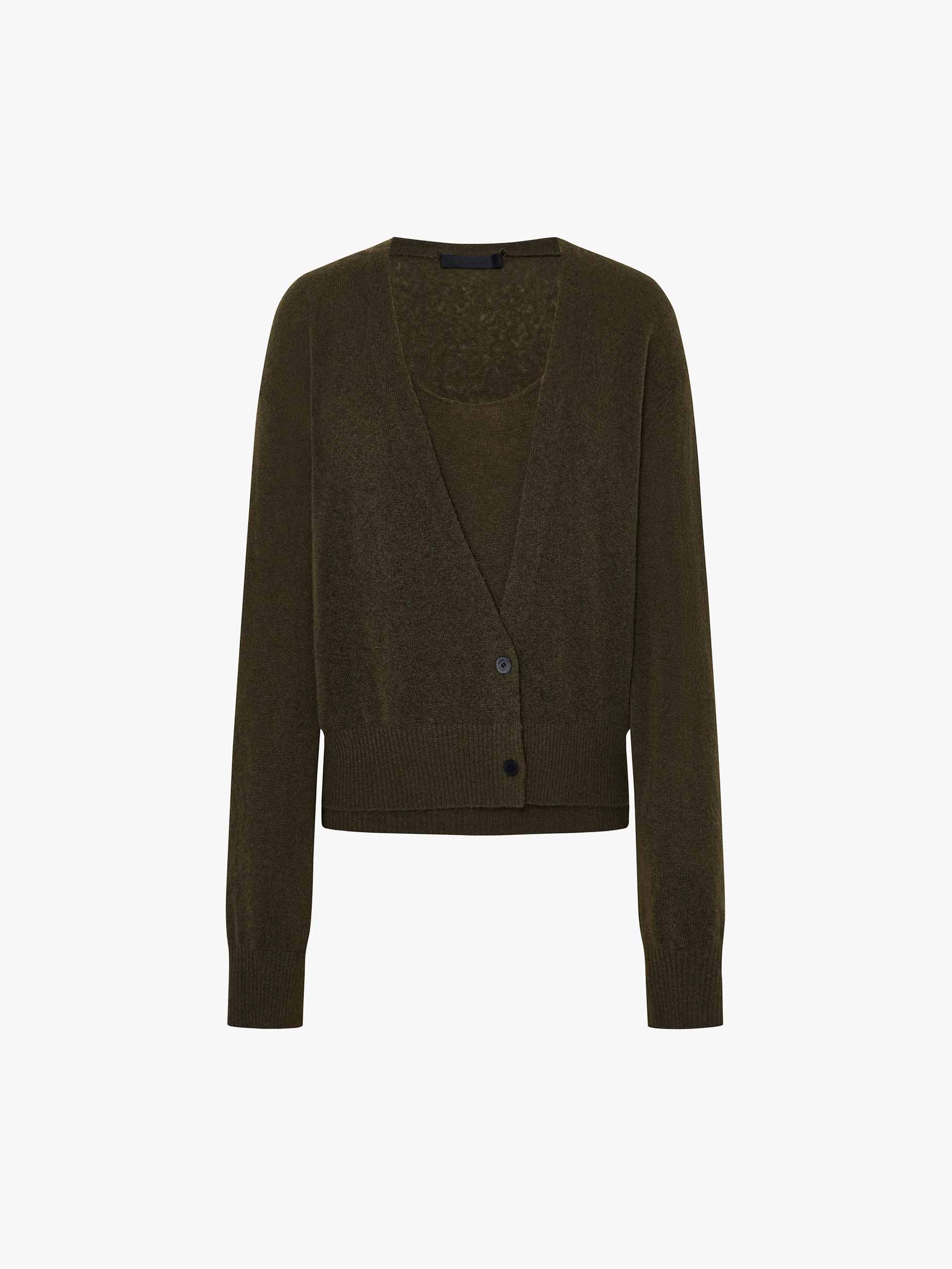 This elegant cardigan set, complete with a soft tank top, is included for effortless layered styling. The cardigan showcases a distinctive deep asymmetrical V-neckline, adding a modern and sophisticated touch, while the long sleeves and subtle ribbed hem offer a polished finish. With a convenient button-front closure, it allows for easy adjustment and a flattering drape.