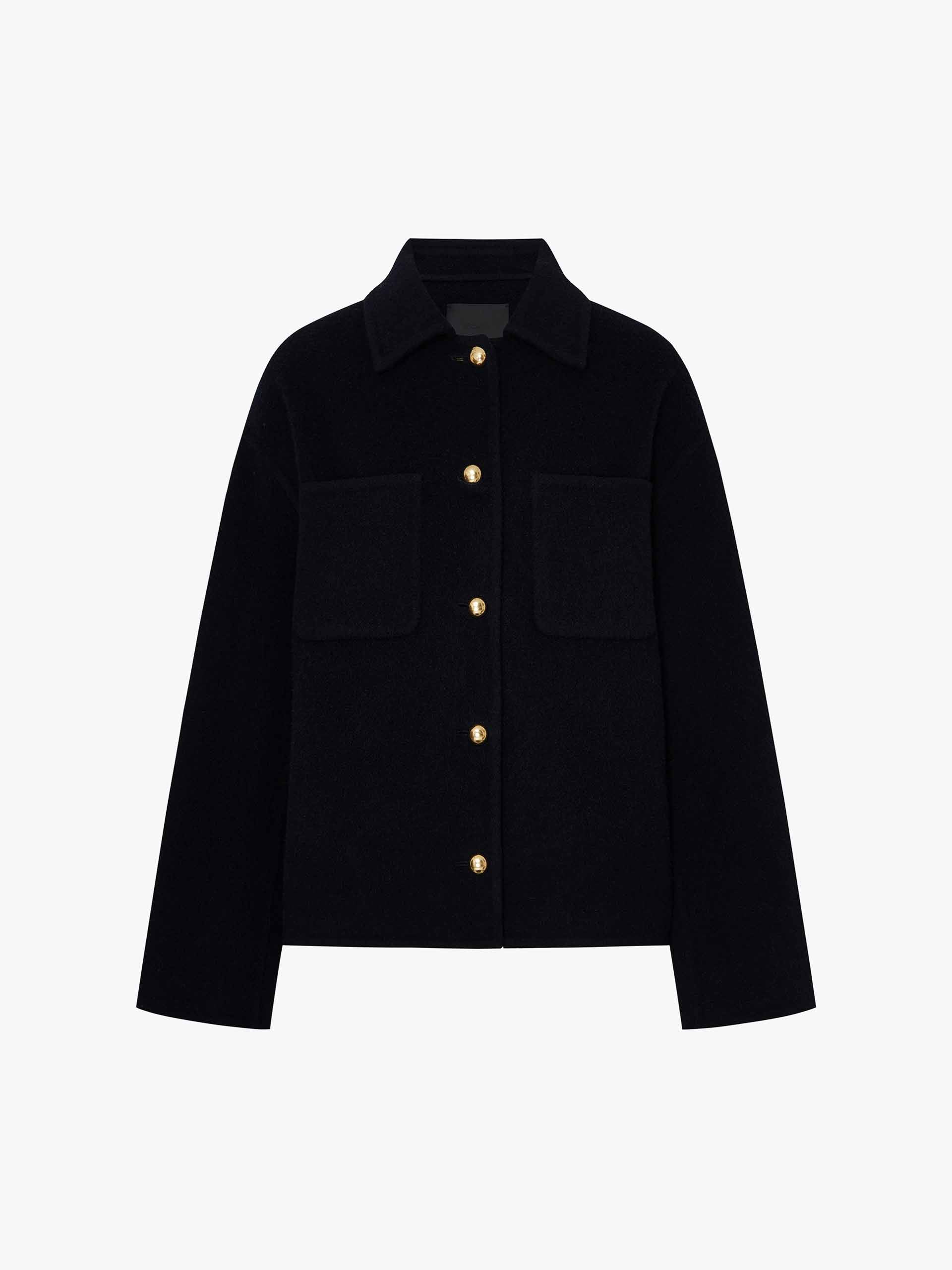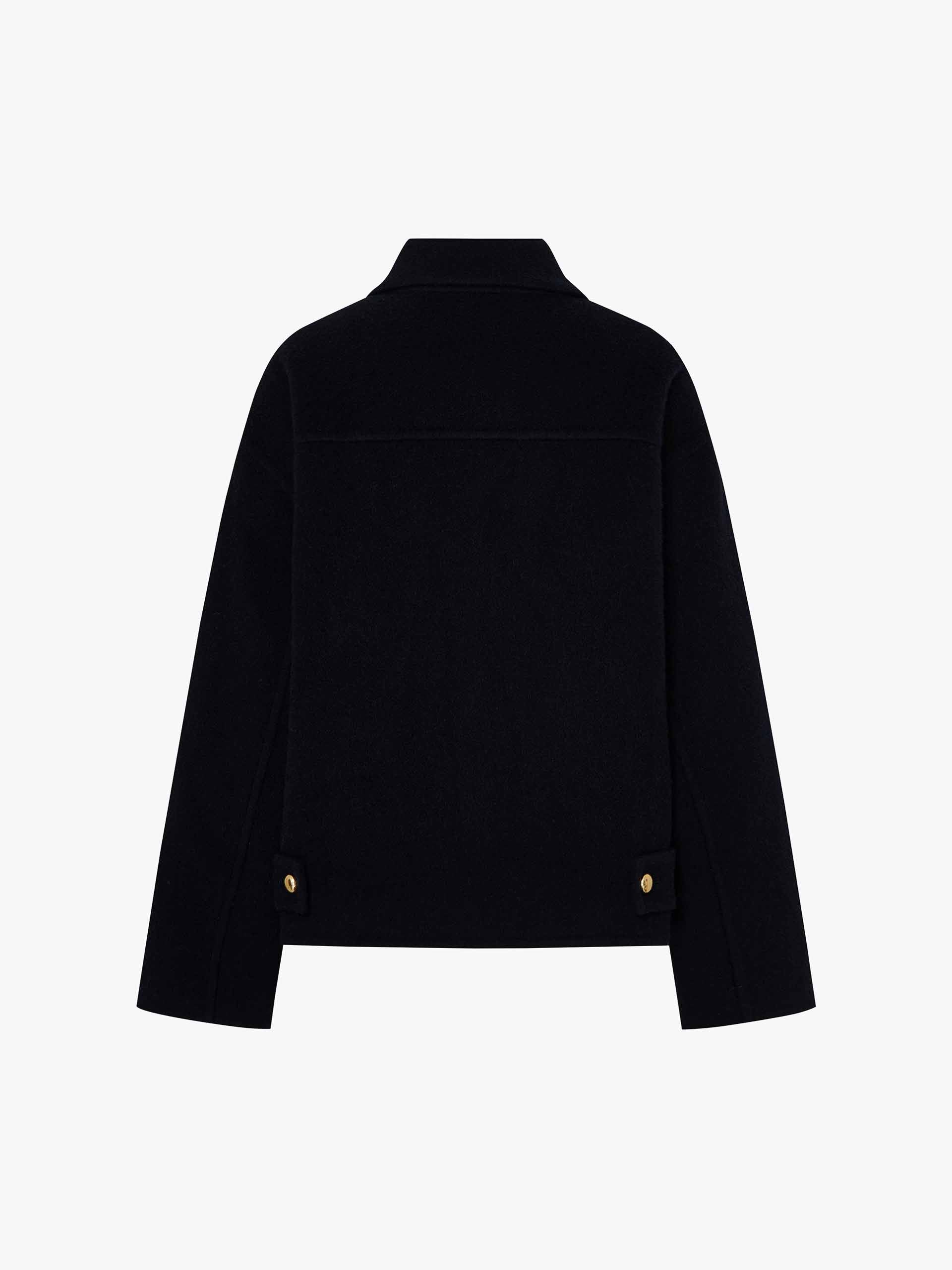 This coat combines contemporary style with timeless comfort for a truly versatile outerwear piece. The distinctive metal button closure and unique button hem design add a touch of sophisticated hardware detail. Finished with practical chest pockets, this coat is crafted from a premium wool blend, offering luxurious warmth and a soft, comfortable feel for enduring style and quality.