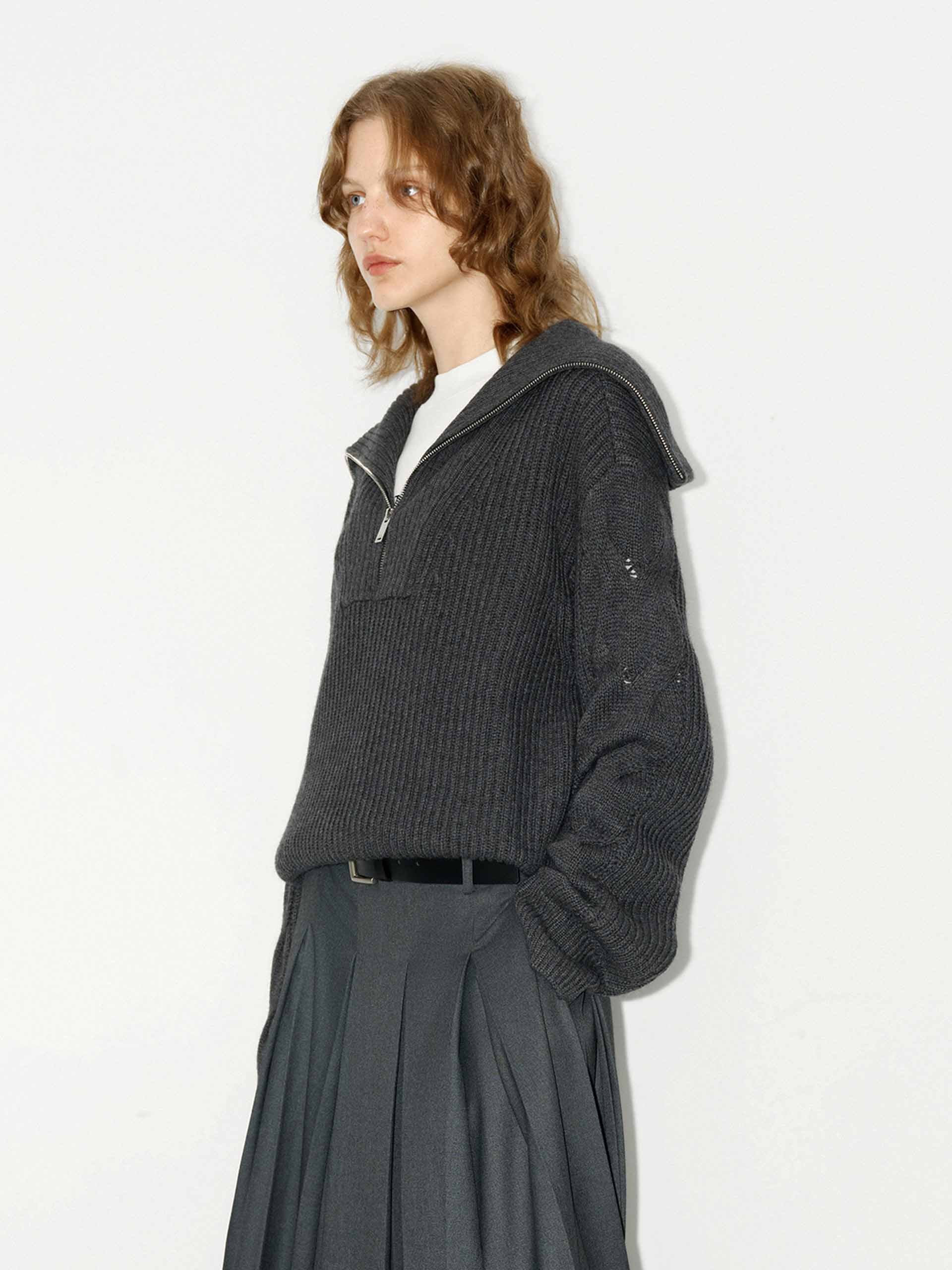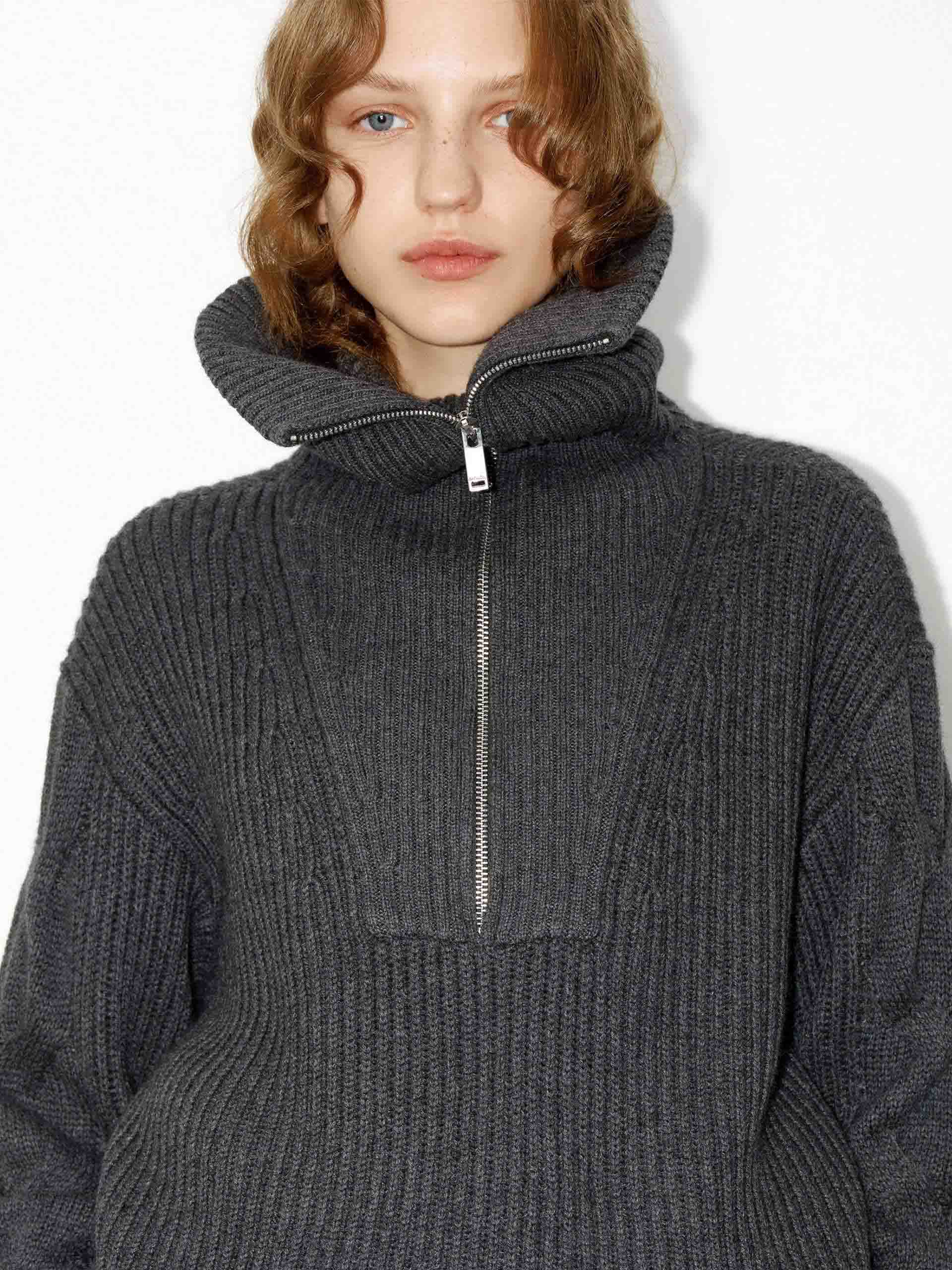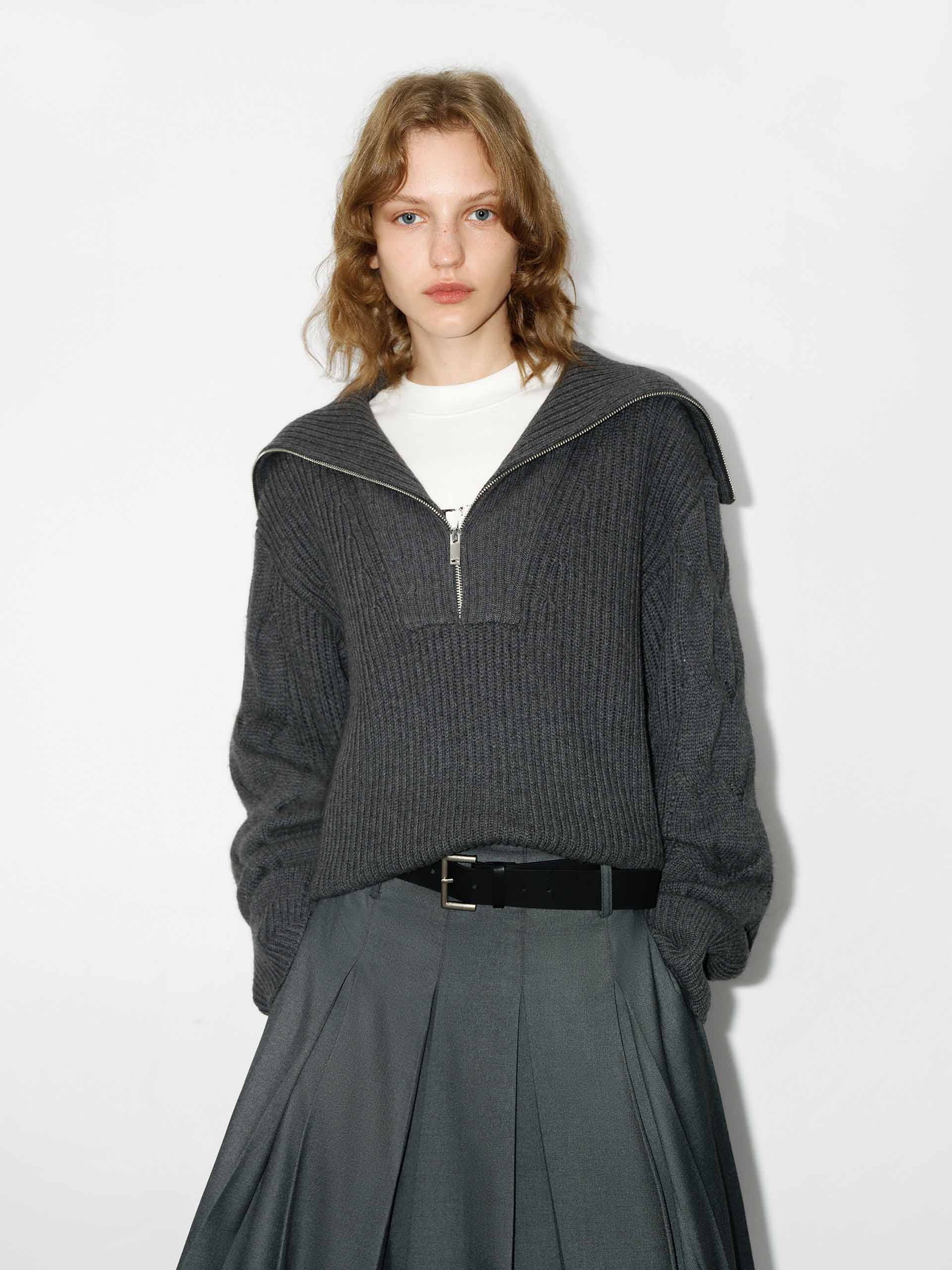 This sweater is made from a wool blend with a hint of cashmere and offers warmth and comfort. With a loose fit and drop shoulder design, it provides a relaxed and stylish look. The navy collar, featuring a half zipper detail, adds a touch of sophistication to this cozy sweater.