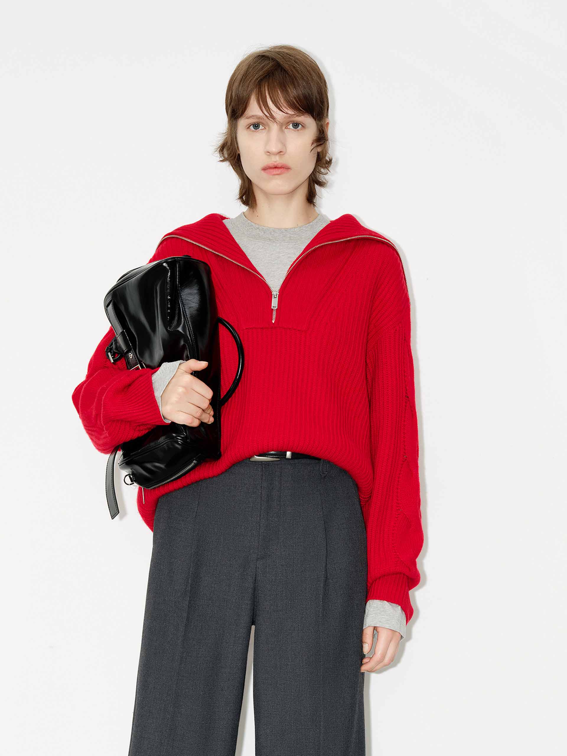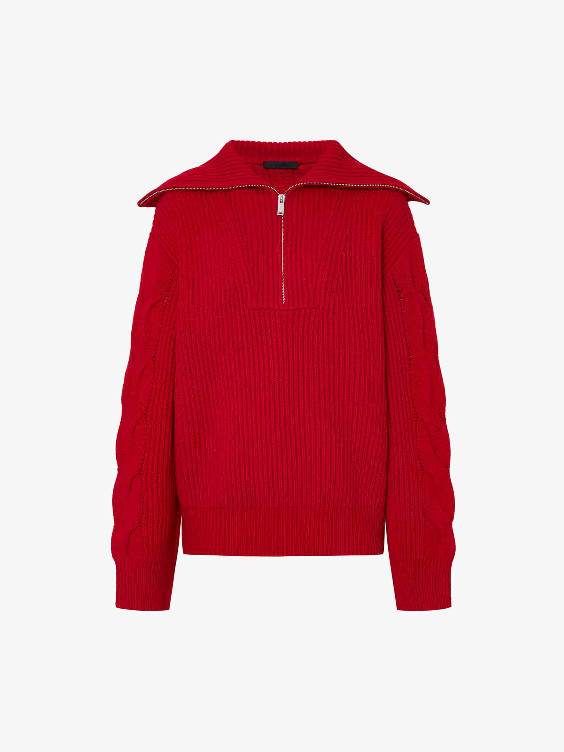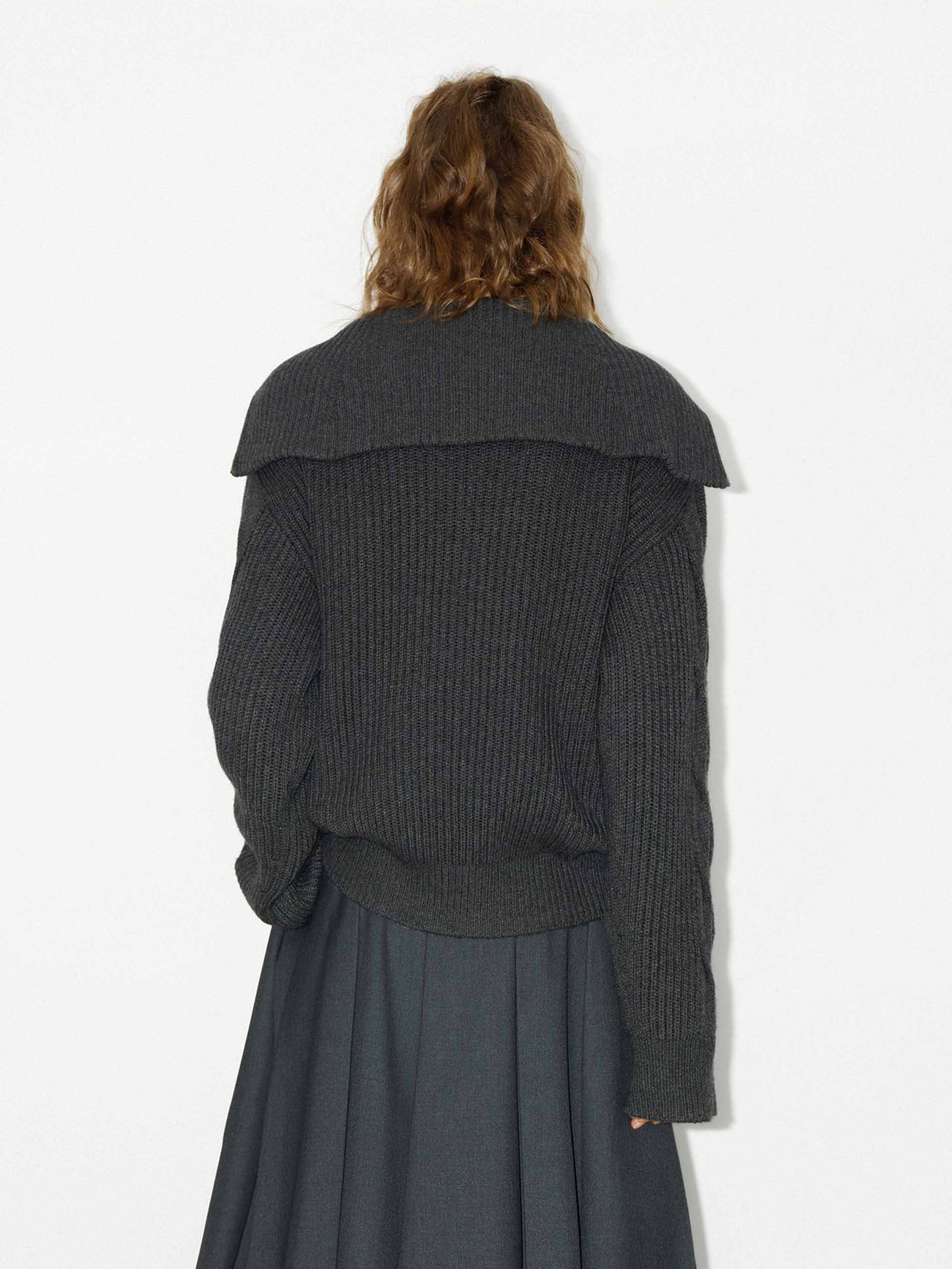 This sweater is made from a wool blend with a hint of cashmere and offers warmth and comfort. With a loose fit and drop shoulder design, it provides a relaxed and stylish look. The navy collar, featuring a half zipper detail, adds a touch of sophistication to this cozy sweater.