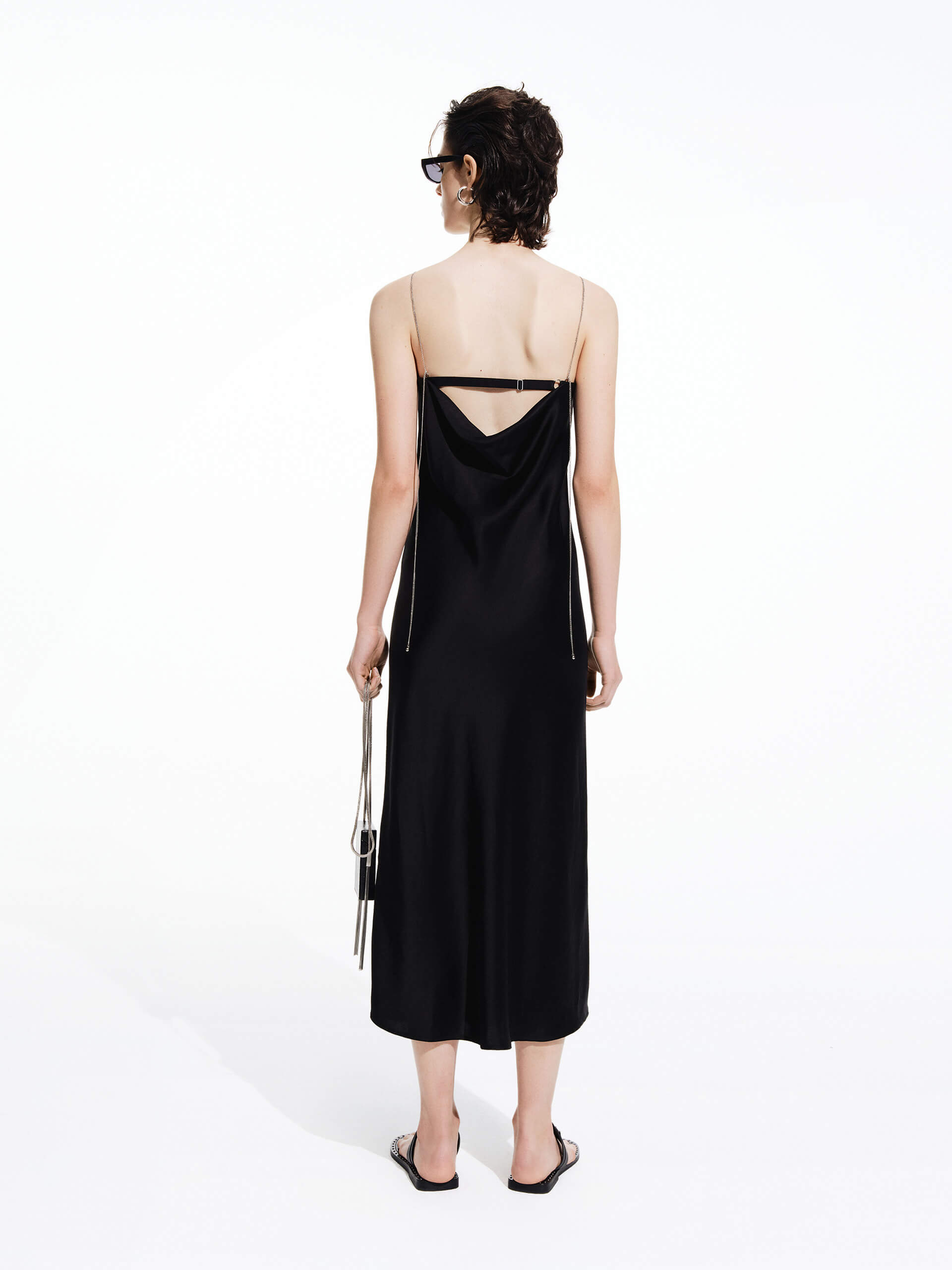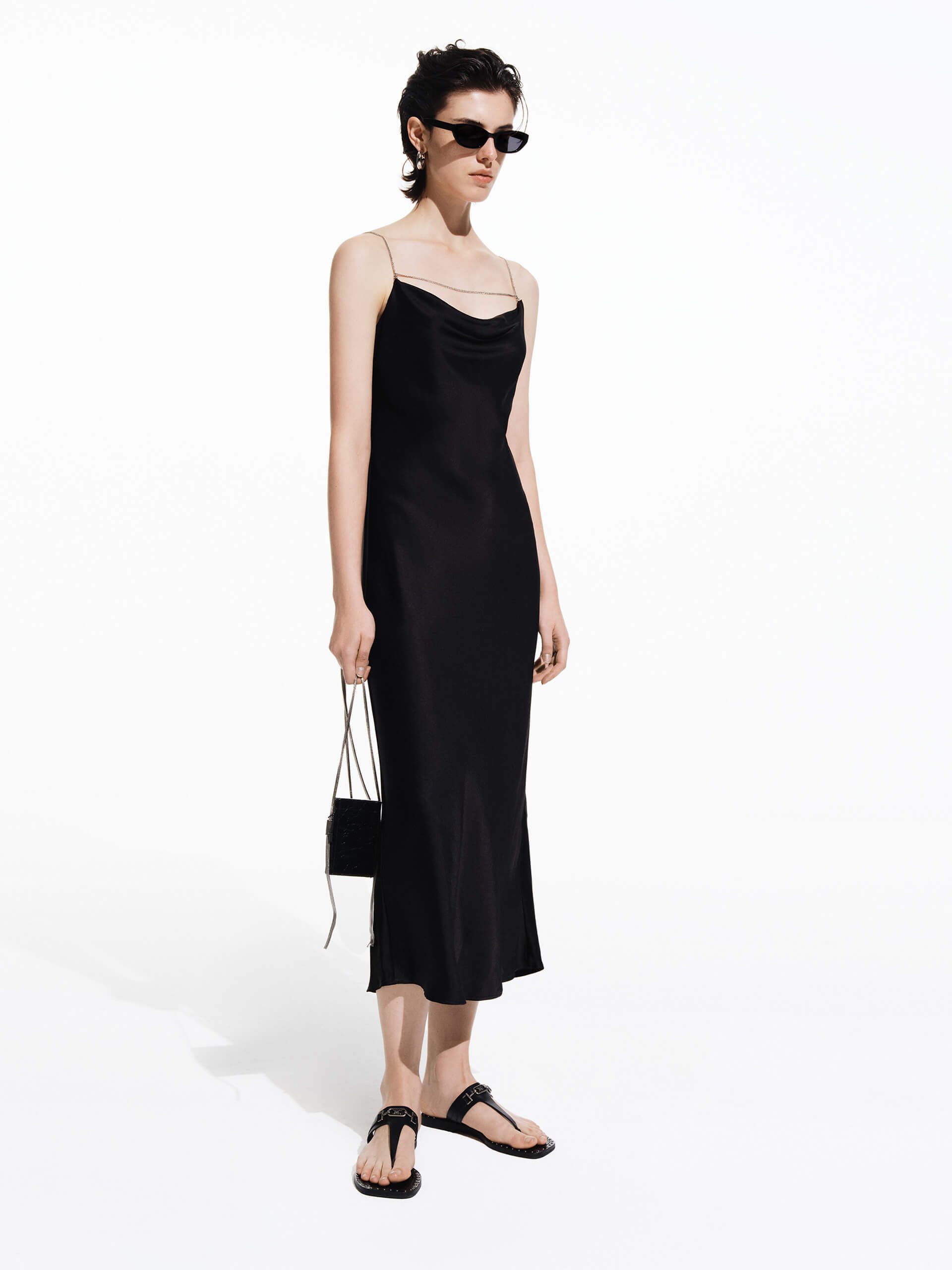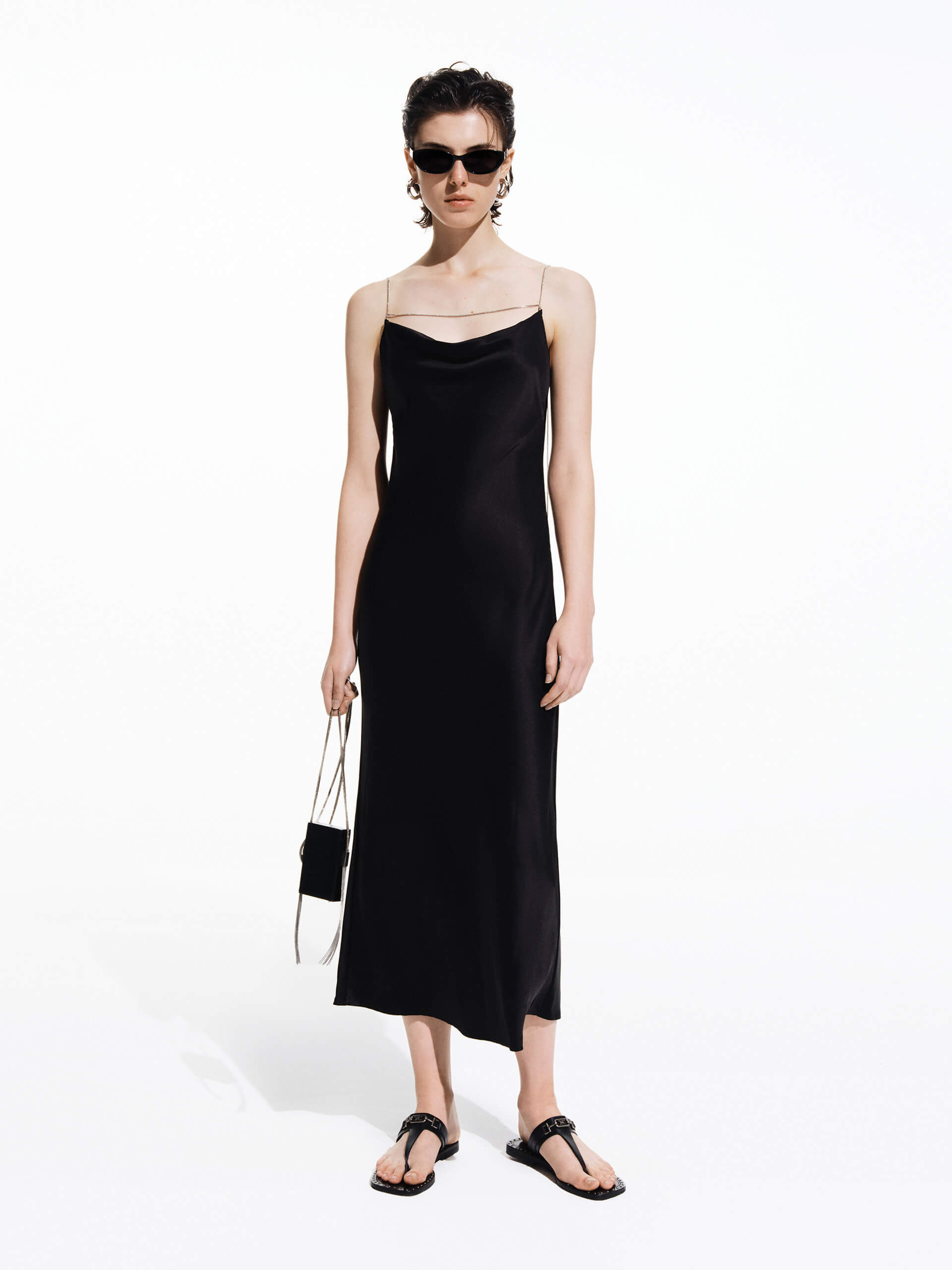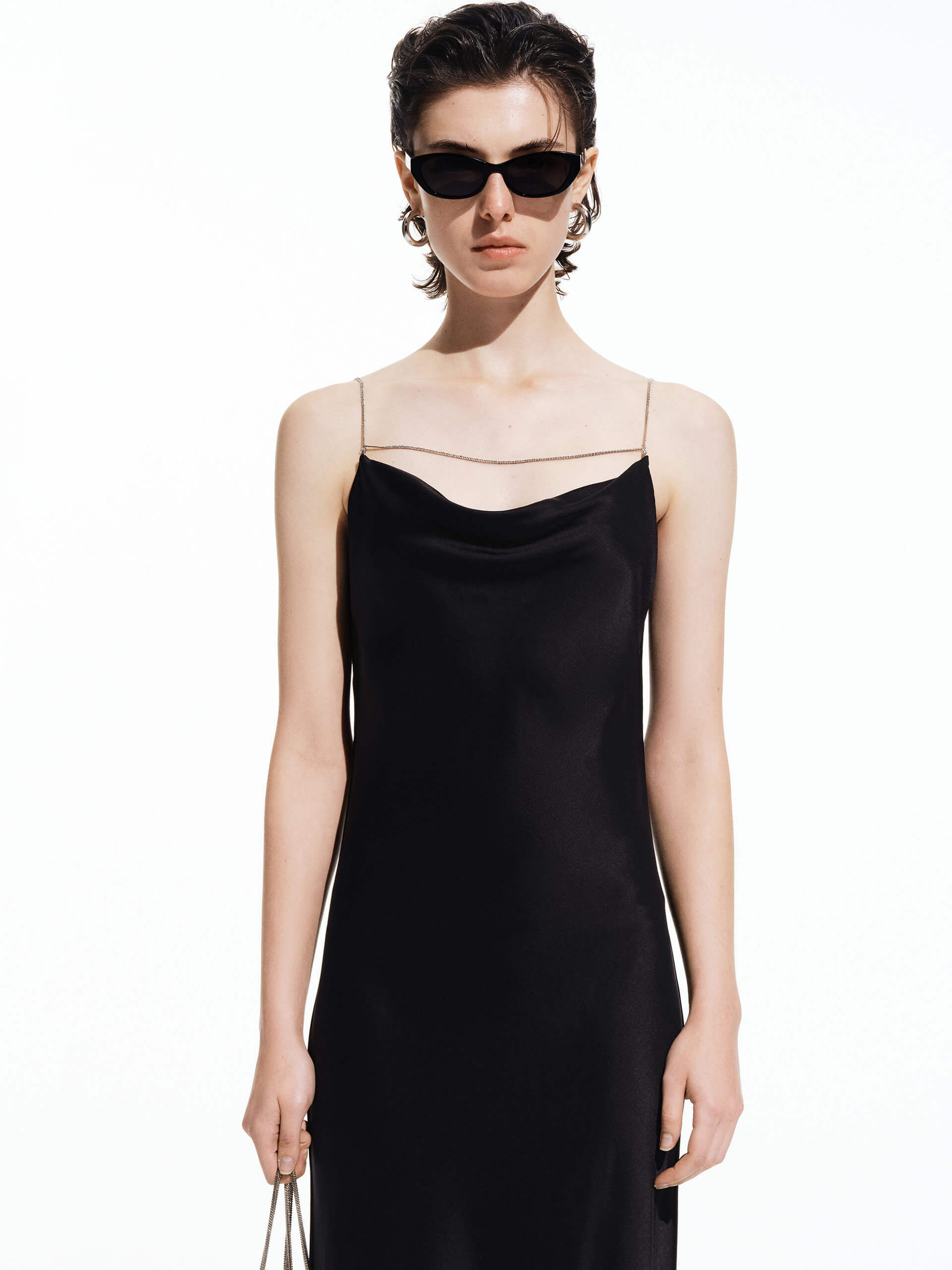 - Waterfall neckline, metallic spaghetti straps