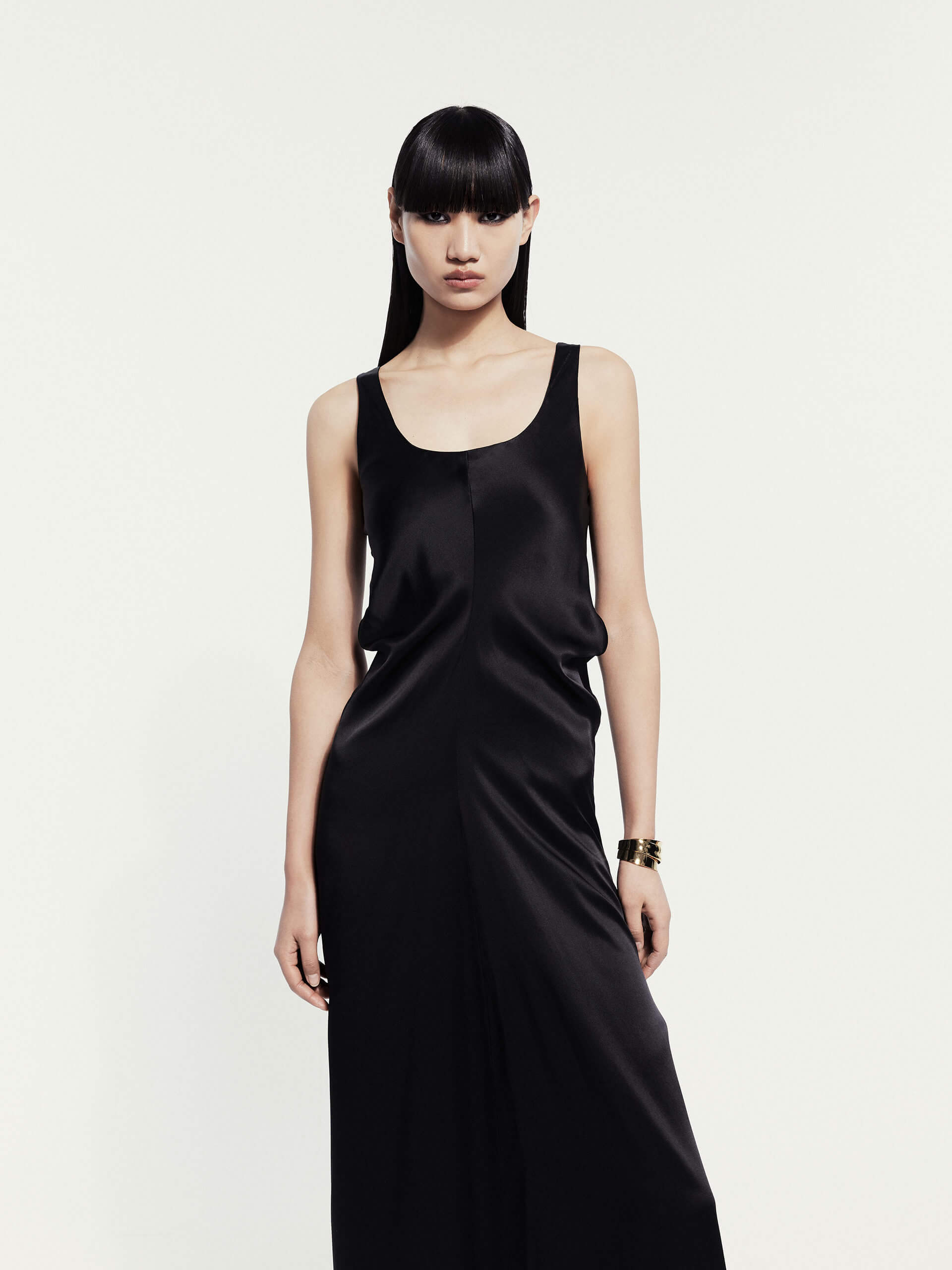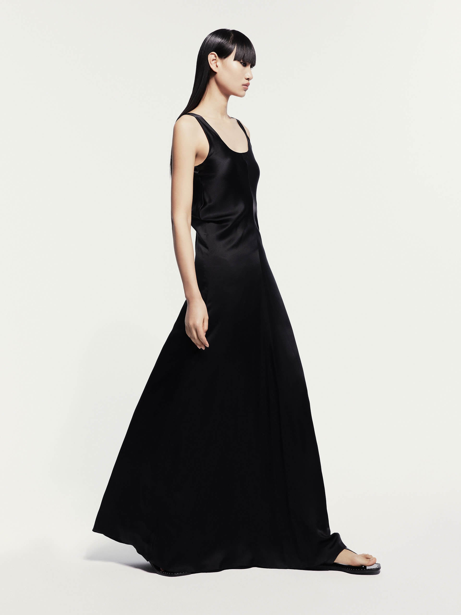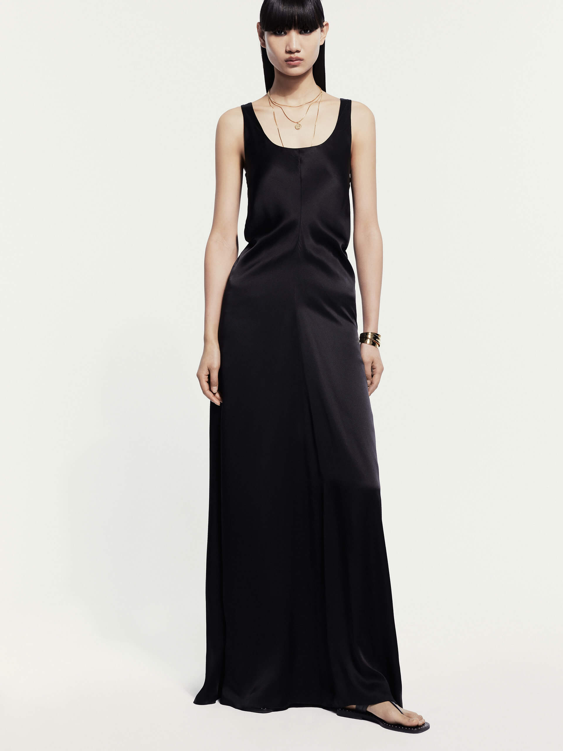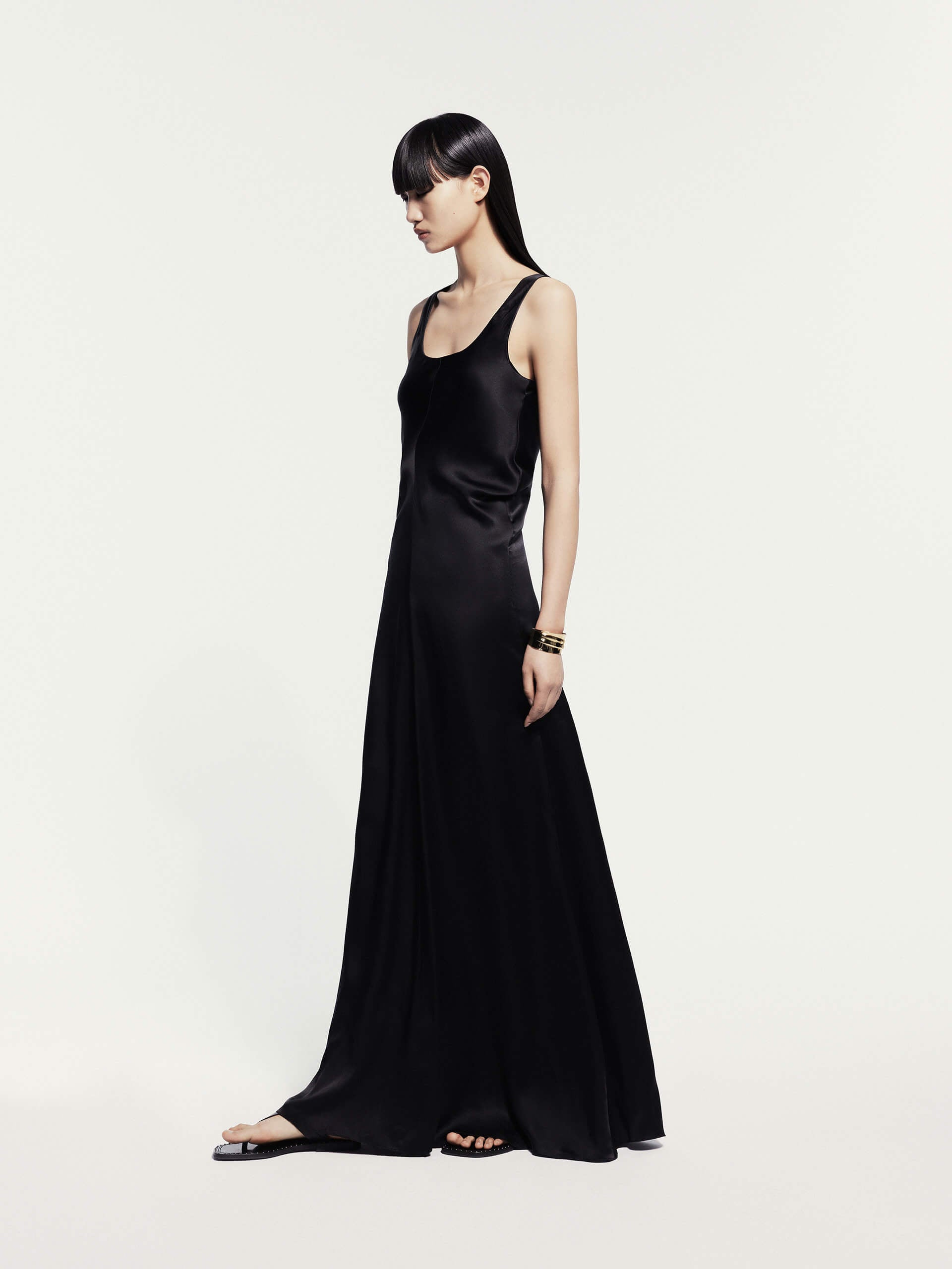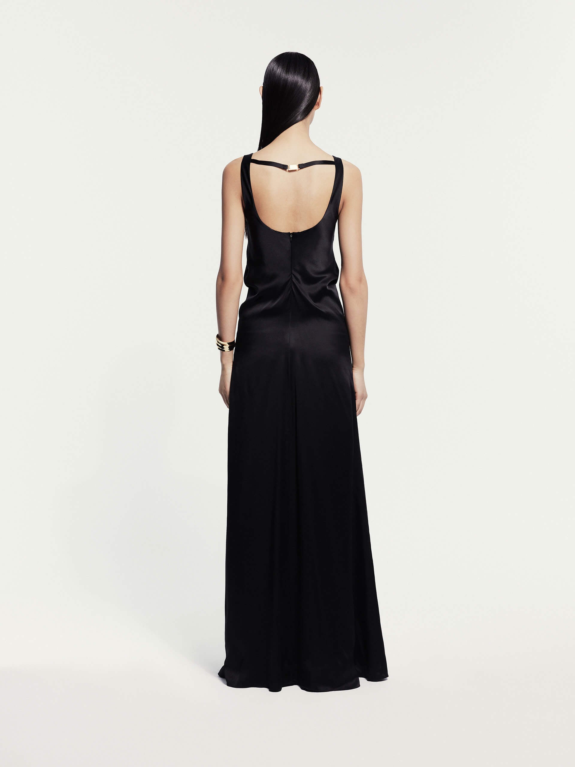 This maxi dress from the Noir collection exudes effortless sophistication and glamour. Crafted from luxurious satin silk fabric that drapes beautifully, features a captivating open-back design with elegant tie details. The square neckline adds a touch of modern allure, while the accentuated waistline with pleated detailing creates a flattering, hourglass silhouette. With its timeless elegance and impeccable craftsmanship, it is perfect for making a statement at any formal occasion or evening soiree.