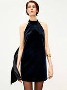 As a sleeveless statement piece, this dress balances bold exposure with refined tailoring, making it the ultimate choice for moments that demand confidence and captivating style. The elegant halterneck neckline gracefully transitions into a dramatic backless design, secured by a discreet back zipper and finished with a back tie detail for a perfect, customizable fit.