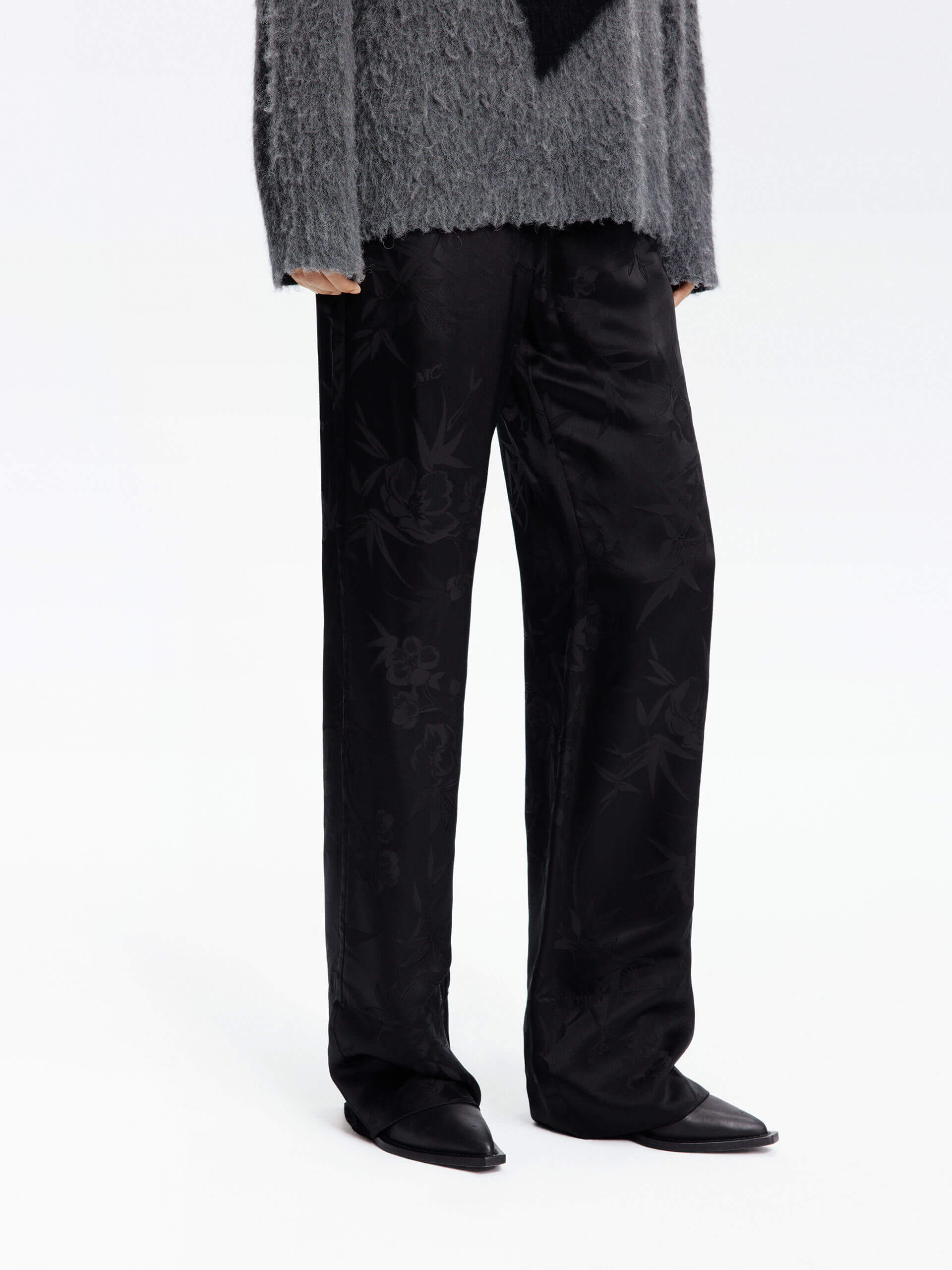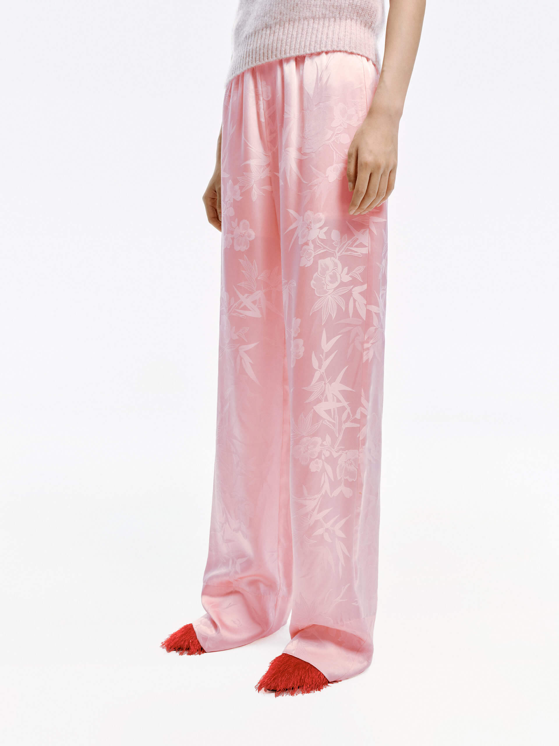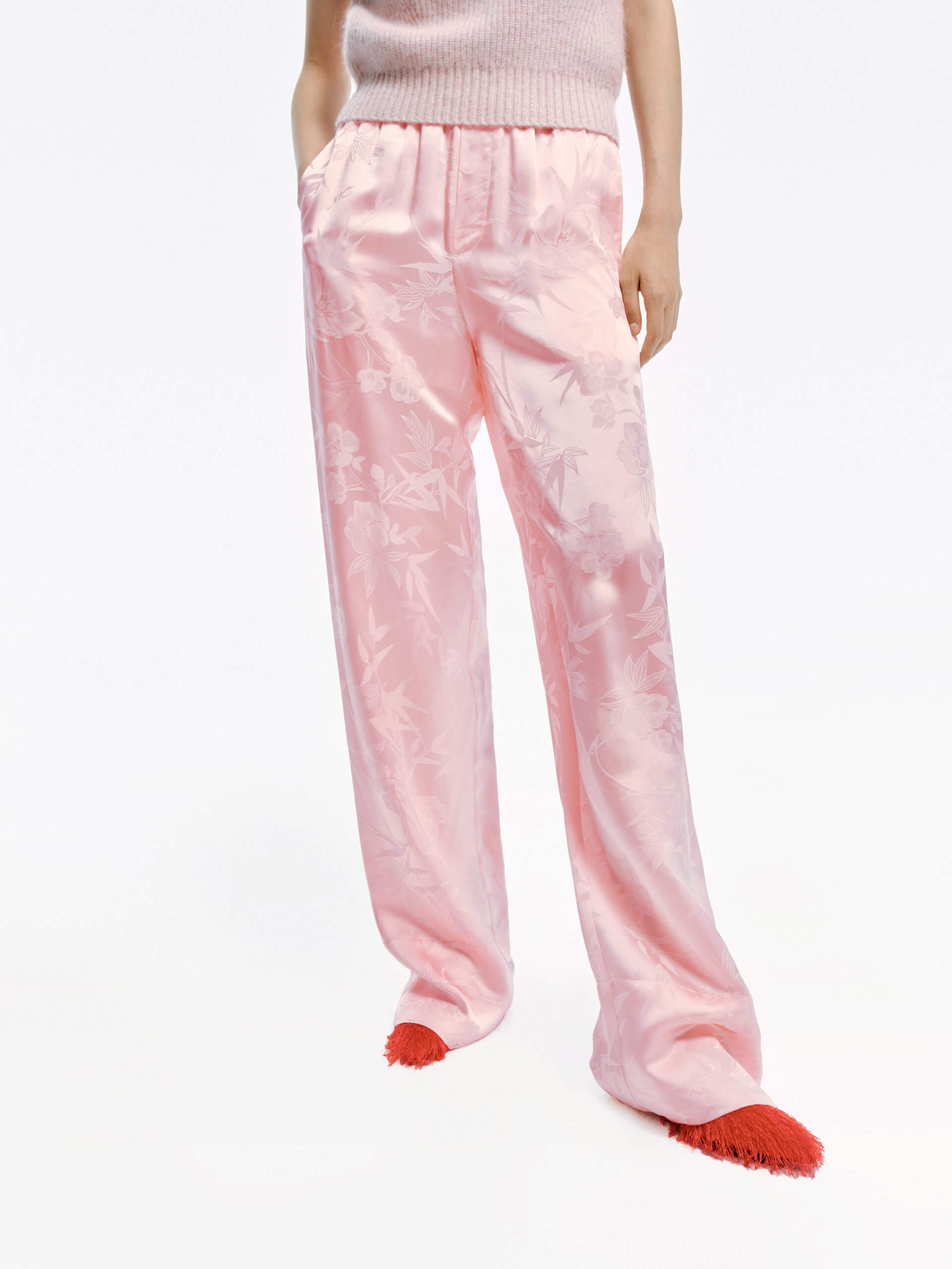 Made with a smooth and comfortable blend of silk, these pants feature an intricate jacquard pattern of bamboo leaves and roses. With an adjustable waistband and convenient side pockets, these pants offer both style and functionality.