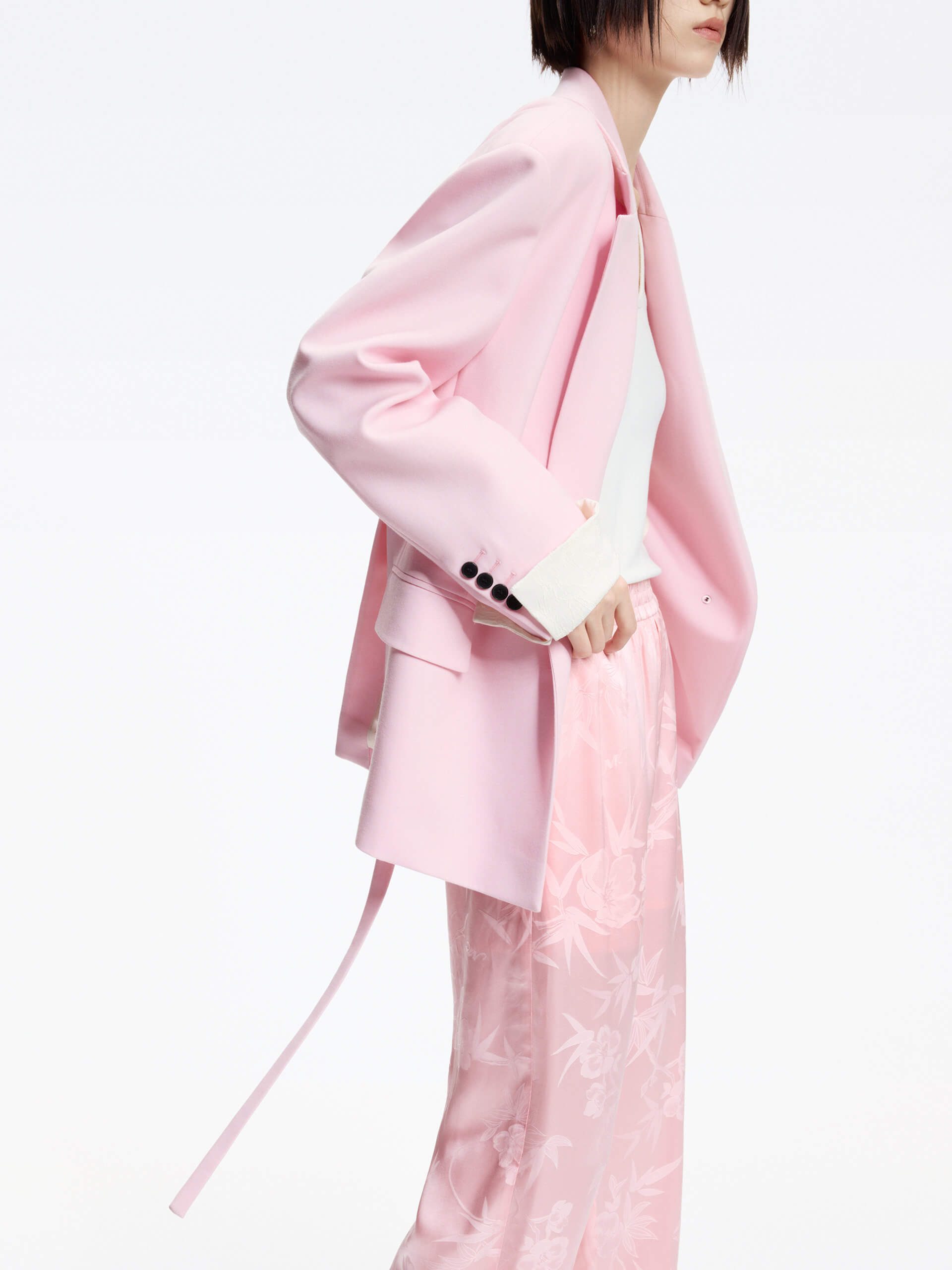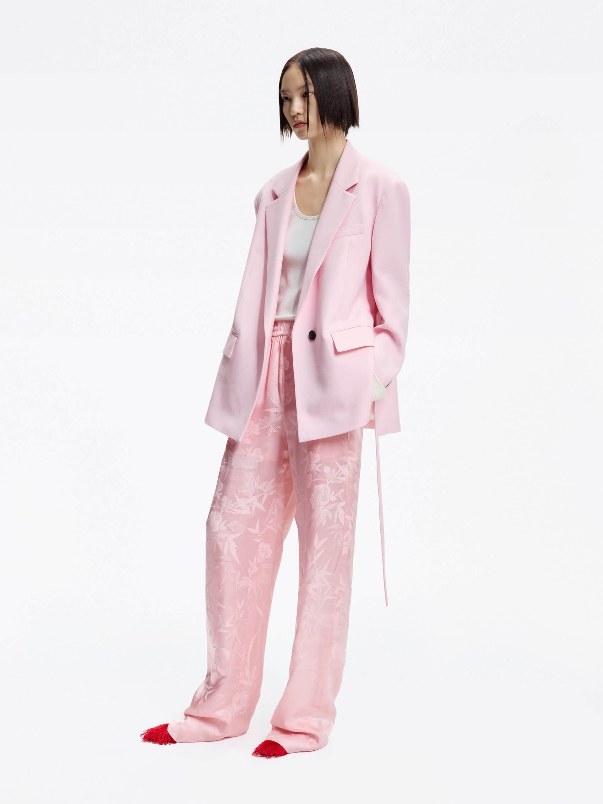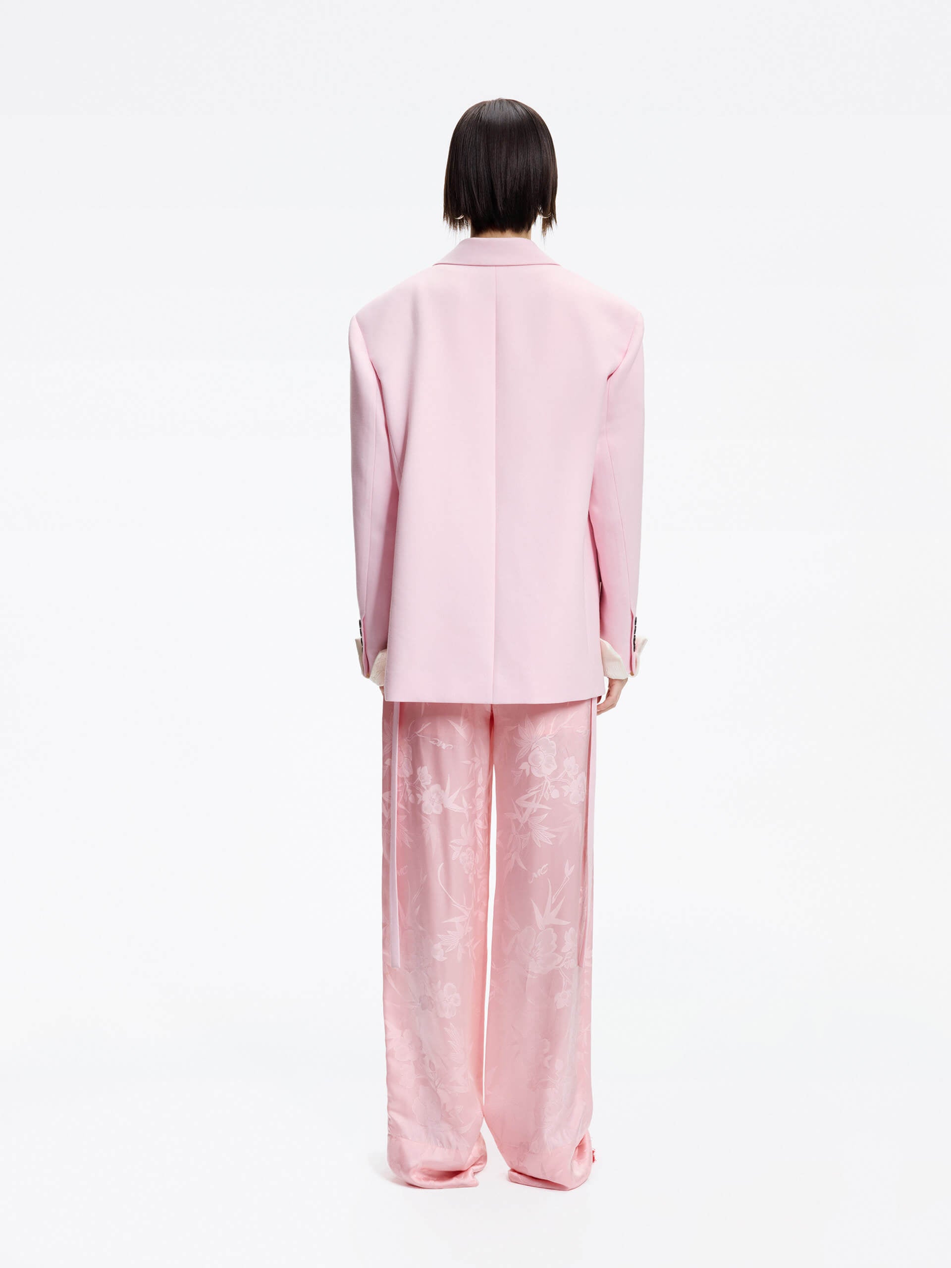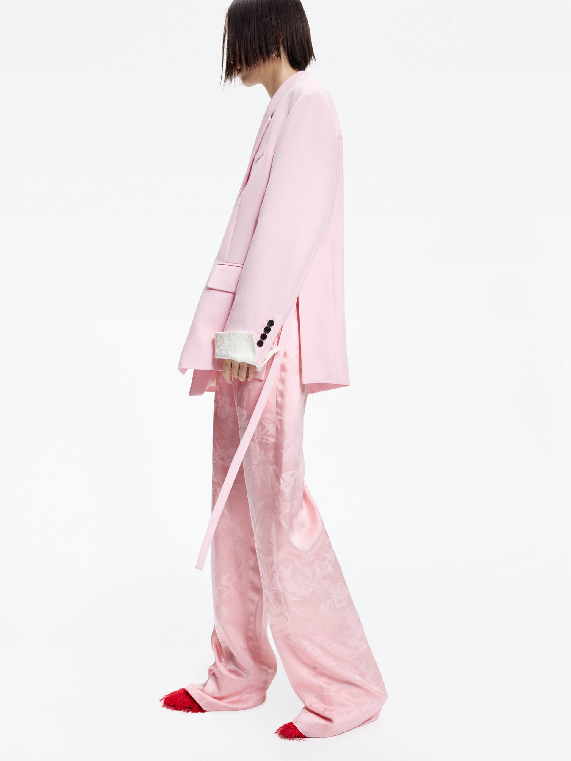 Made with a smooth and comfortable blend of silk, these pants feature an intricate jacquard pattern of bamboo leaves and roses. With an adjustable waistband and convenient side pockets, these pants offer both style and functionality.