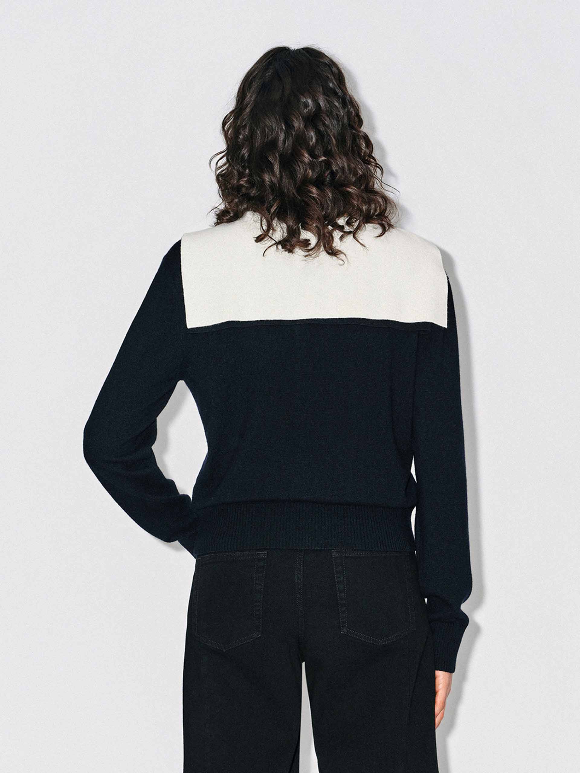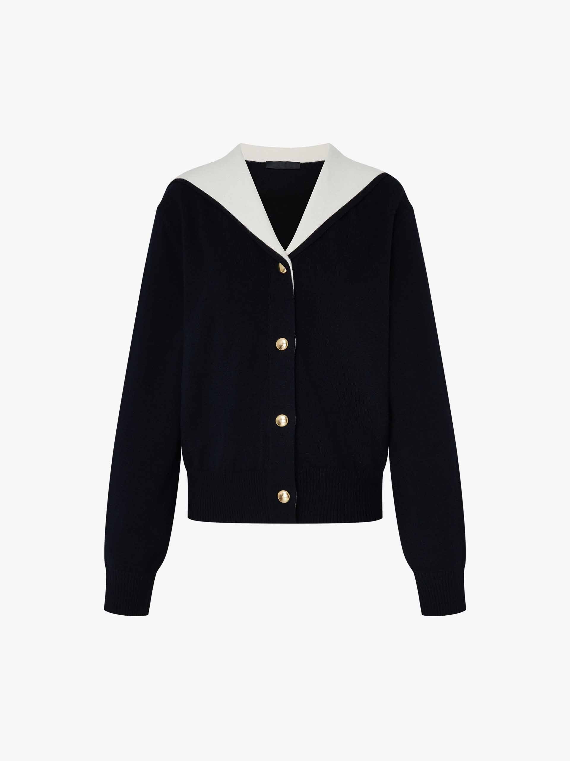 Crafted from a luxurious blend of wool and cashmere, this cardigan offers exceptional softness and lightweight comfort. Featuring a classic V-neckline and long sleeves with button closure, it combines timeless elegance with practical design. The standout contrast sailor-inspired collar adds a touch of nautical charm and visual interest, while the ribbed hem ensures a snug fit and clean finish.