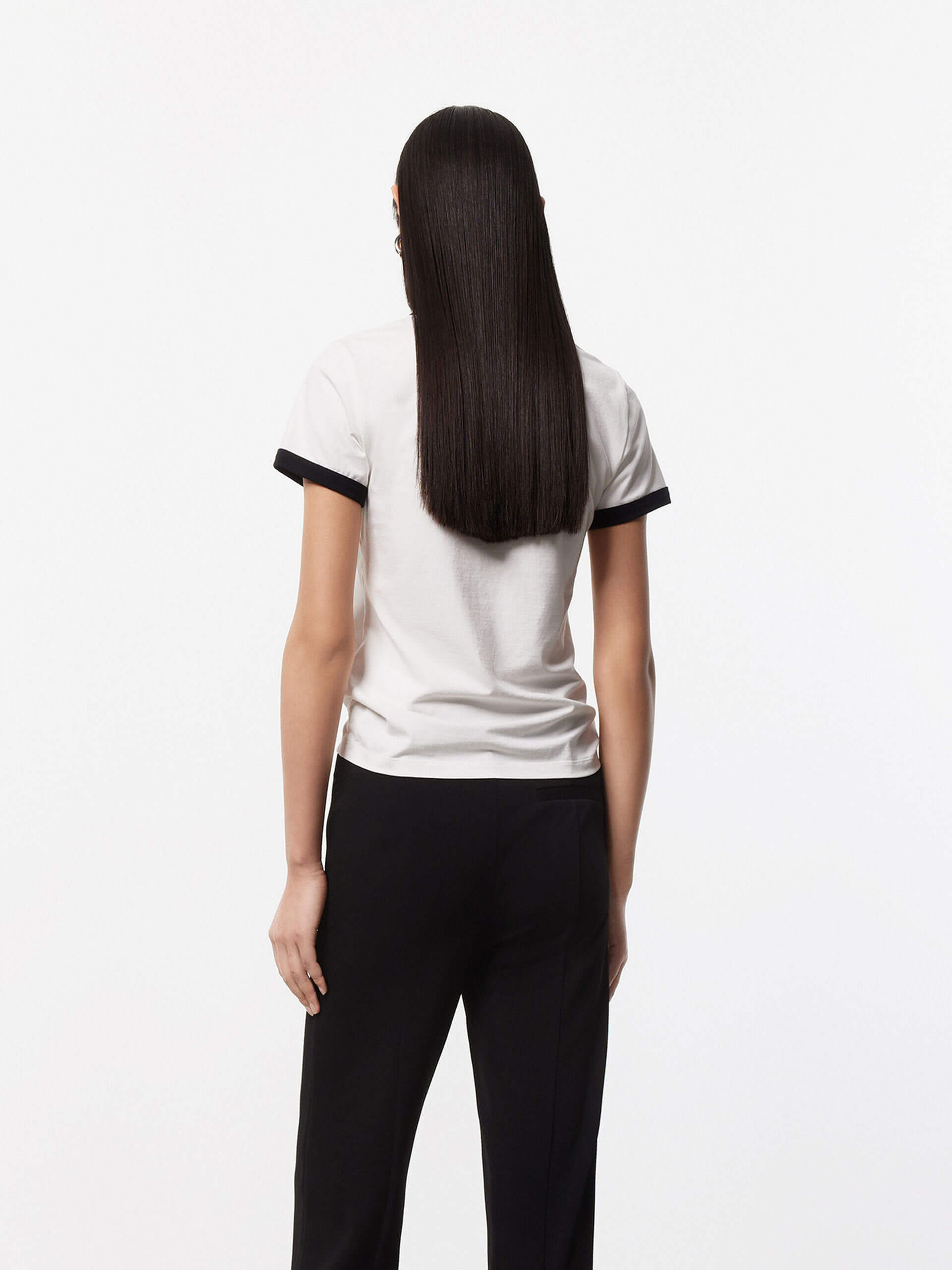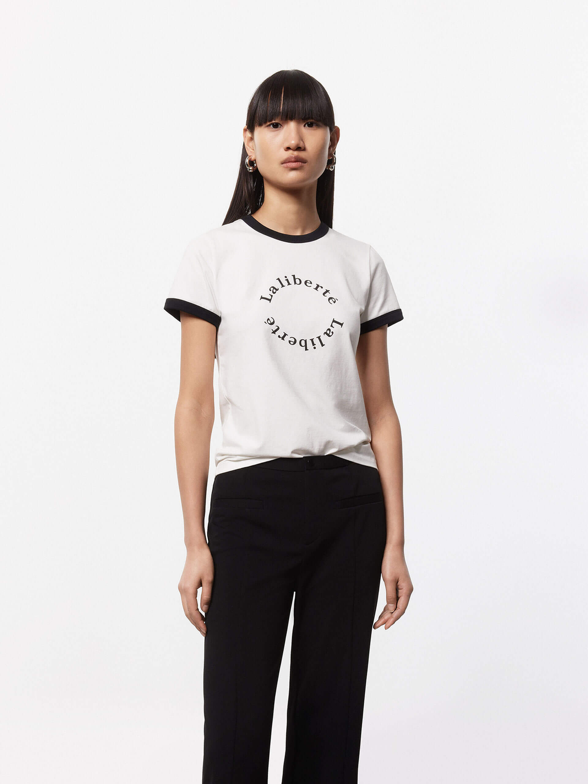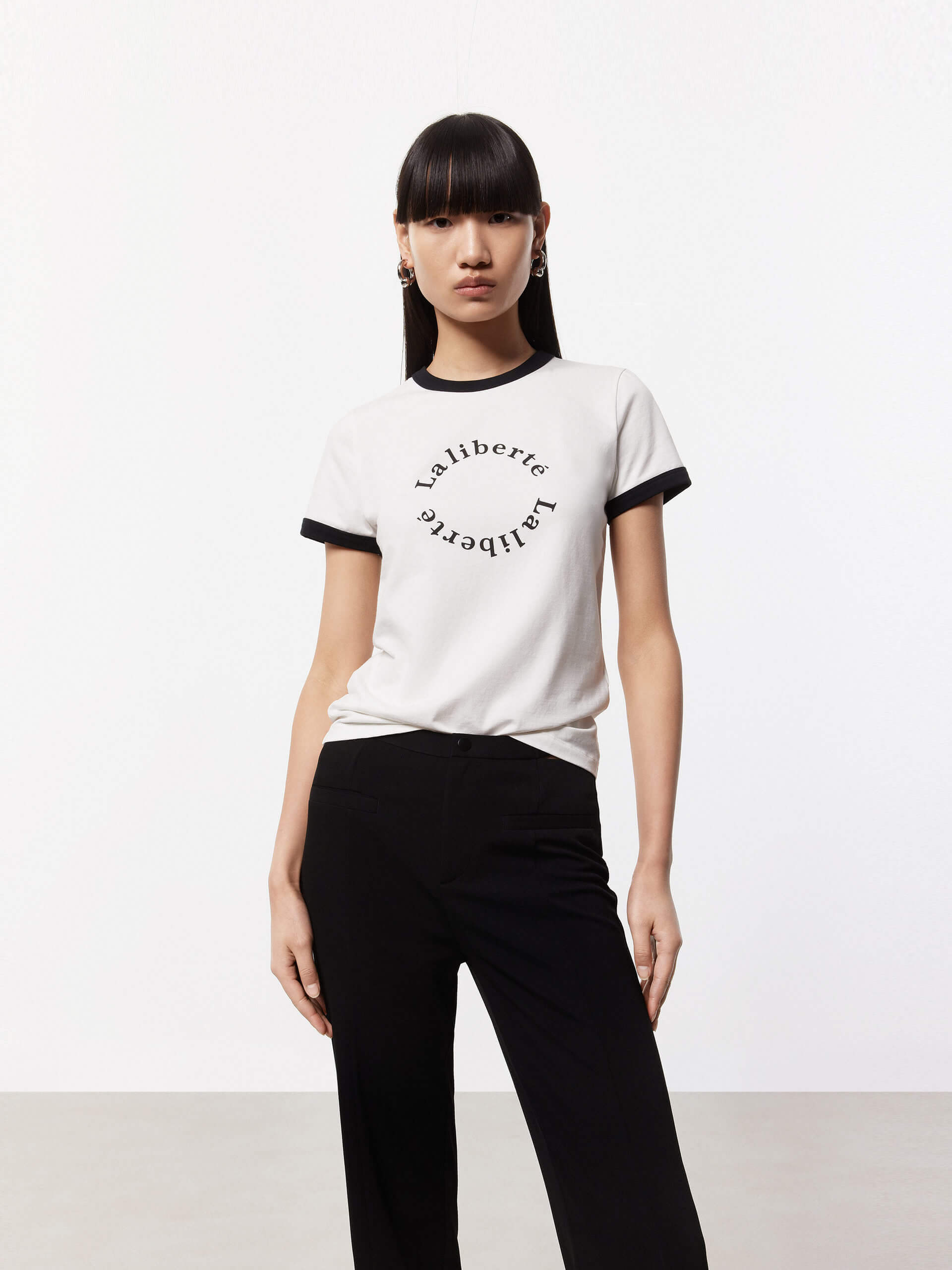 This cotton blend T-shirt offers a comfortable and flattering fit with its slightly slim design. The front letter print adds a stylish touch, while the contrast trim details are paired with black pants, elevating the overall look.