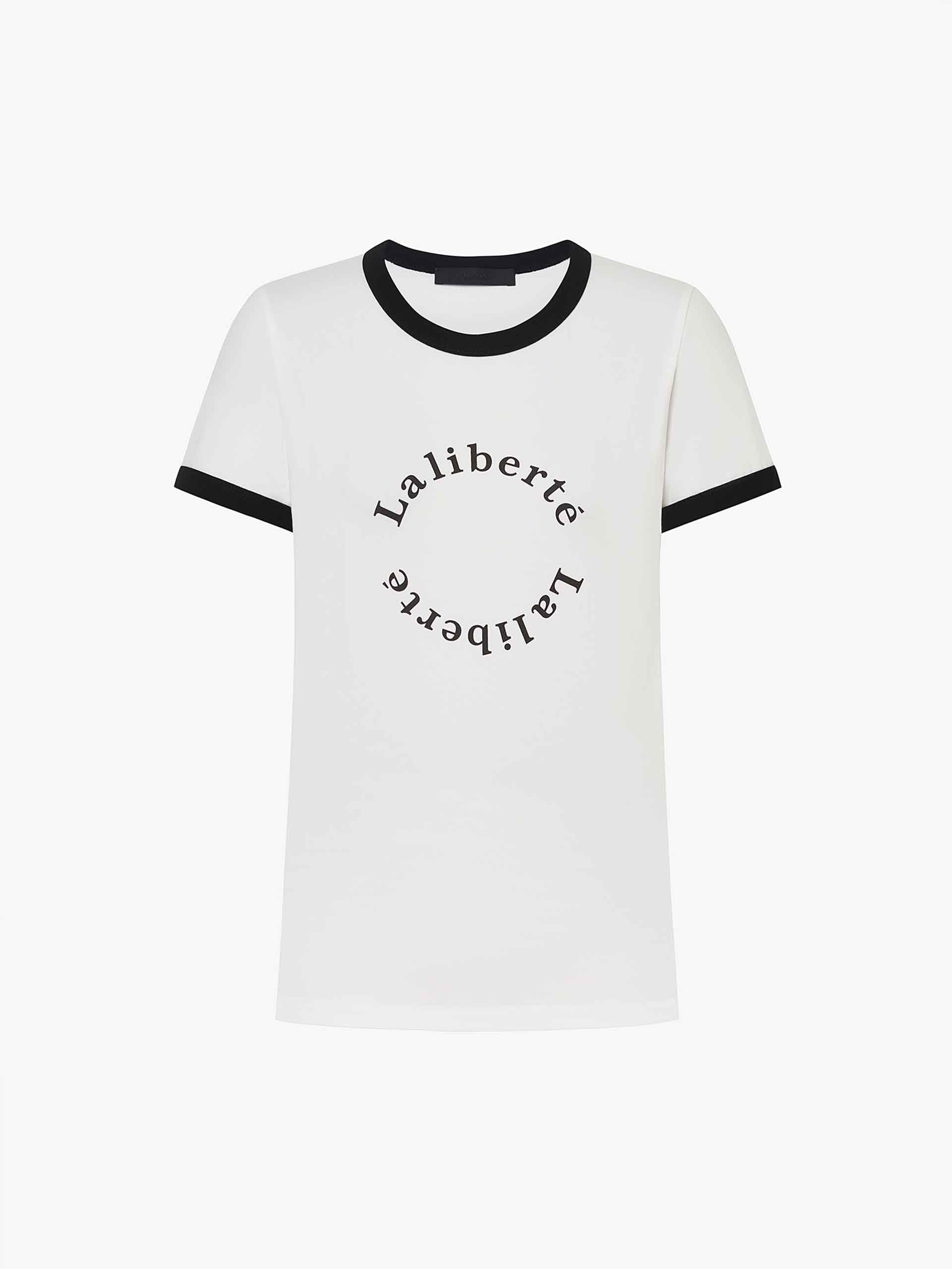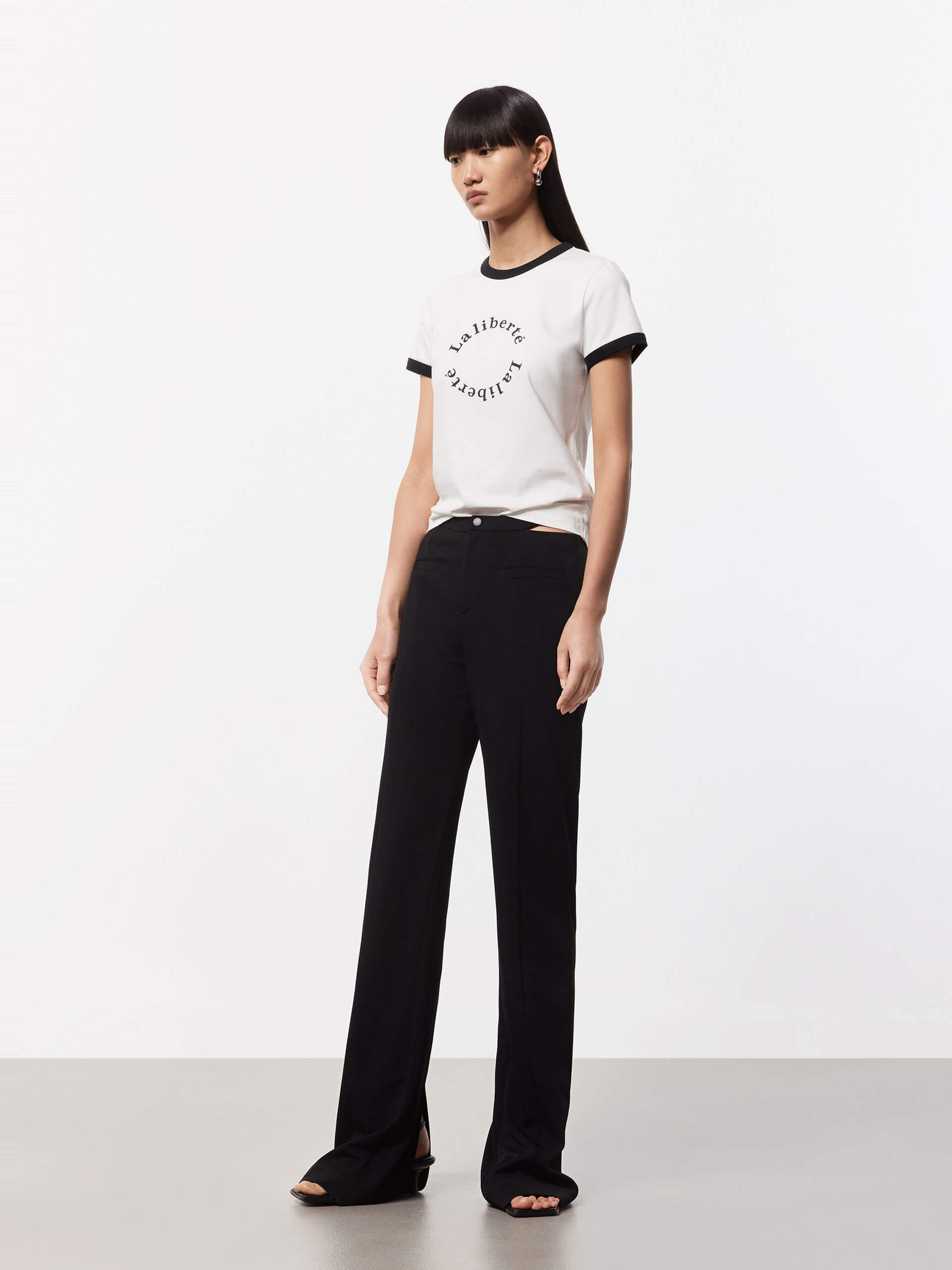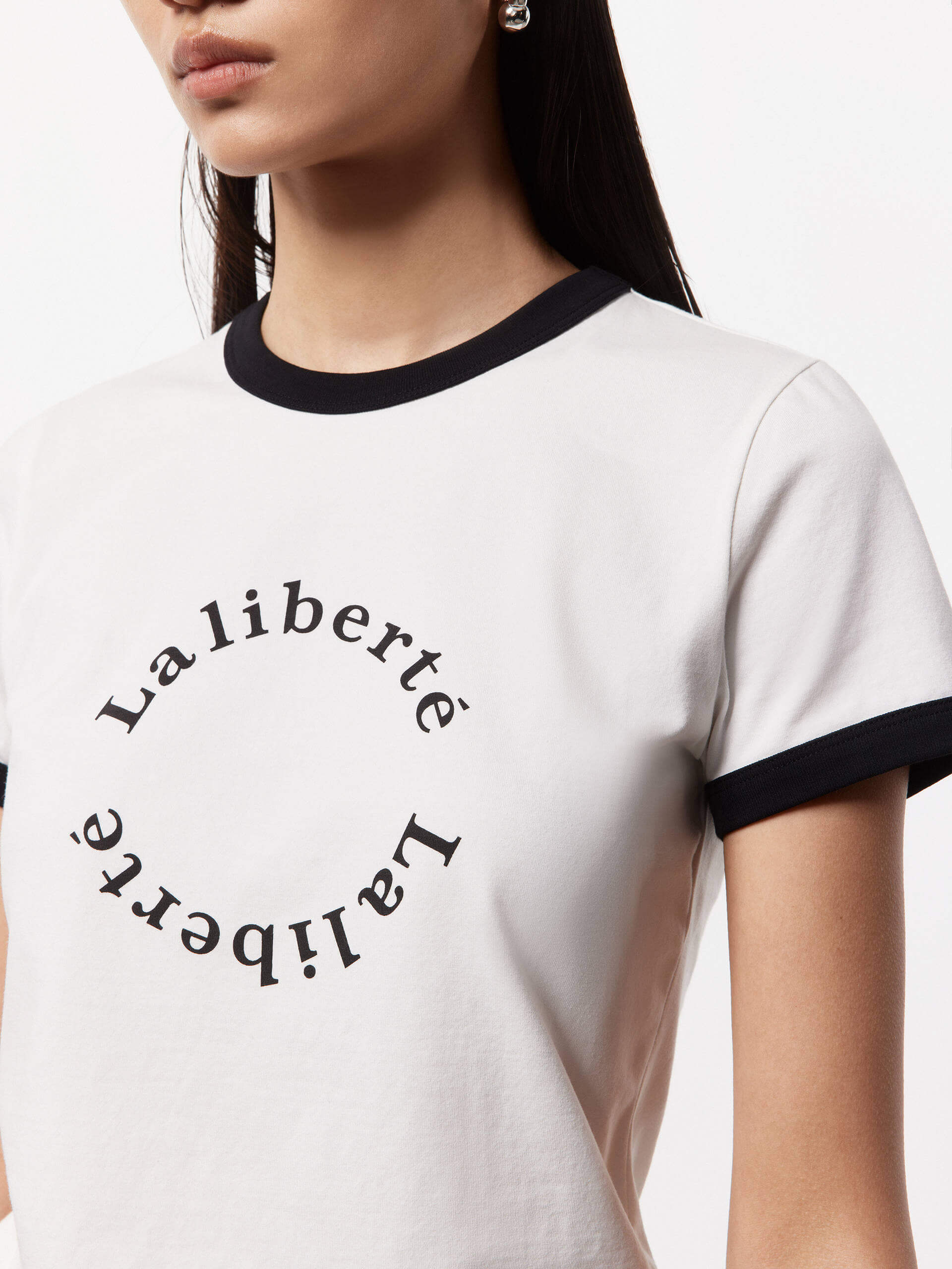 This cotton blend T-shirt offers a comfortable and flattering fit with its slightly slim design. The front letter print adds a stylish touch, while the contrast trim details are paired with black pants, elevating the overall look.