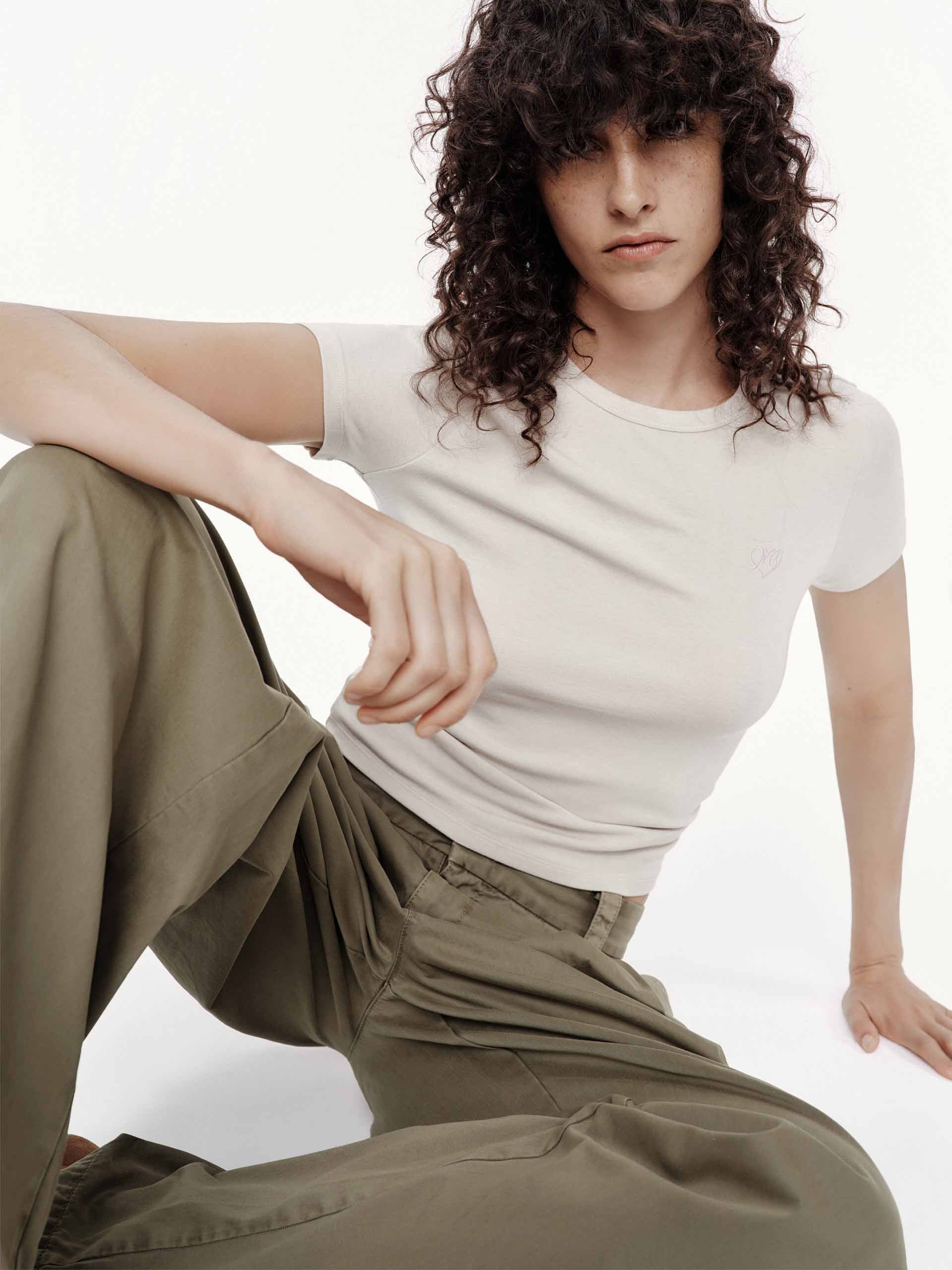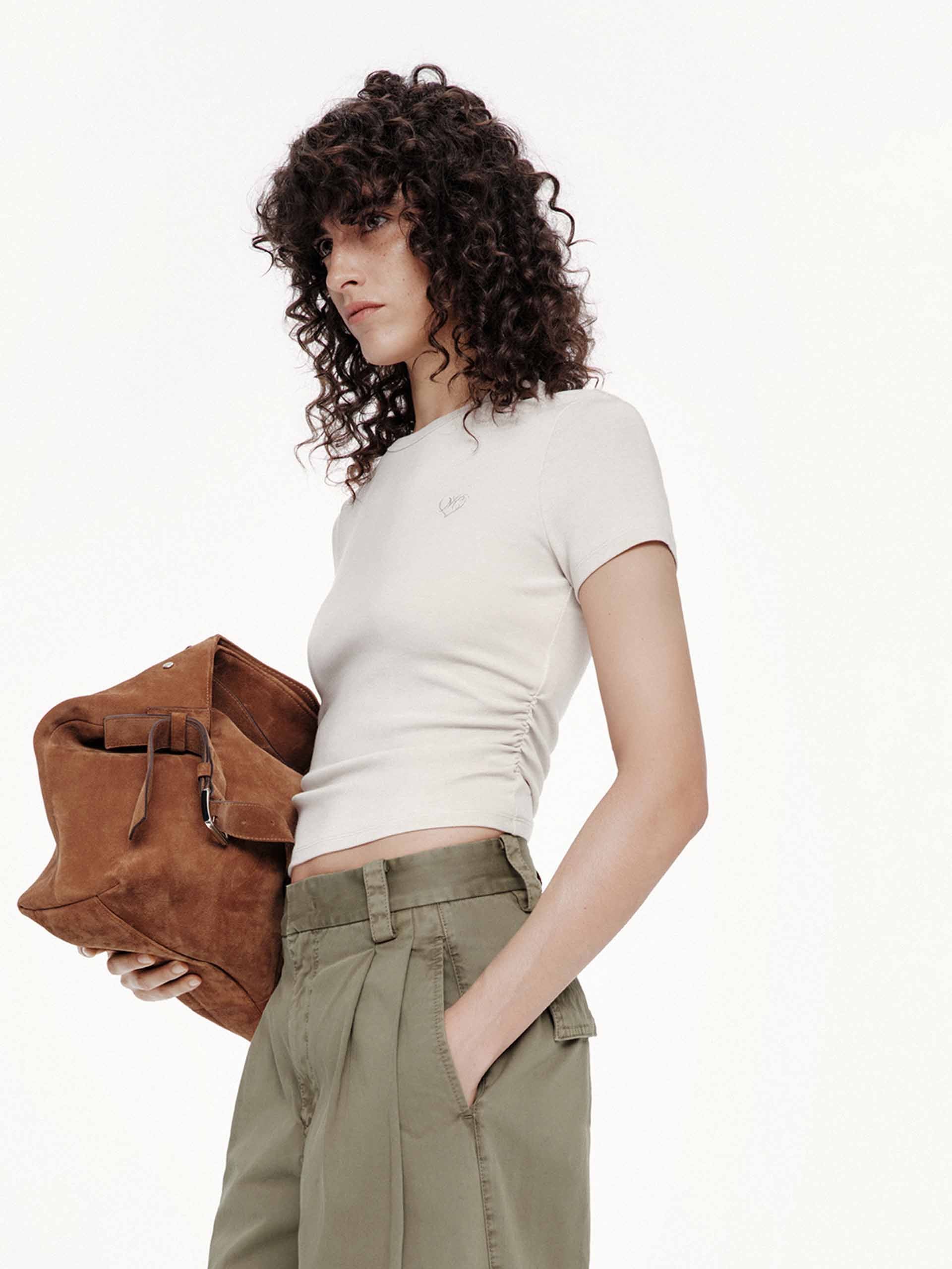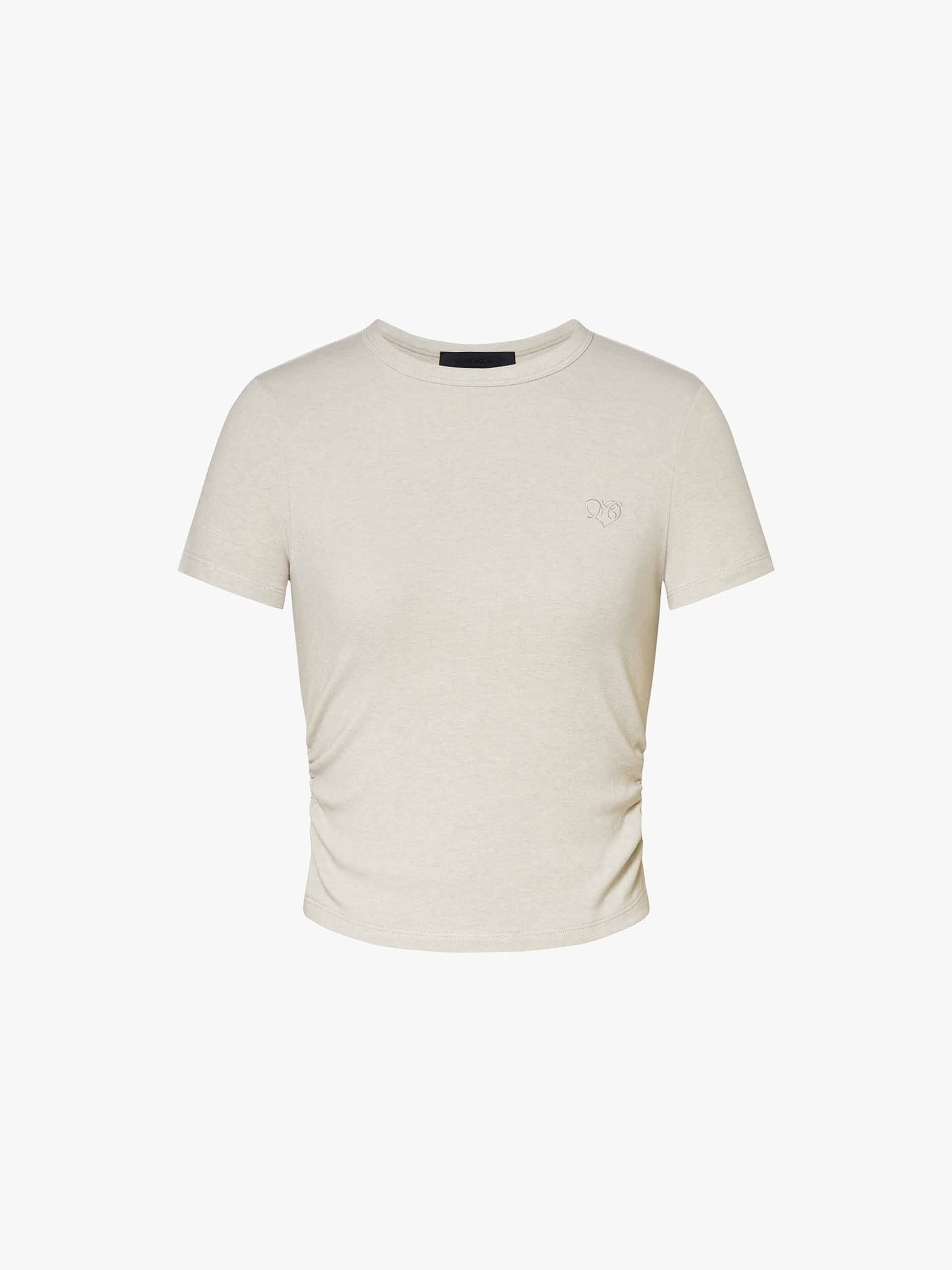 Redefine casual elegance with our t-shirt, where classic comfort meets refined detailing. The slim fit skims the body for a polished silhouette, while the pleated waist design adds unexpected texture and feminine shape to this everyday staple. A delicate embroidered logo provides subtle branding, elevating the minimalist aesthetic.