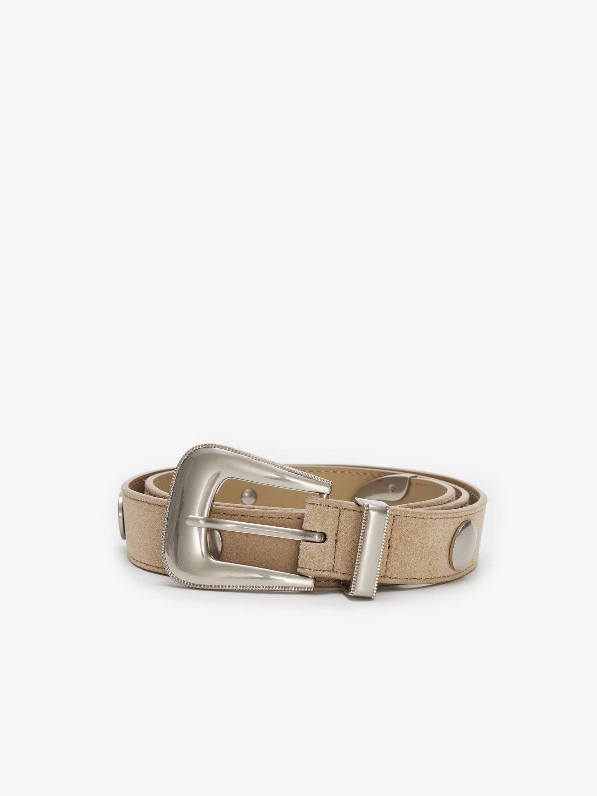 This belt is crafted from genuine split leather, featuring a luxurious suede-like texture with a soft, brushed finish. Presented in a versatile sand almond hue, it offers a timeless and elegant touch to any outfit. Perfect for adding a subtle yet sophisticated accent to both casual and refined looks.