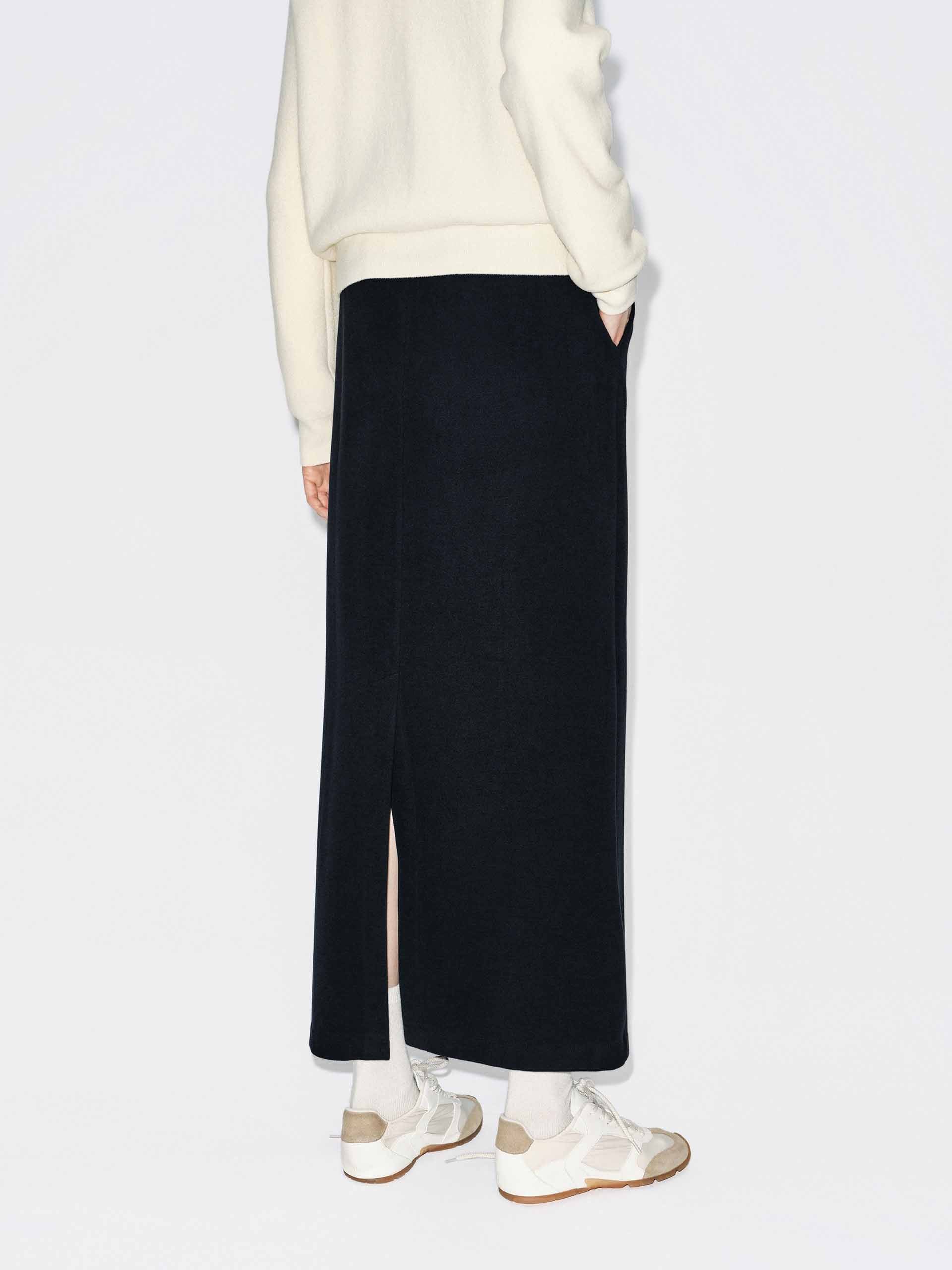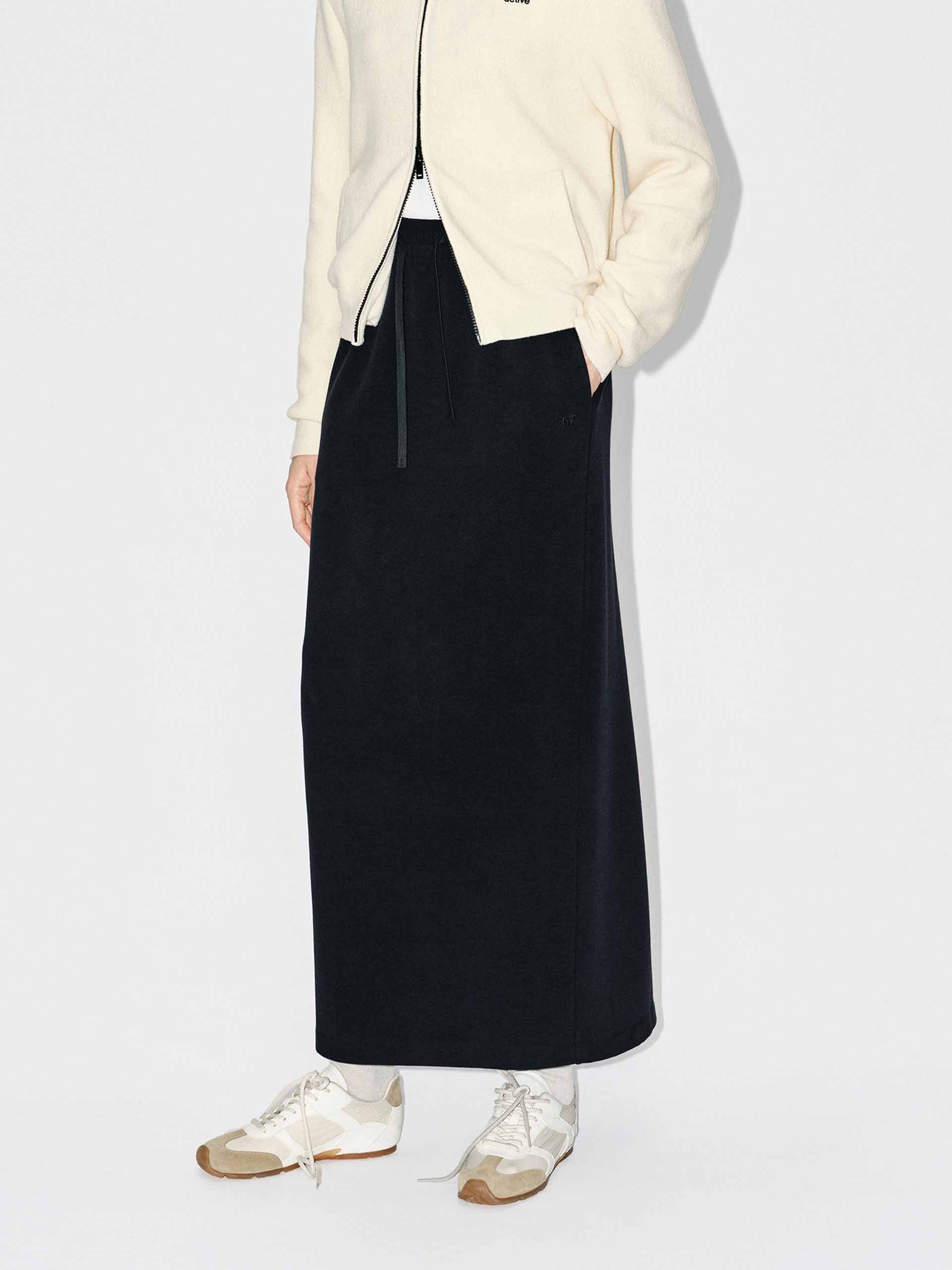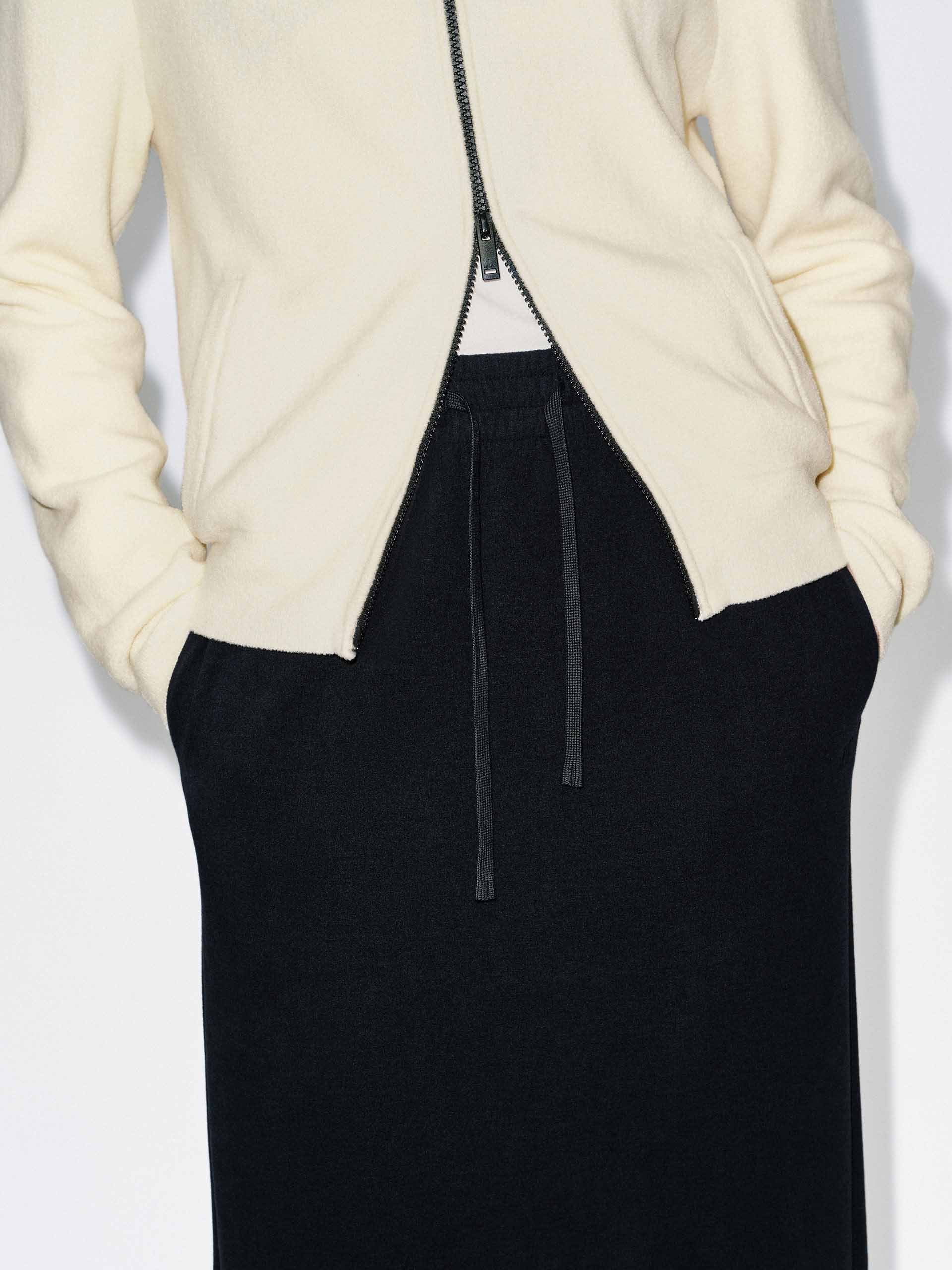 Designed for movement and modernity, this skirt combines soft drape with thoughtful functionality. The regular fit flows elegantly from an elasticated waistband with an adjustable drawstring, allowing a customizable and comfortable fit. Side pockets offer subtle utility, while a graceful back slit introduces a touch of sophistication and freedom of movement.
