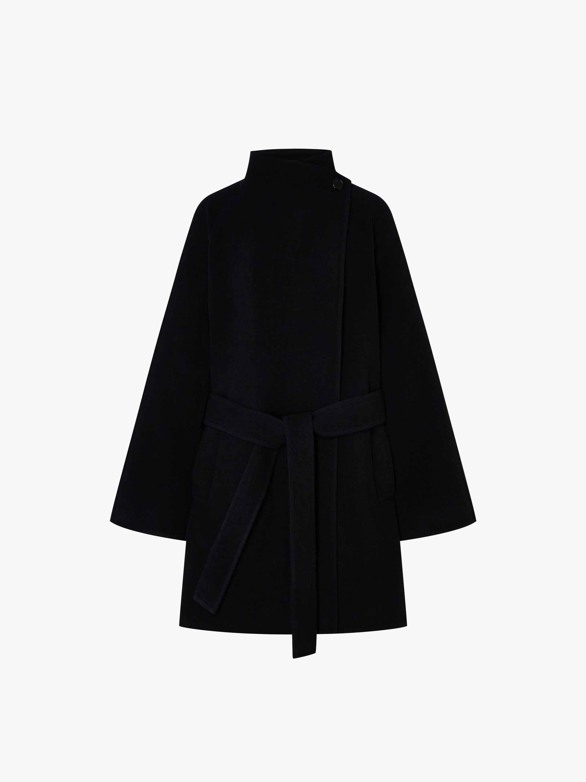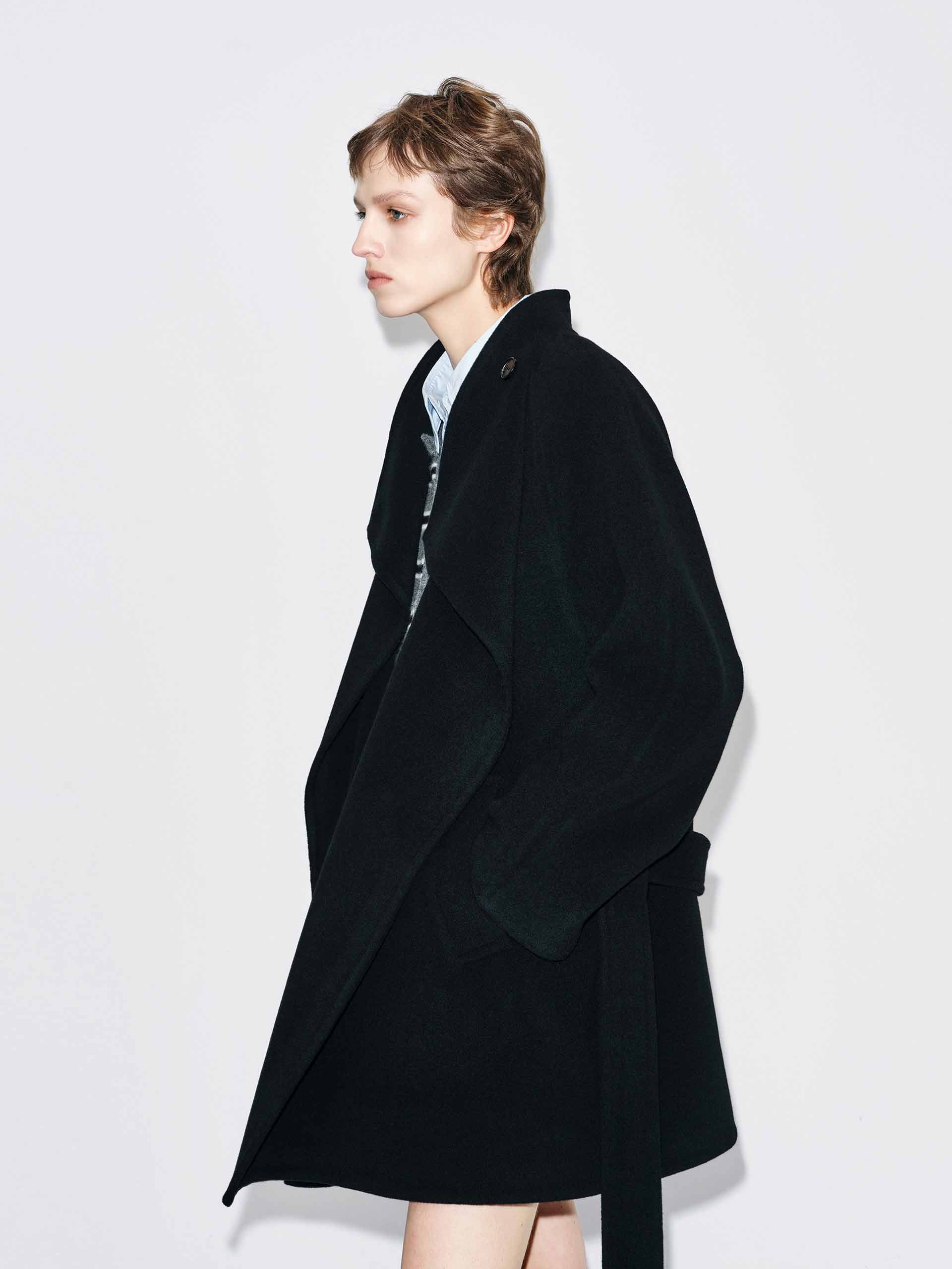 Experience unparalleled luxury and modern elegance with this coat, meticulously crafted from a premium blend of wool for a supremely soft hand-feel and beautiful drape. Designed with a relaxed, effortless fit, it features a defining tonal waistband that adds subtle shape, complemented by practical side pockets and a distinctive button detail at the neckline.