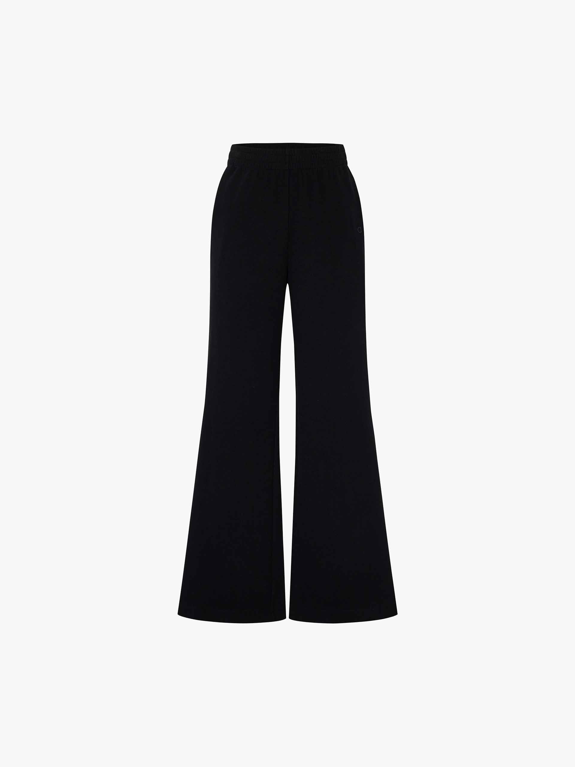 Channel effortless 70s-inspired style with these flared trousers, featuring a dramatic silhouette that flows from the hip for a graceful, leg-lengthening effect. Designed for ultimate comfort, they feature an elasticated waistband with a discreet inner drawstring for a customizable, secure fit. Complete with functional side pockets and a subtle embroidered logo, they masterfully blend retro flair with modern, practical design.