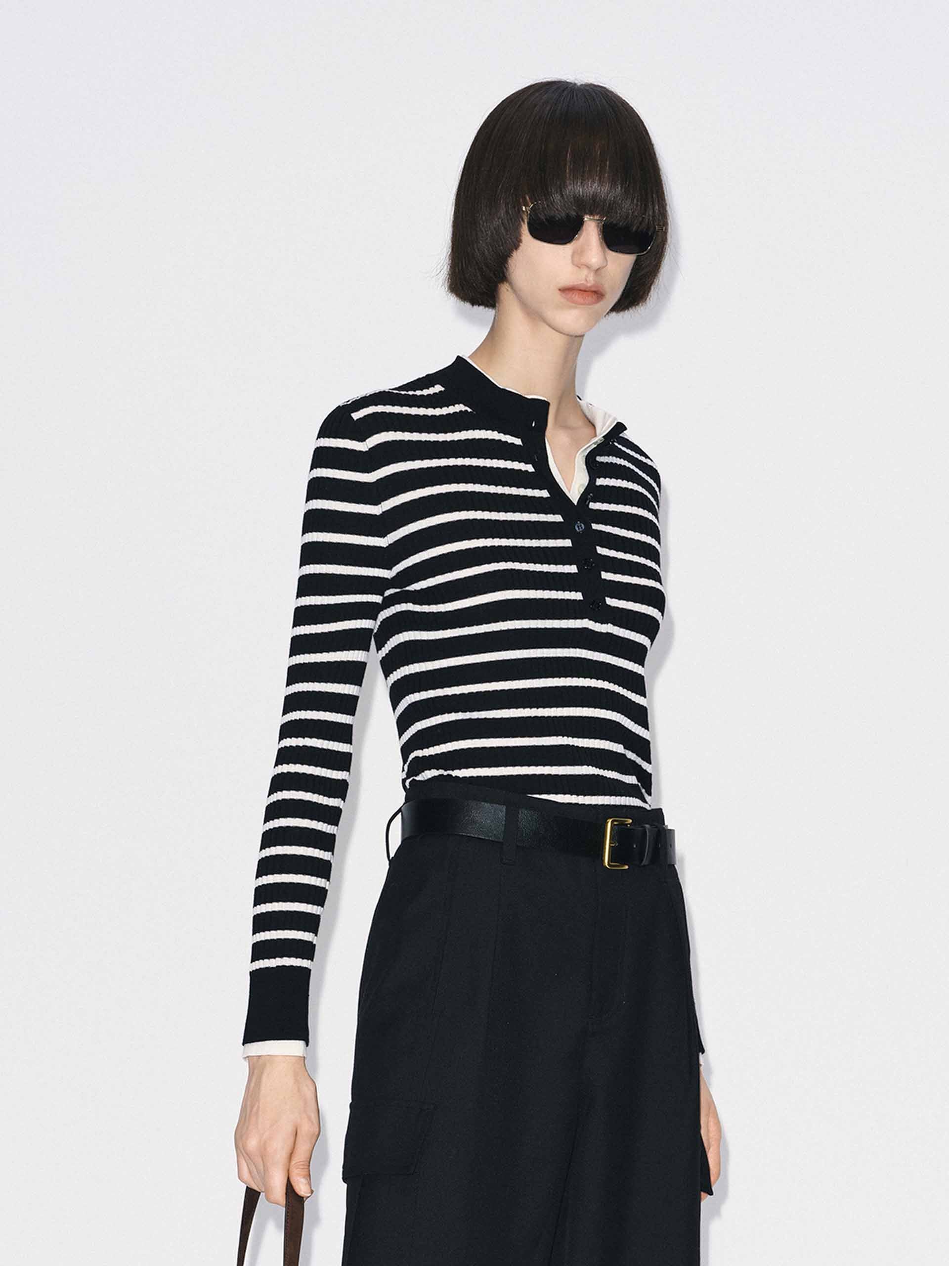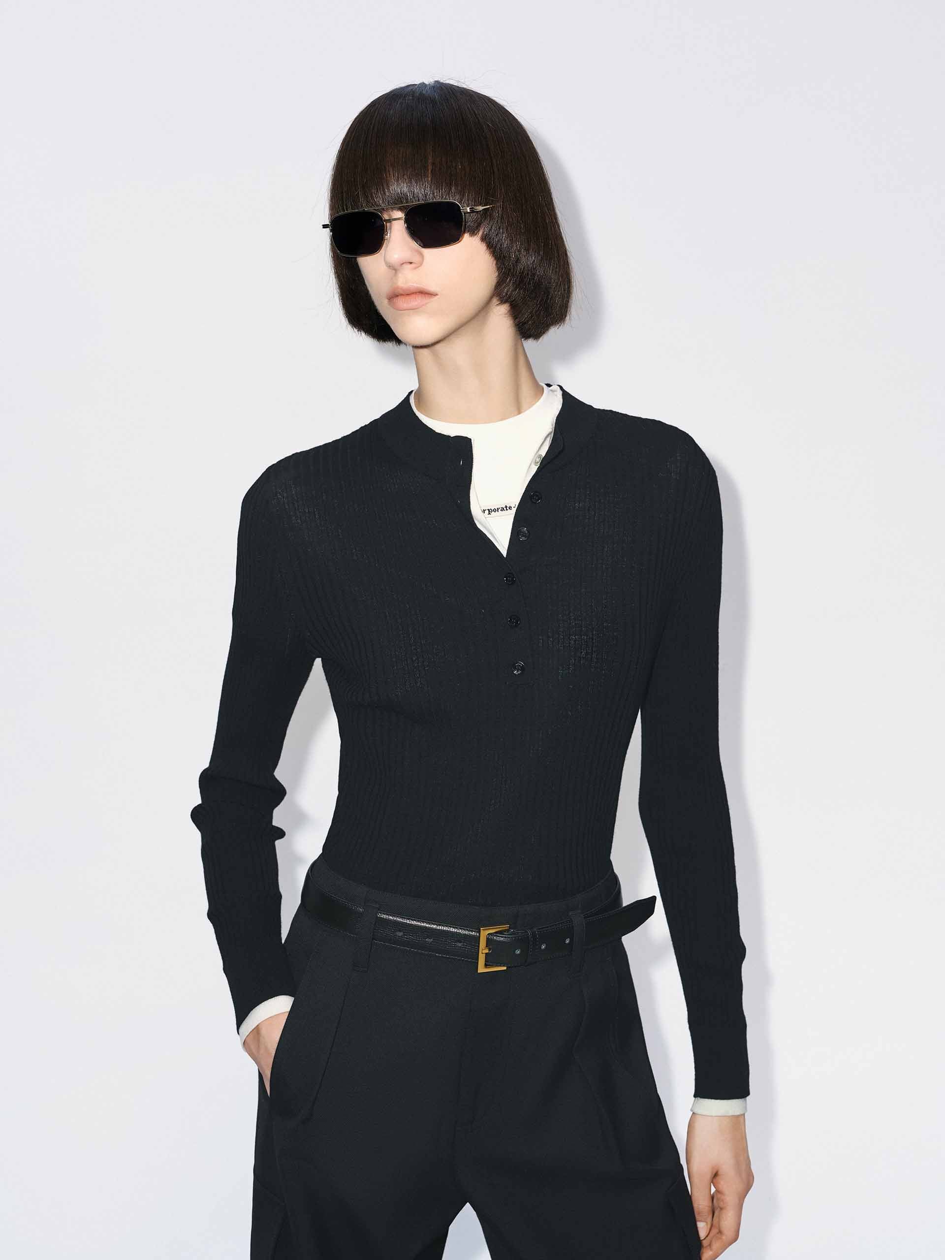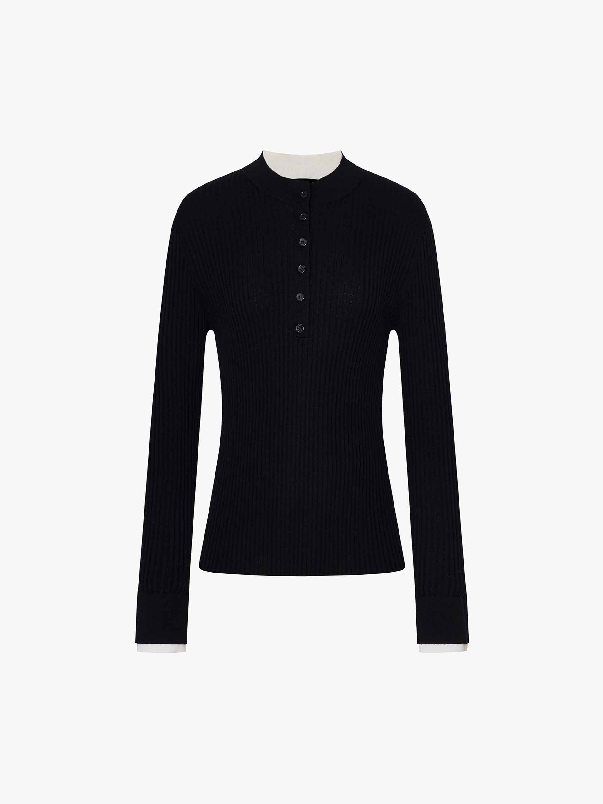This sweater features a flattering slim fit that elegantly contours to your shape. The versatile round neck and elegant half-button closure offer a unique blend of classic style and modern detail. Its defining feature is a striking contrast layered design, meticulously crafted from a luxuriously soft knitted fabric to create a visually captivating texture that adds depth and dimension to your everyday wardrobe.