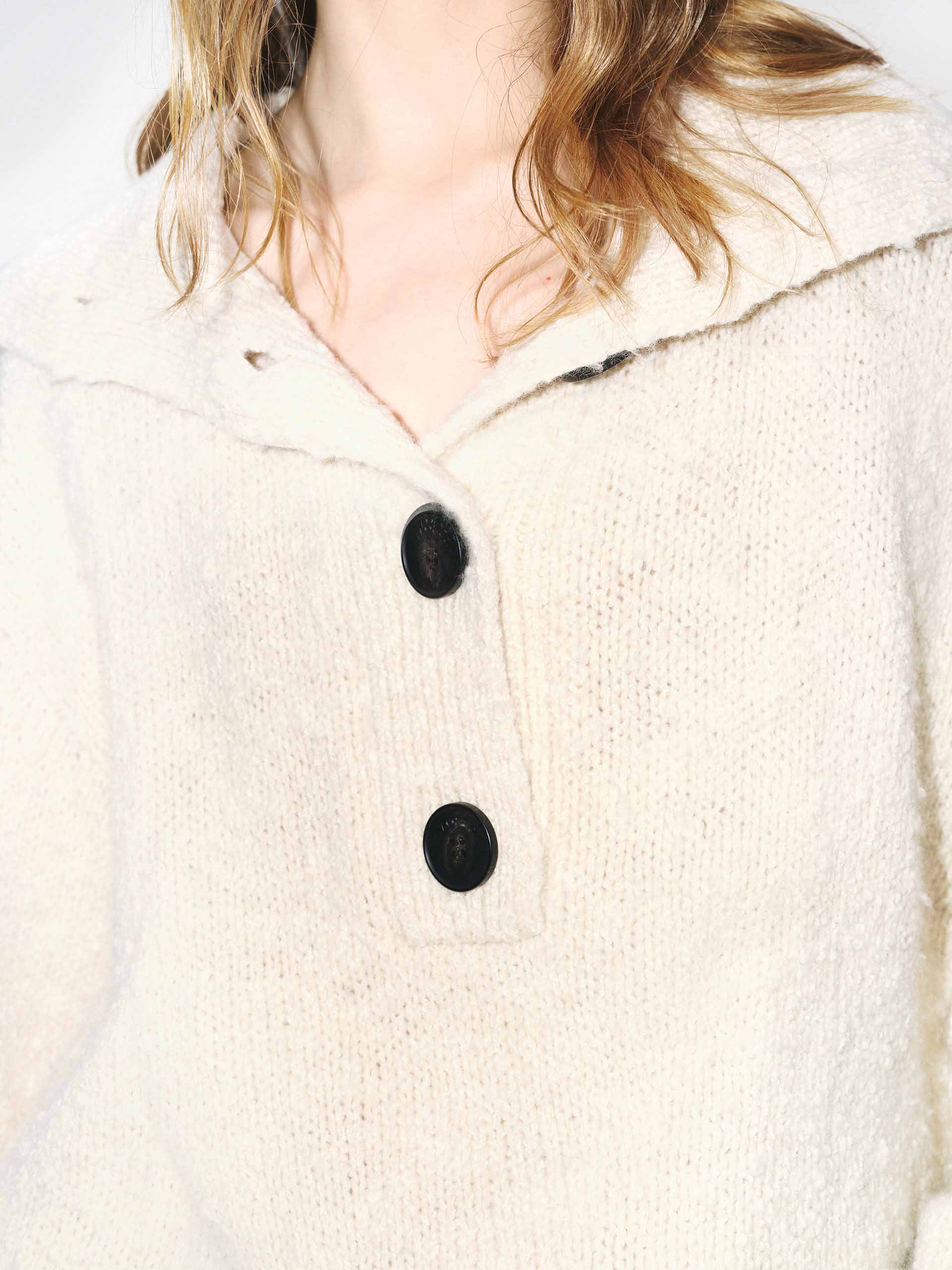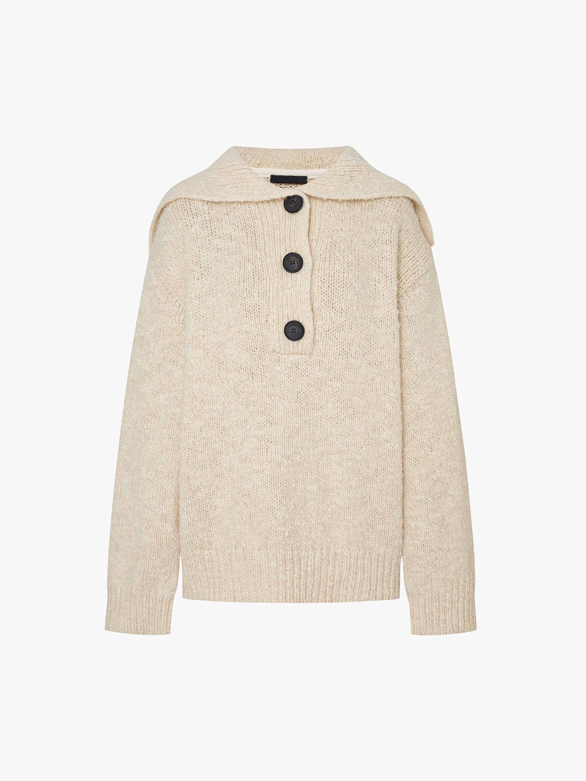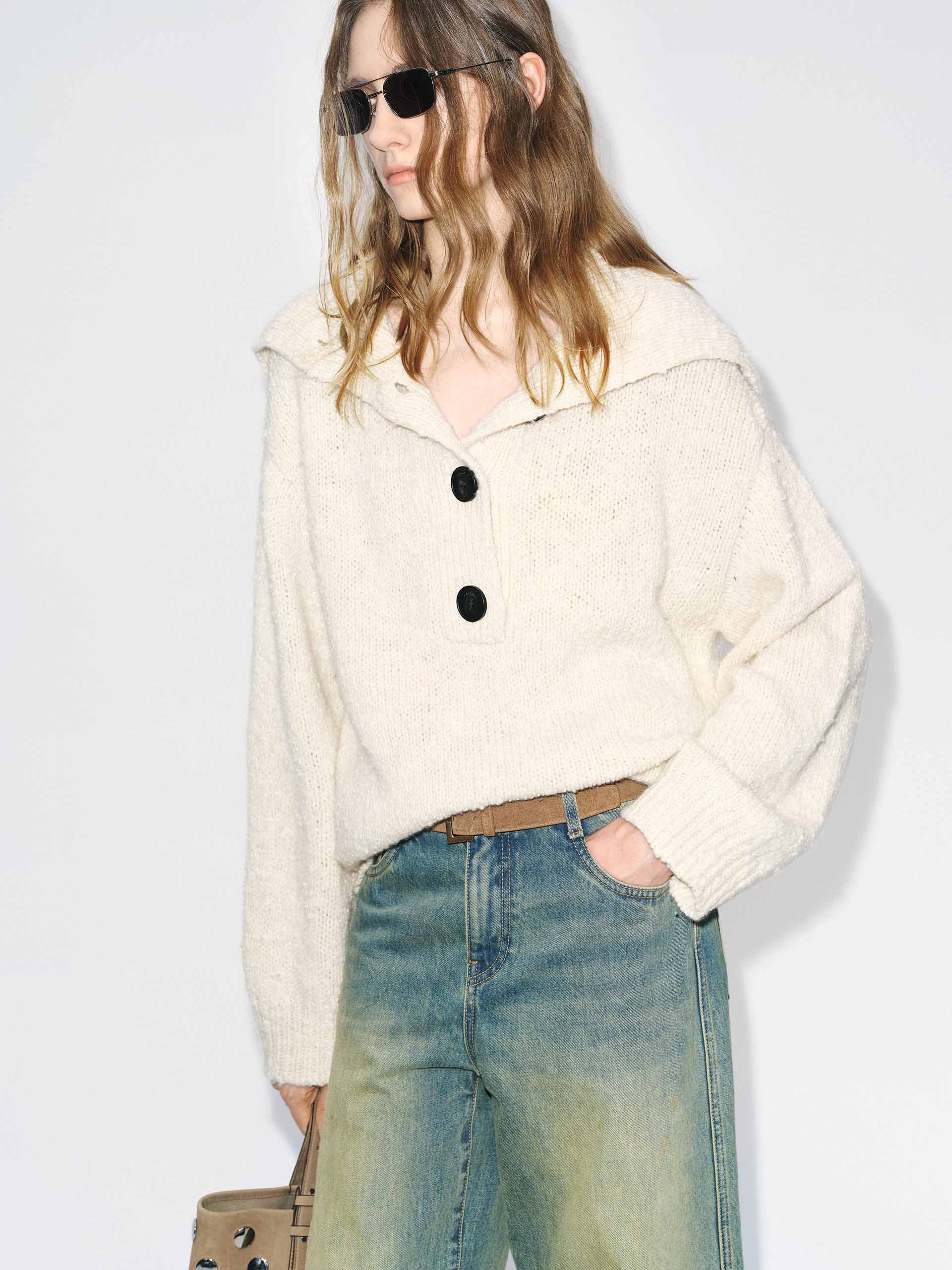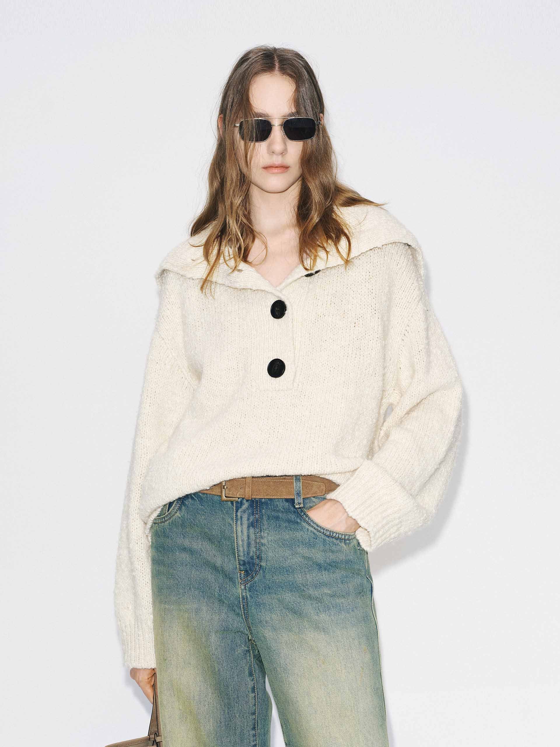 Embrace relaxed sophistication with this sweater. The distinctive half-button closure and stylish wide collar create a modern, versatile neckline, perfect for layering. Enhanced by a contemporary dropped shoulder cut and a finely detailed ribbed neckline, this piece offers a perfect balance of soft, textured fabric and intentionally undone elegance.