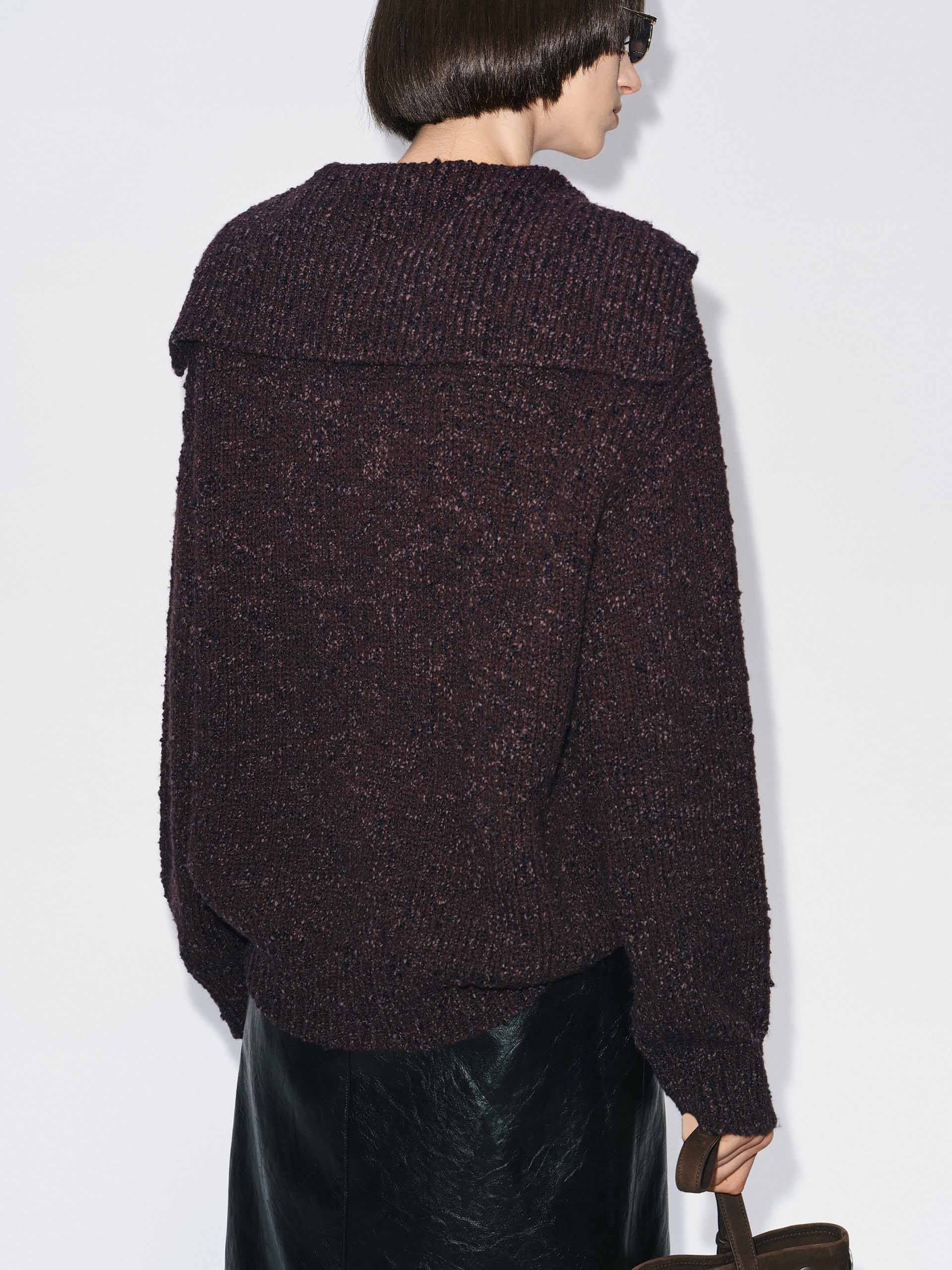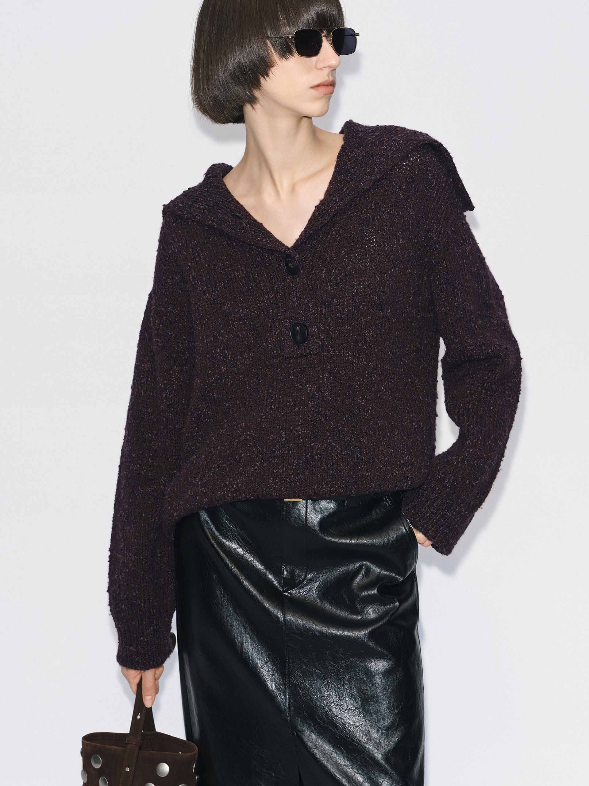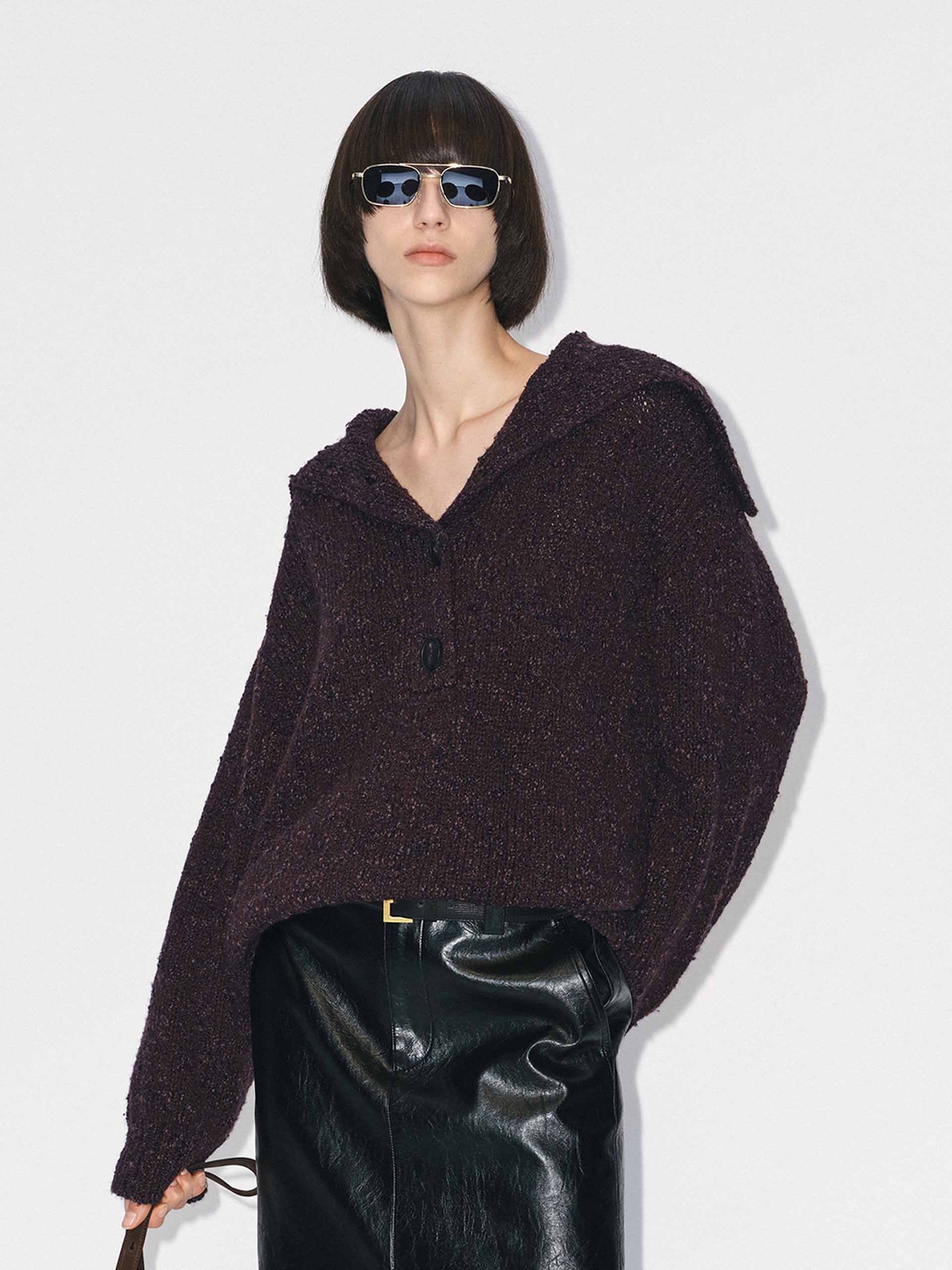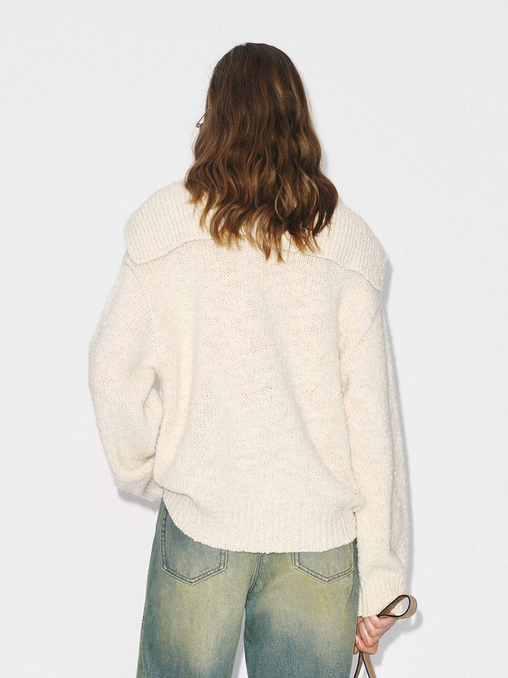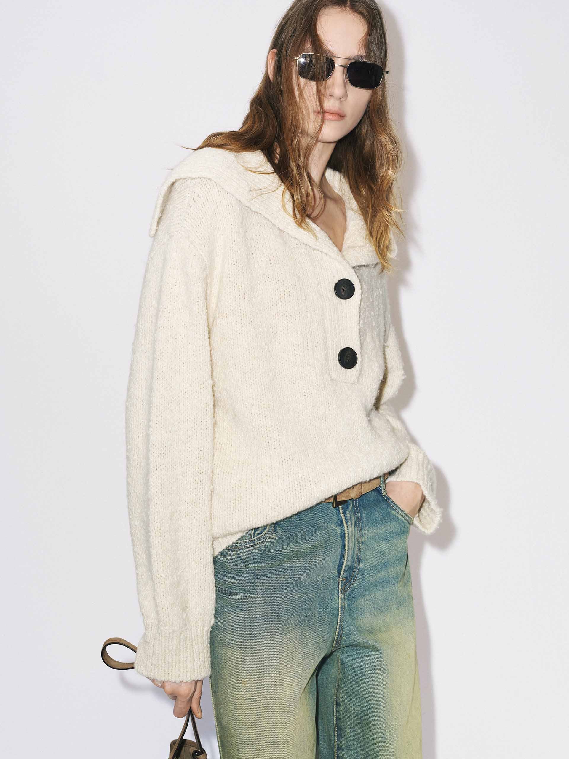Embrace relaxed sophistication with this sweater. The distinctive half-button closure and stylish wide collar create a modern, versatile neckline, perfect for layering. Enhanced by a contemporary dropped shoulder cut and a finely detailed ribbed neckline, this piece offers a perfect balance of soft, textured fabric and intentionally undone elegance.