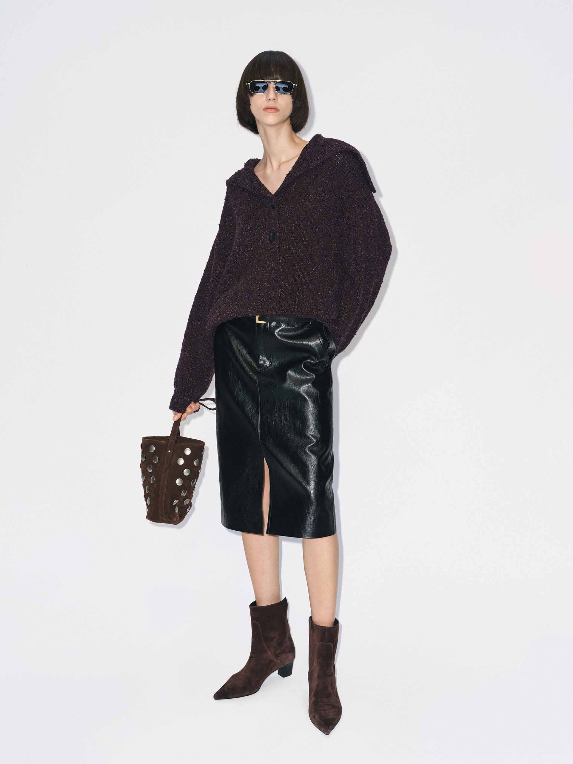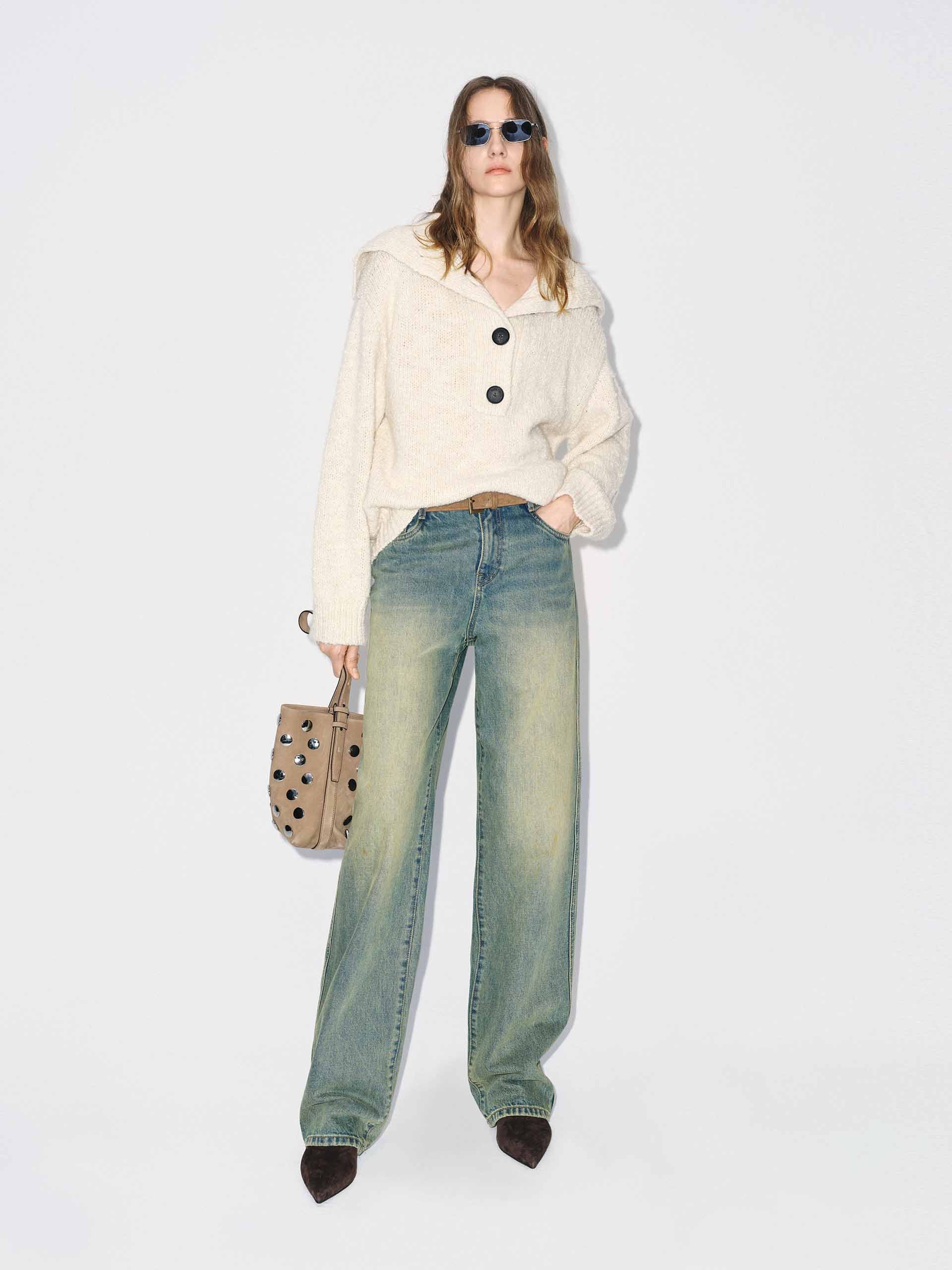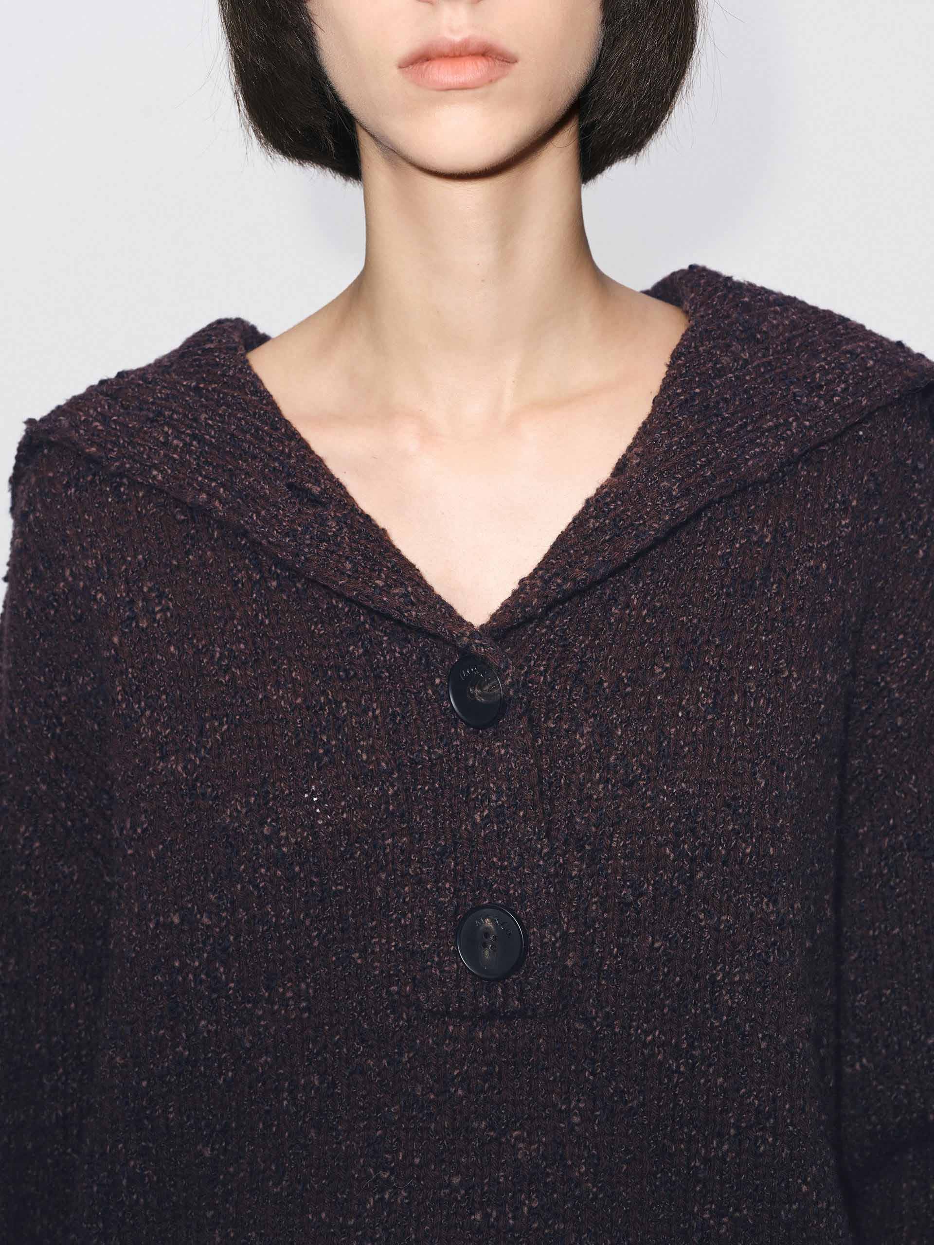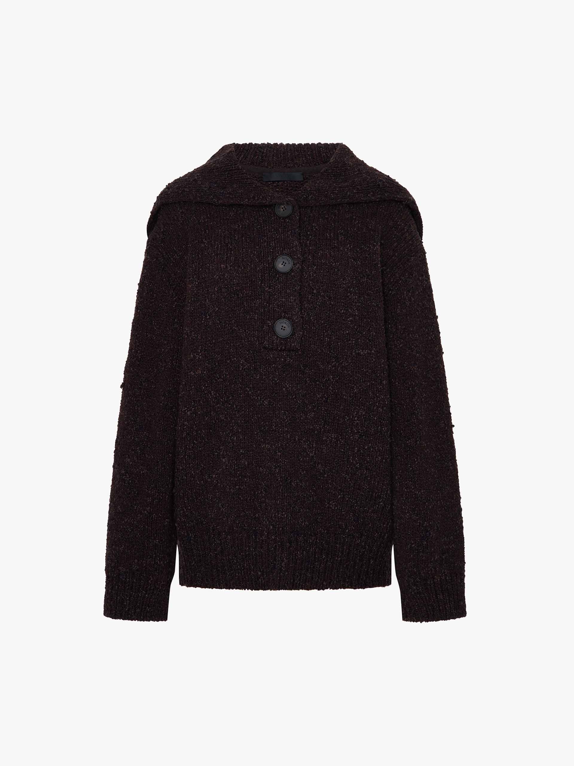 Embrace relaxed sophistication with this sweater. The distinctive half-button closure and stylish wide collar create a modern, versatile neckline, perfect for layering. Enhanced by a contemporary dropped shoulder cut and a finely detailed ribbed neckline, this piece offers a perfect balance of soft, textured fabric and intentionally undone elegance.