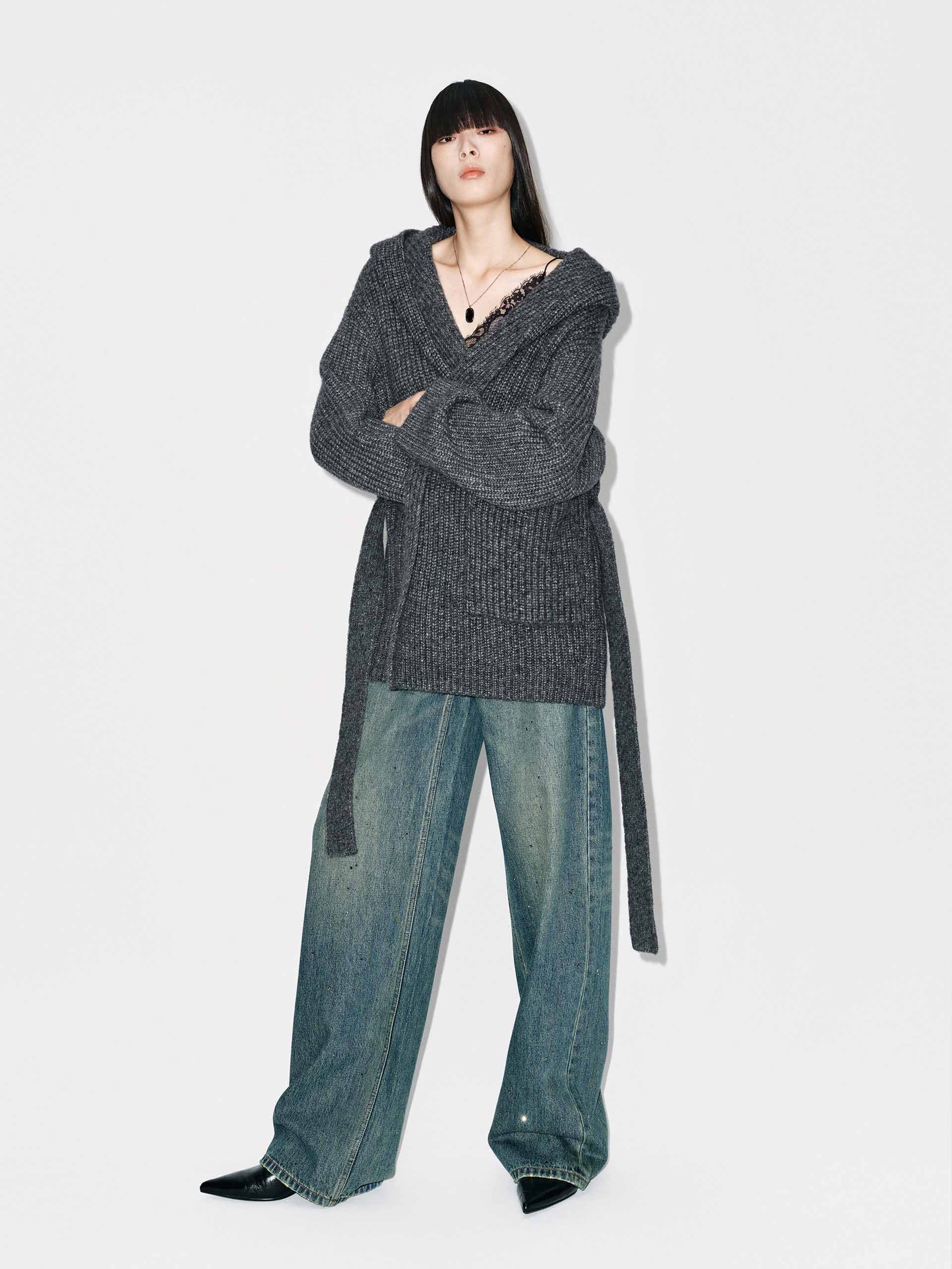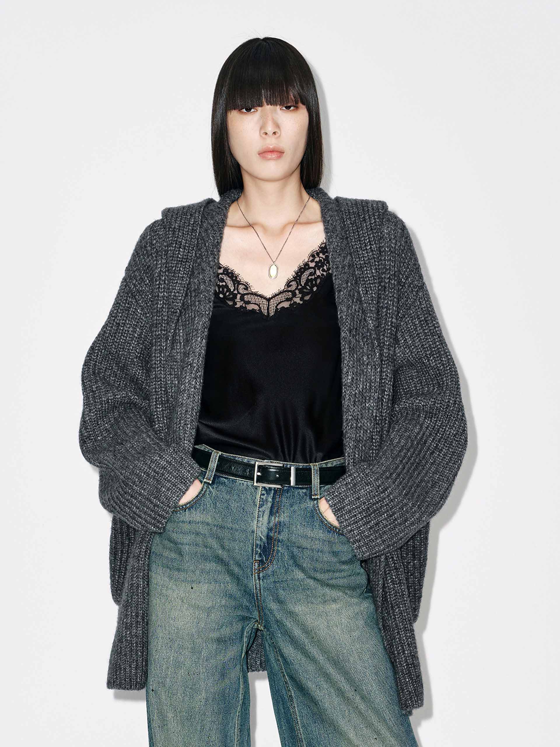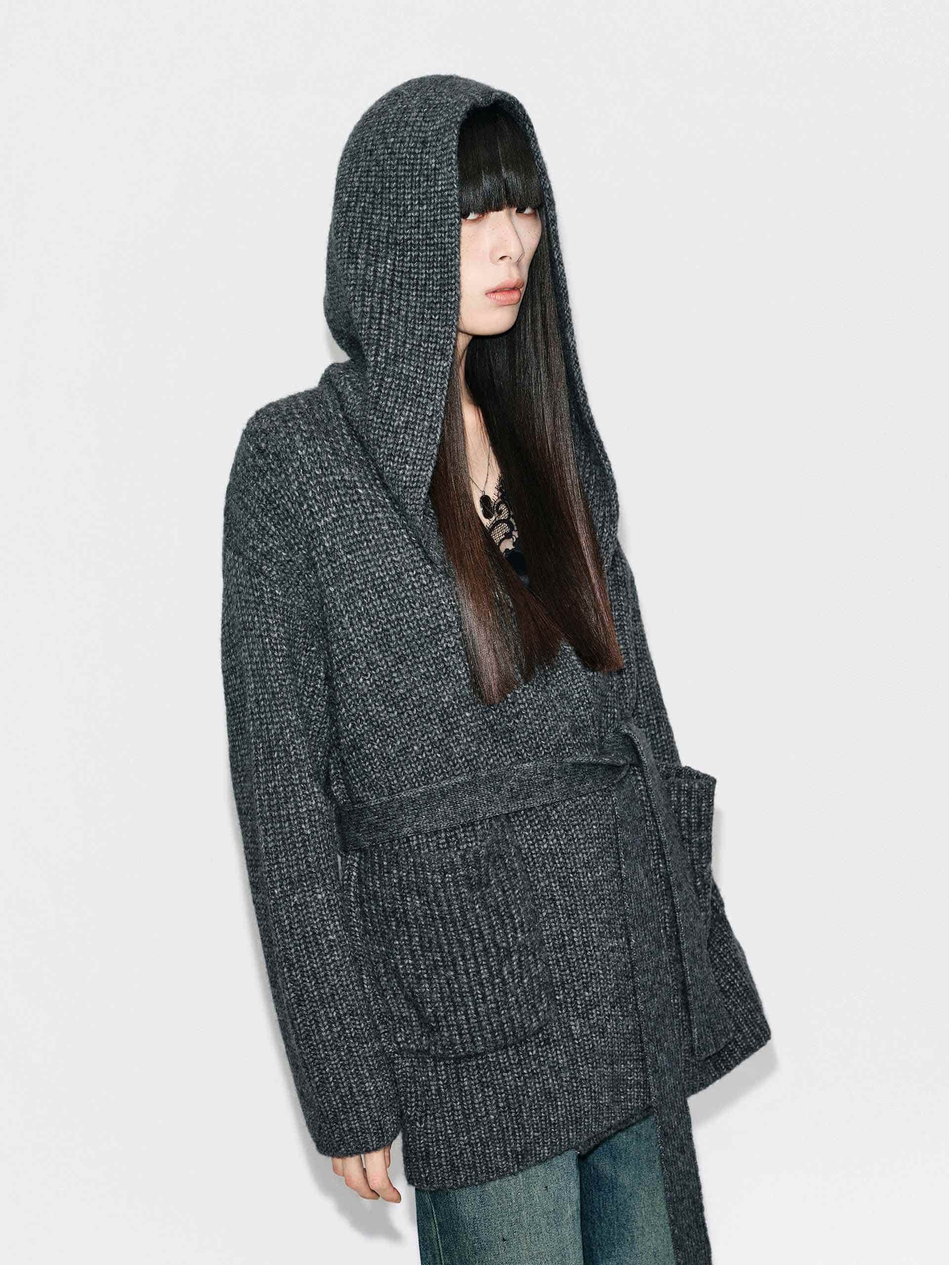 Embrace cozy sophistication with this cardigan, designed for ultimate comfort in a generously loose fit. The contemporary dropped shoulder and roomy hood create a modern, effortless silhouette, while the practical patch pockets add a touch of utility. A matching belt at the waist allows you to cinch the cardigan for a subtly defined shape, offering a perfect balance between unstructured ease and polished intention.