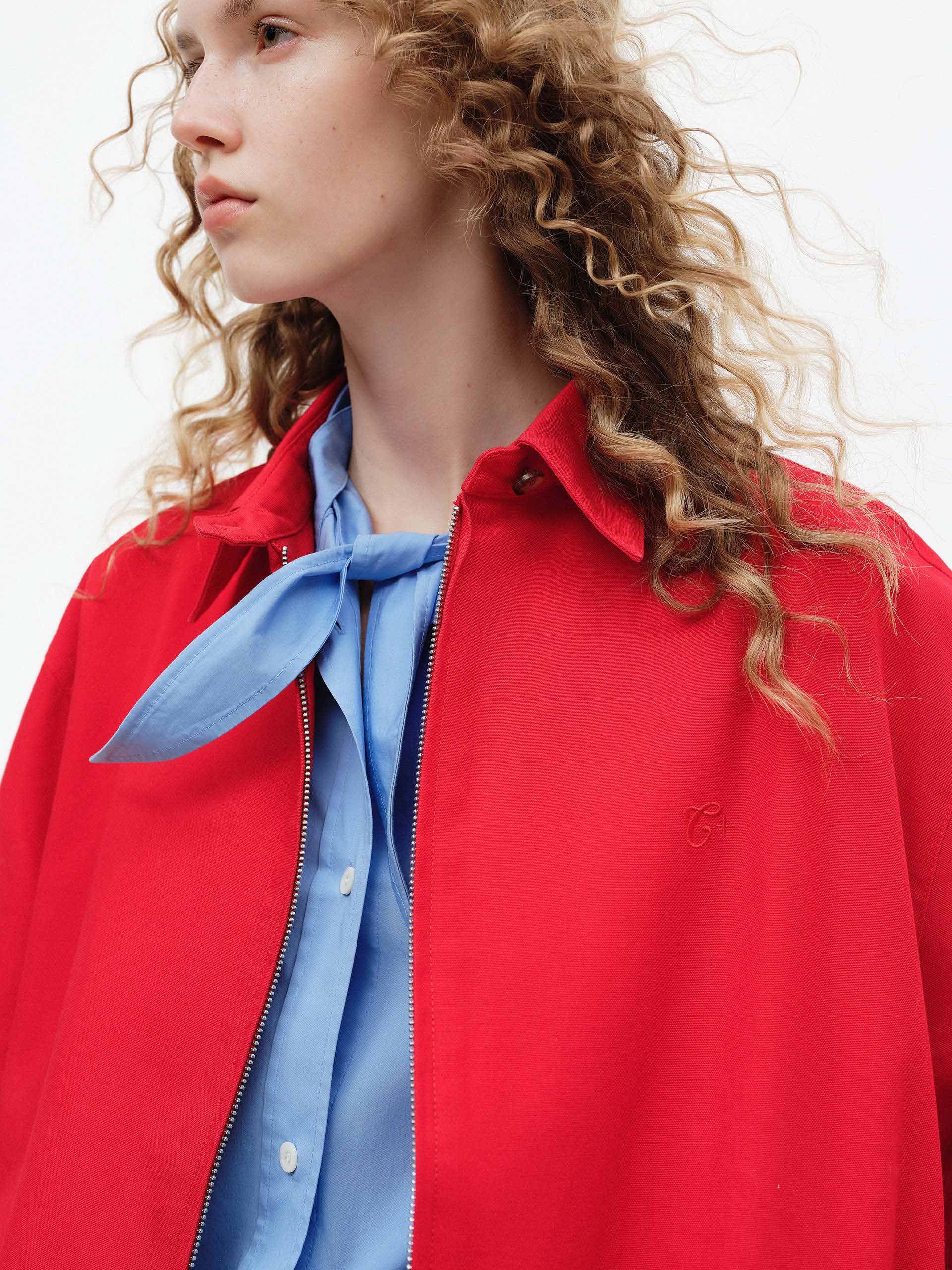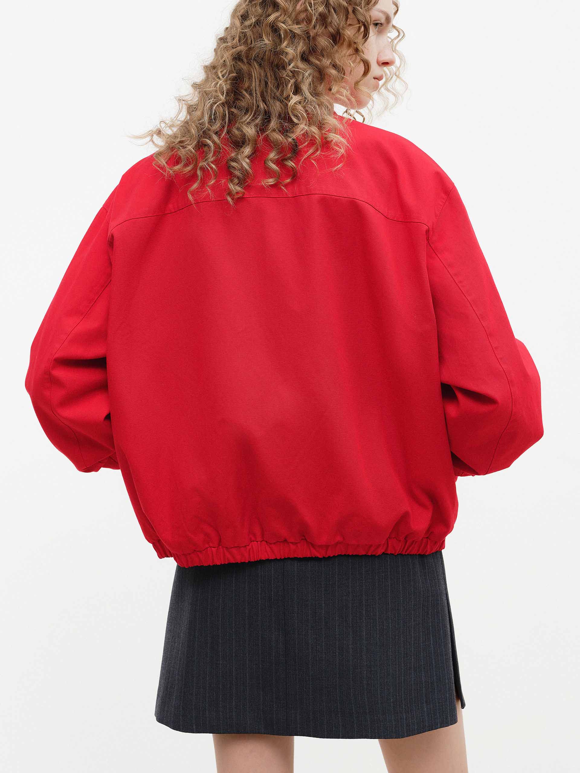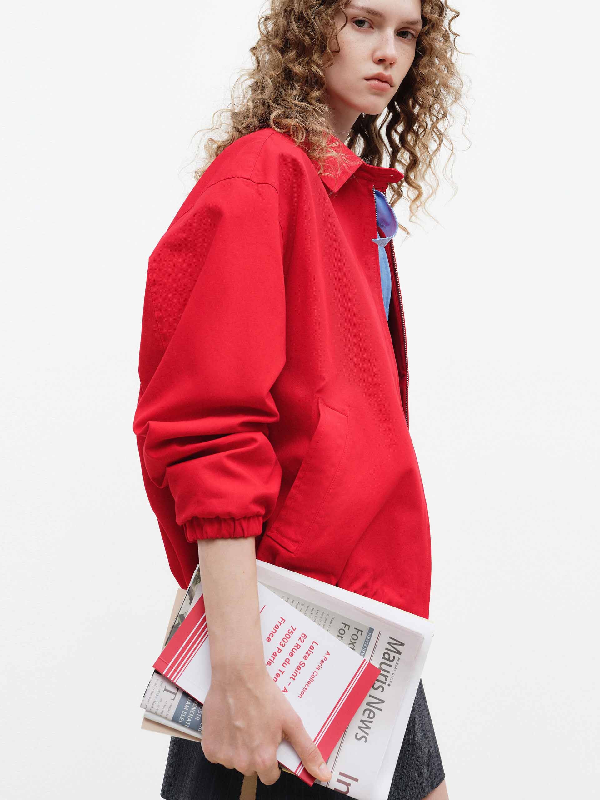This all-cotton jacket features a fitted cut with a snap-on pointed lapel and ribbed stretch cuffs and hem for enhanced comfort and a sporty feel. The vibrant red hue is striking and adds a touch of energy and effortless style to everyday looks.