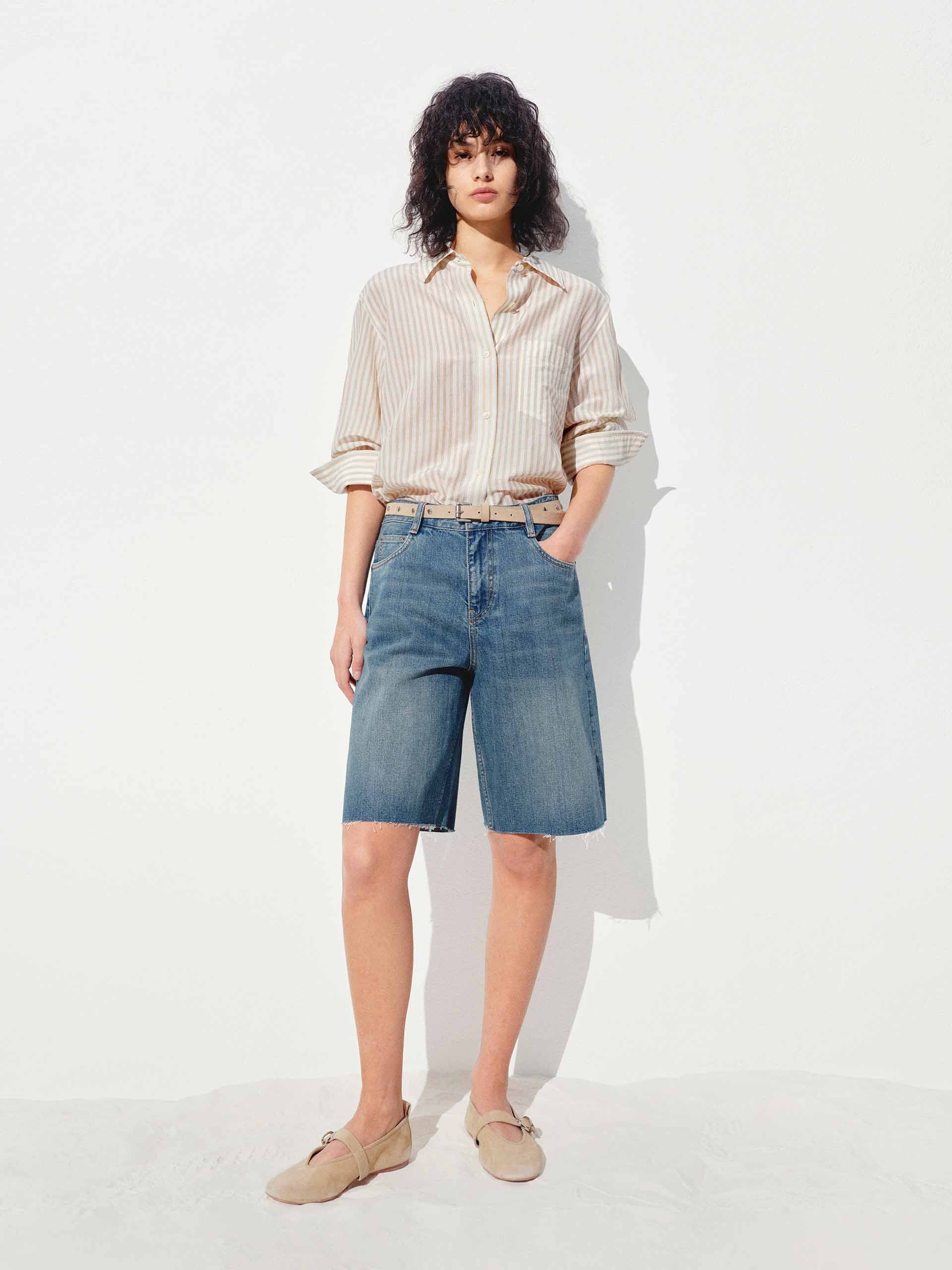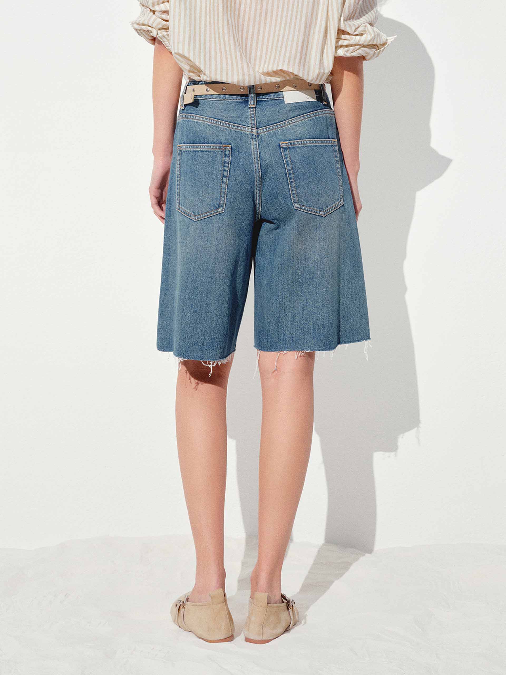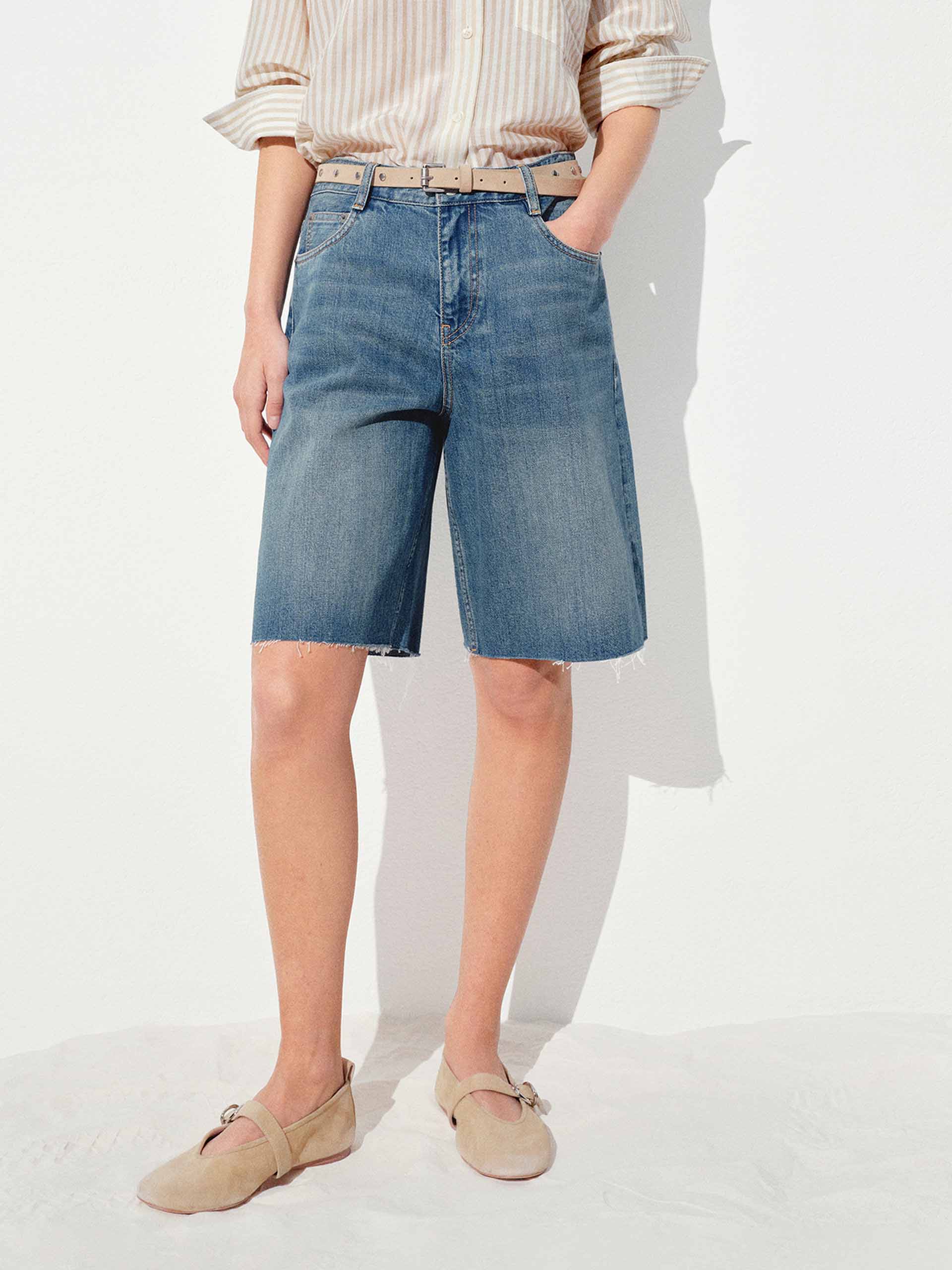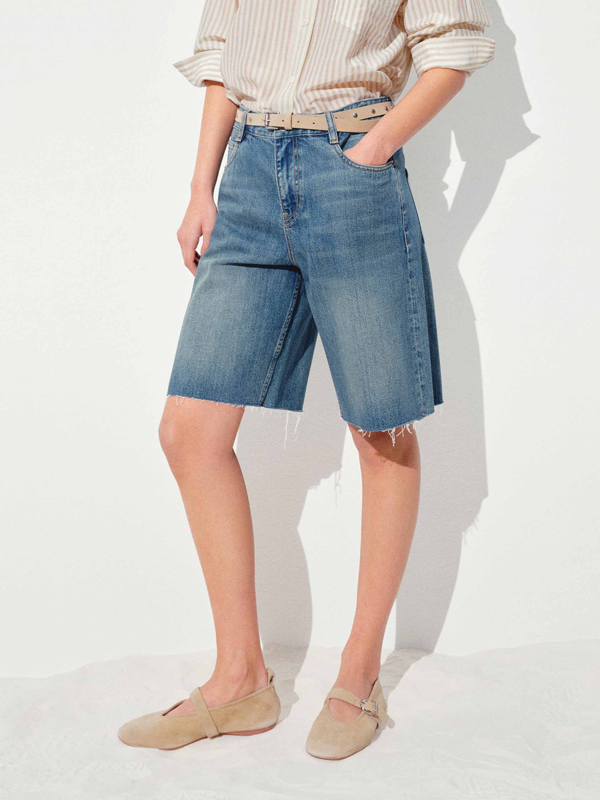These denim shorts blend laid-back comfort with rugged charm, featuring a soft, faded wash that gives them instant vintage character. The raw hem adds an edgy touch, while the classic five-pocket design keeps them functional and stylish. Whether you're dressing them up with a blouse or a t-shirt, these shorts are a warm-weather essential. The silk scarf is included.