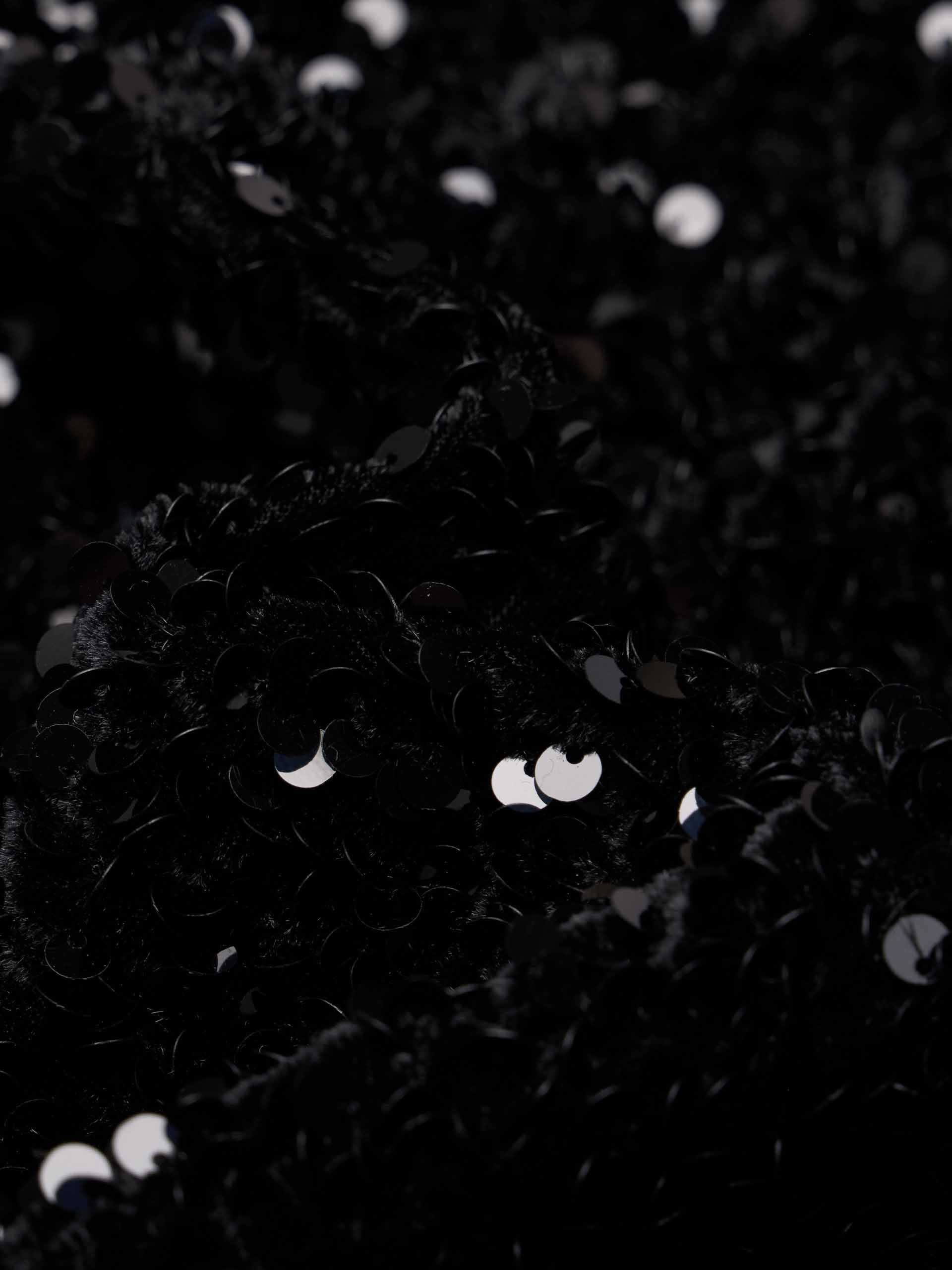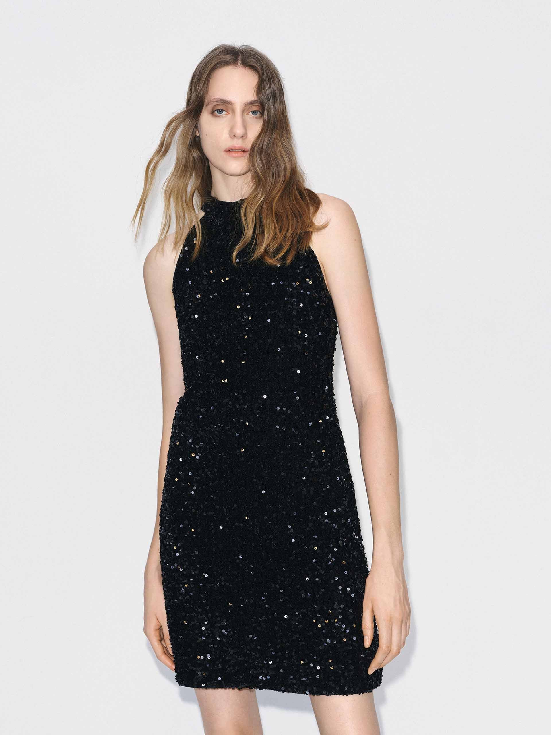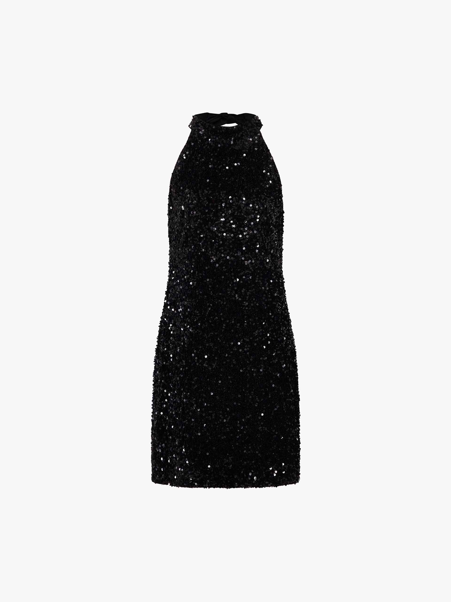 This dress is designed to create a truly unforgettable and glamorous statement. The dazzling all-over sequin finished fabric catches the light with every movement, while the elegant back tie design adds a dramatic and sophisticated focal point. Completed with a discreet side zipper closure and a clean, sleeveless detail, this dress ensures a seamless and striking look for any special occasion.