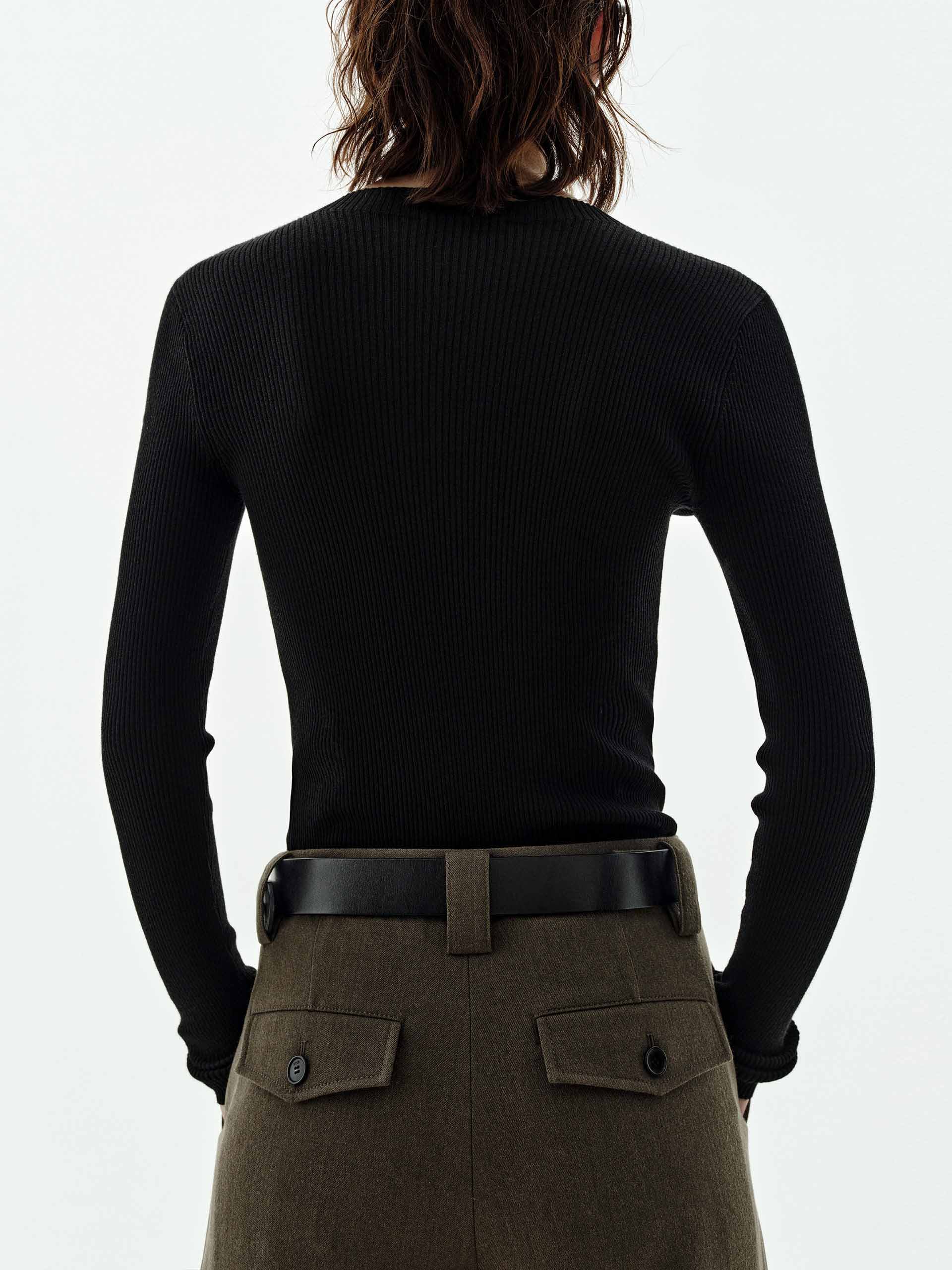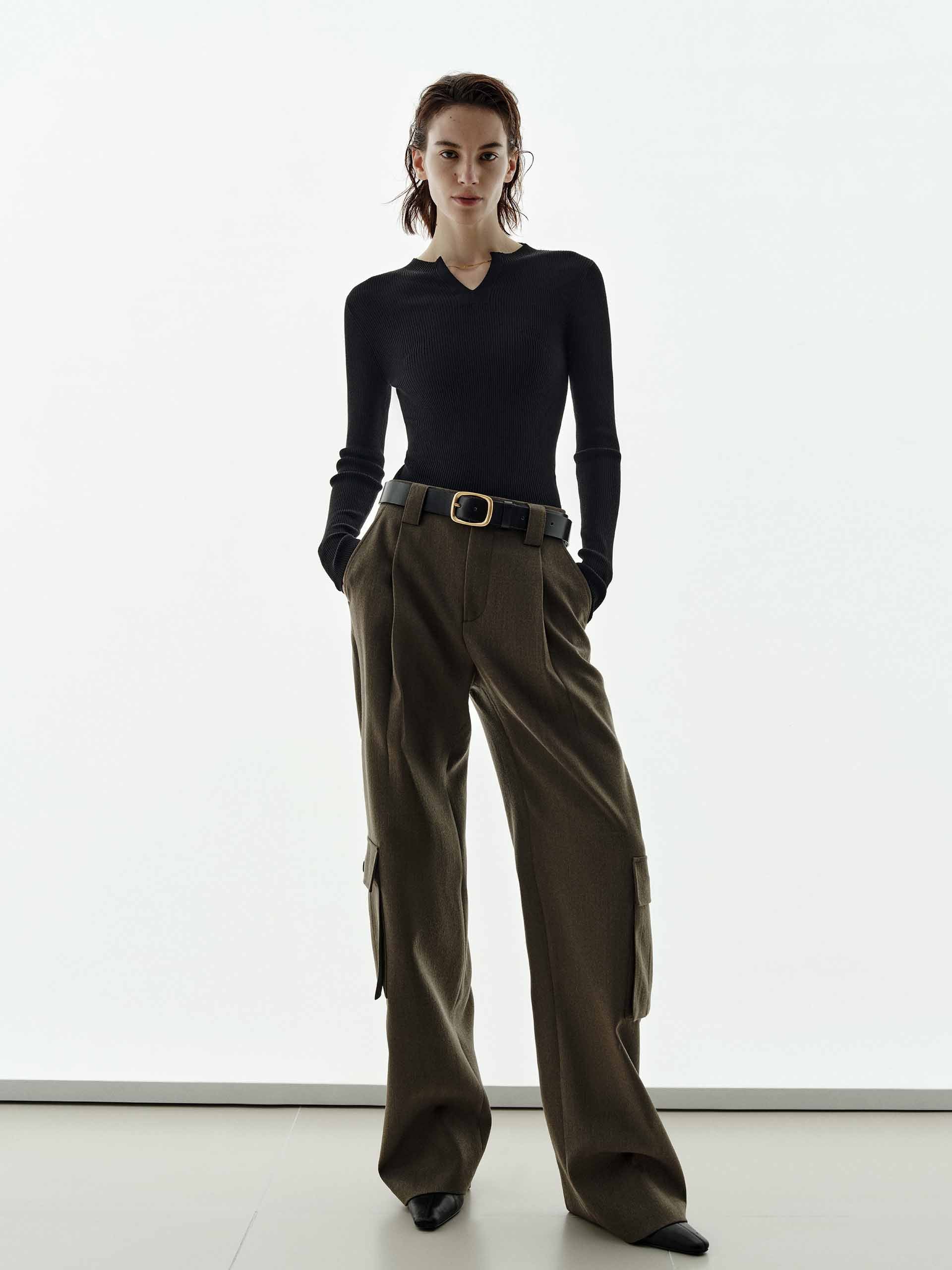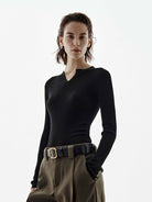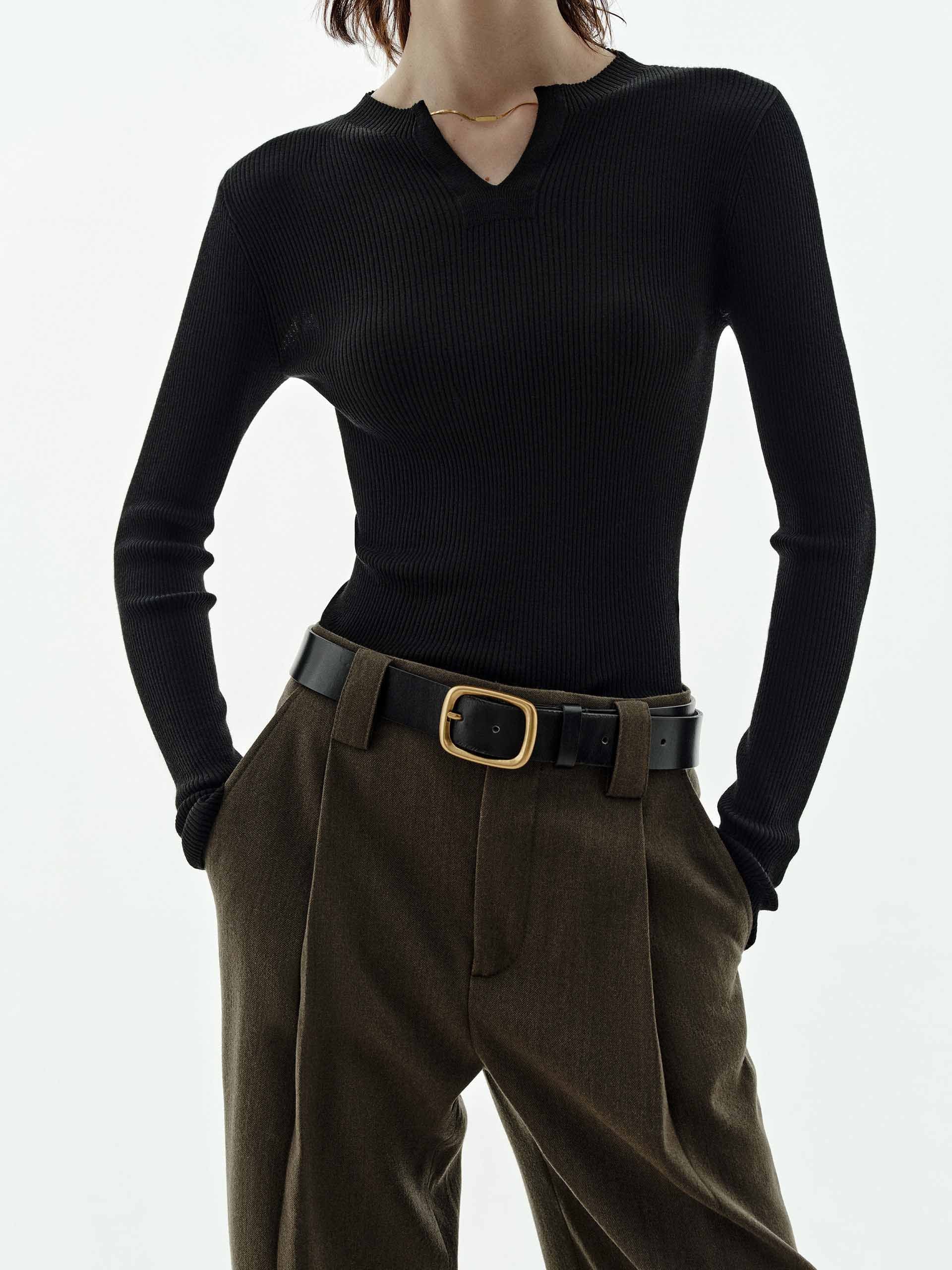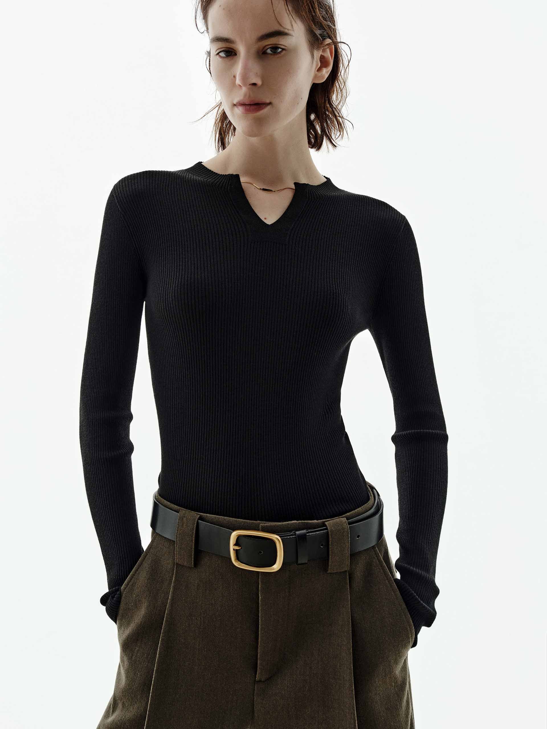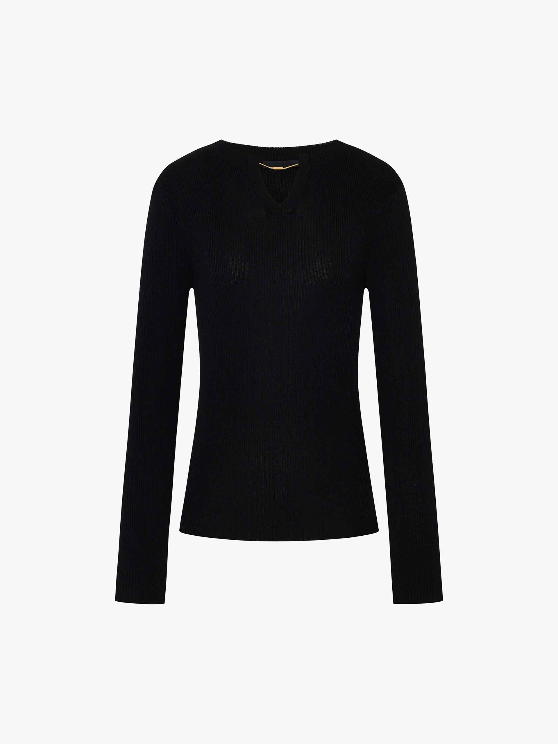 This sweater masterfully blends timeless elegance with modern, edgy sophistication. The classic V-neck is complemented by fine ribbed knitted details, ensuring structure and a polished finish. The standout feature is the front-decorated metal chain design, which adds a striking and luxurious focal point. Crafted from 100% merino wool, it provides exceptional softness, natural warmth.