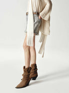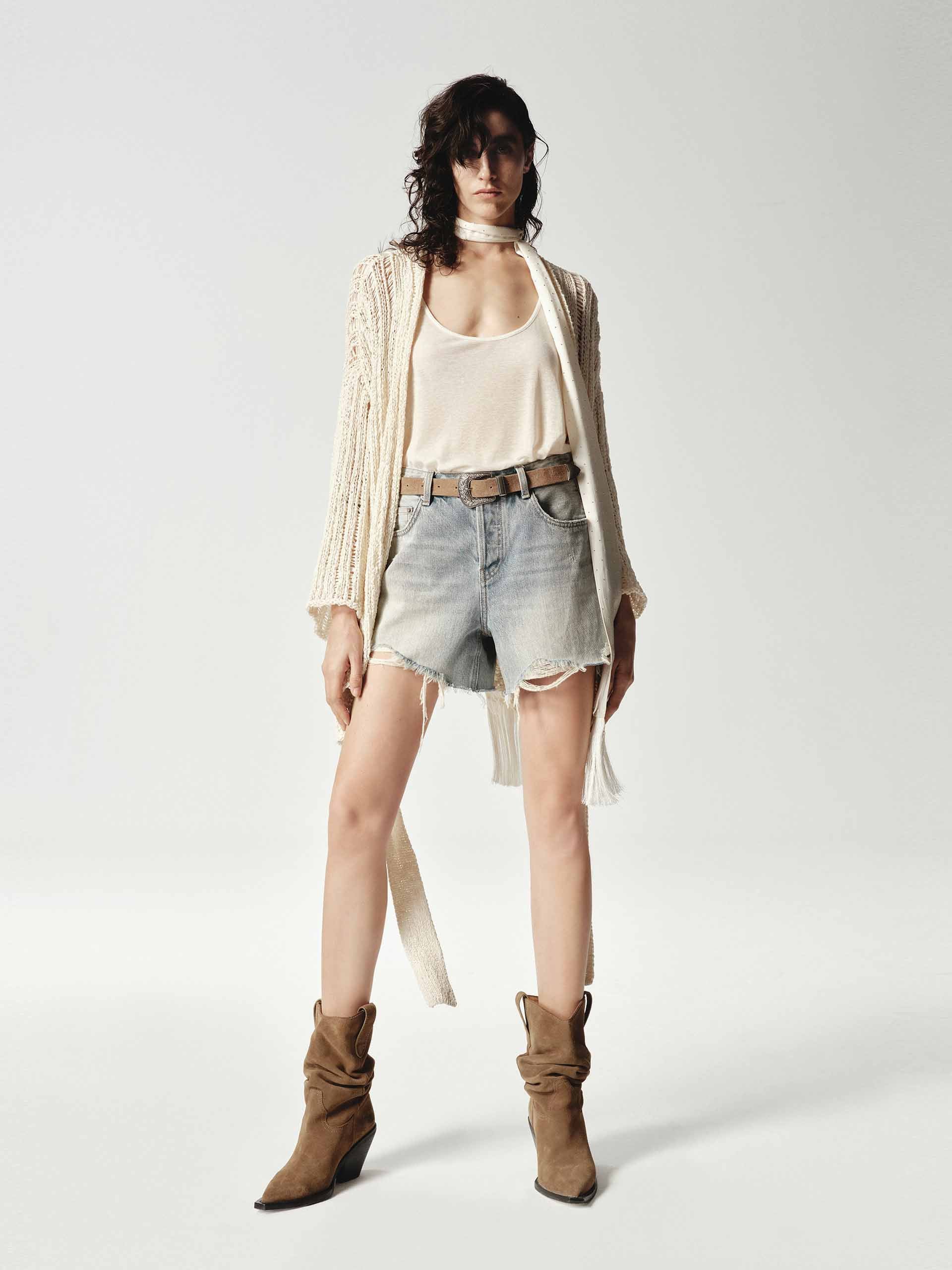 - Button closure and raw-edge details
