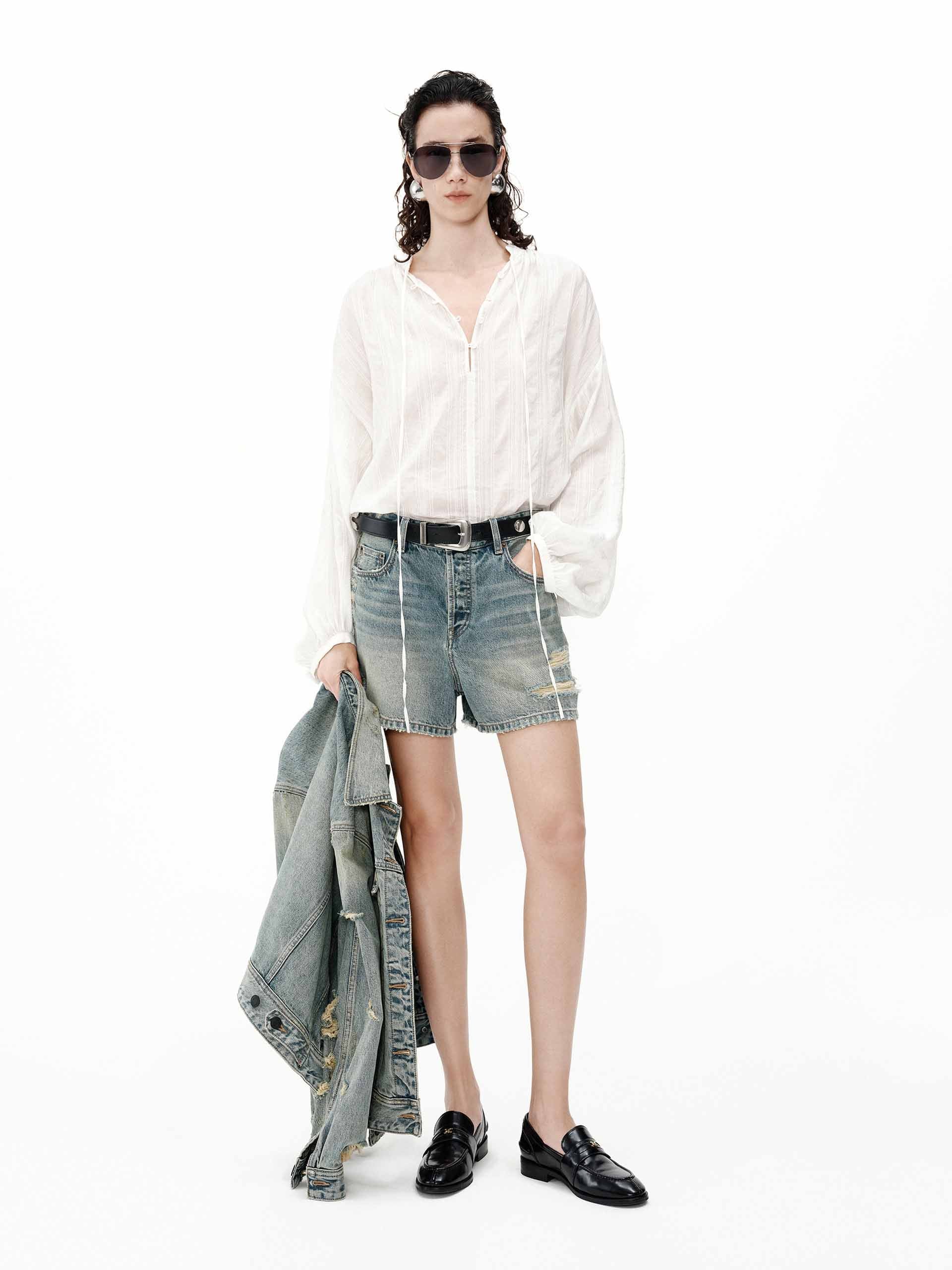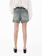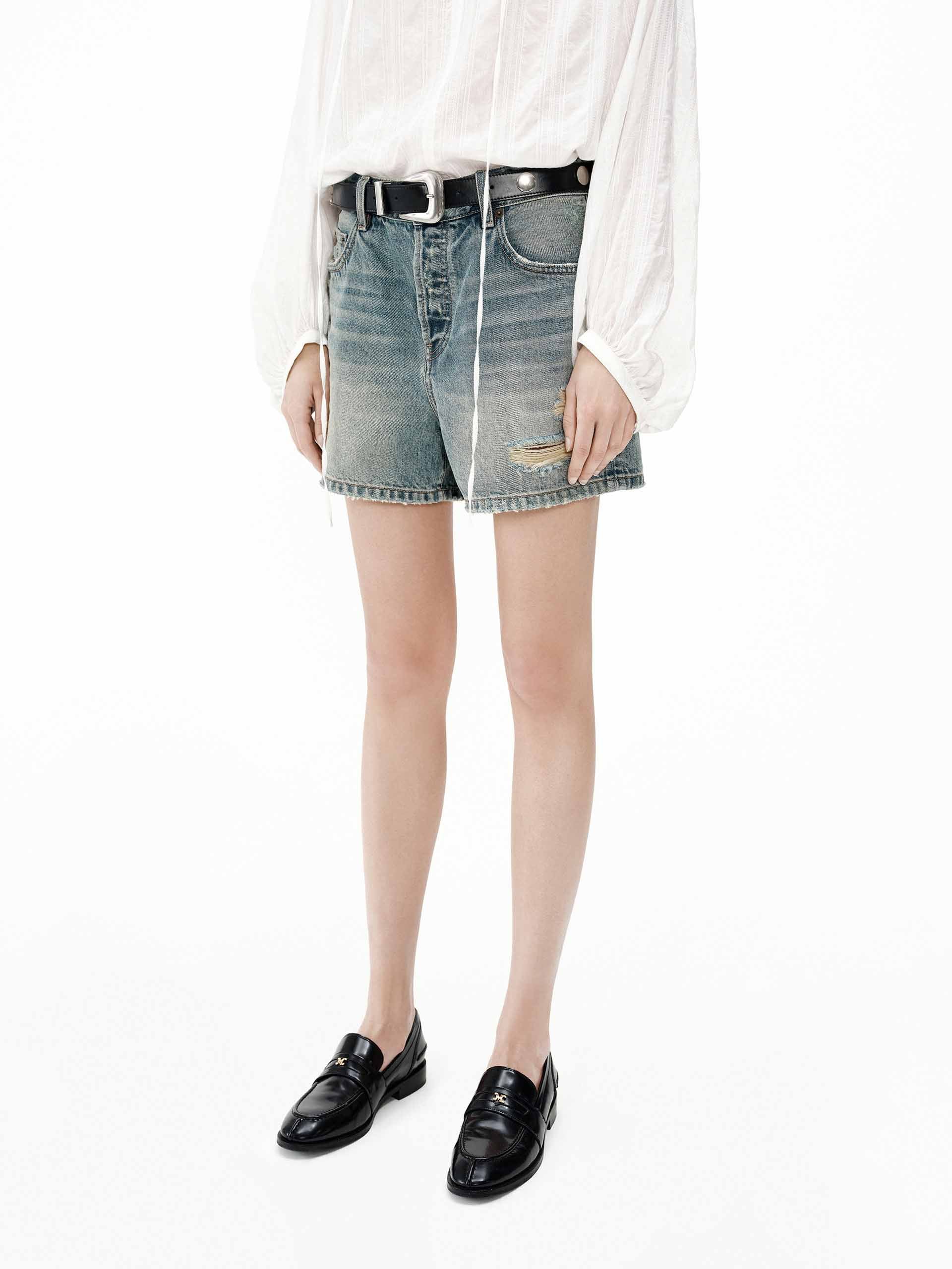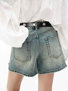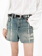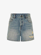 Make a bold statement with our edgy distressed denim shorts. Designed for ultimate style and comfort, our distressed shorts offer a vintage and worn-in look with their distressed and faded detailing. The button closure and back logo add a touch of sophistication to these must-have denim shorts, perfect for any casual occasion.