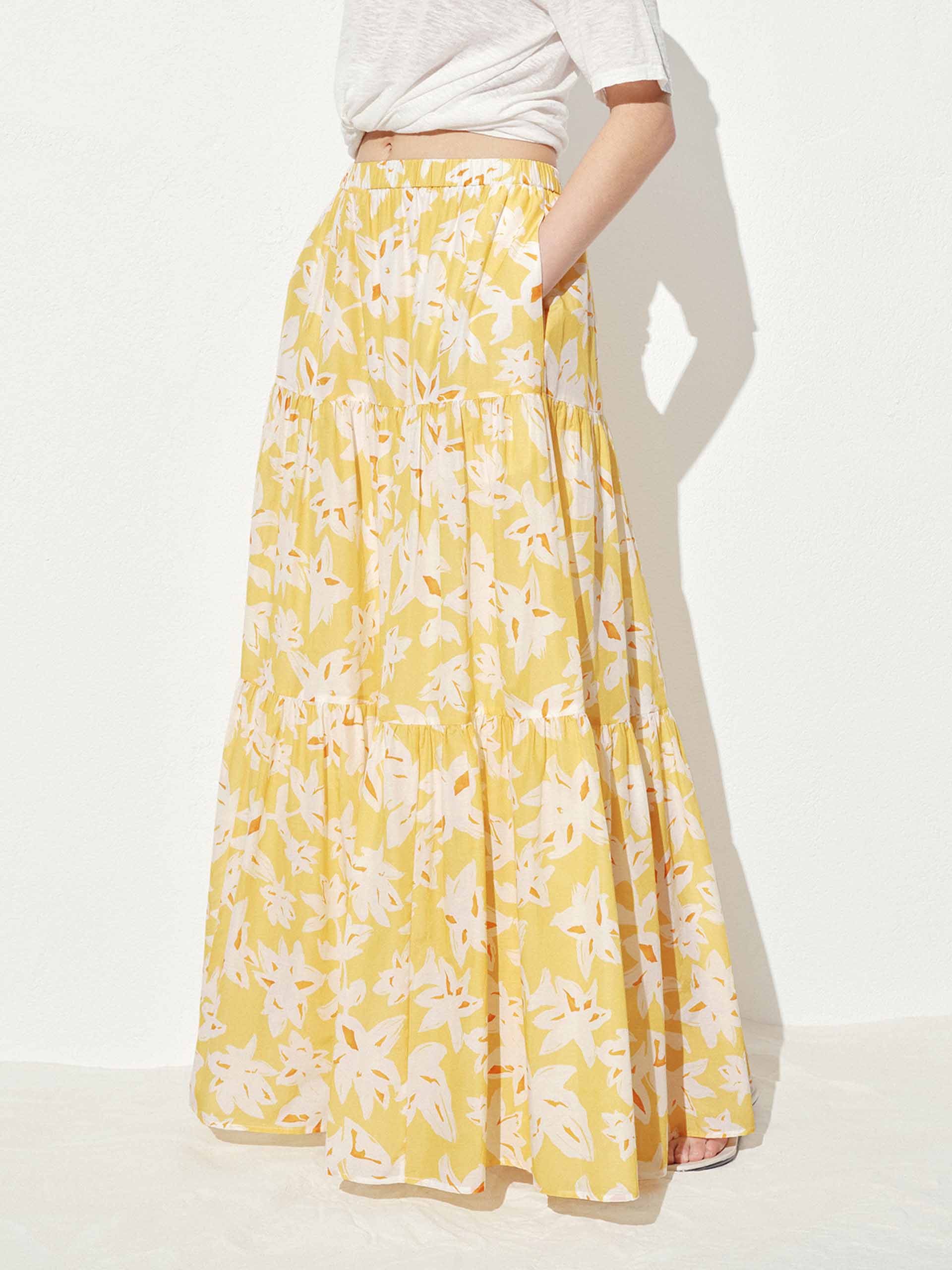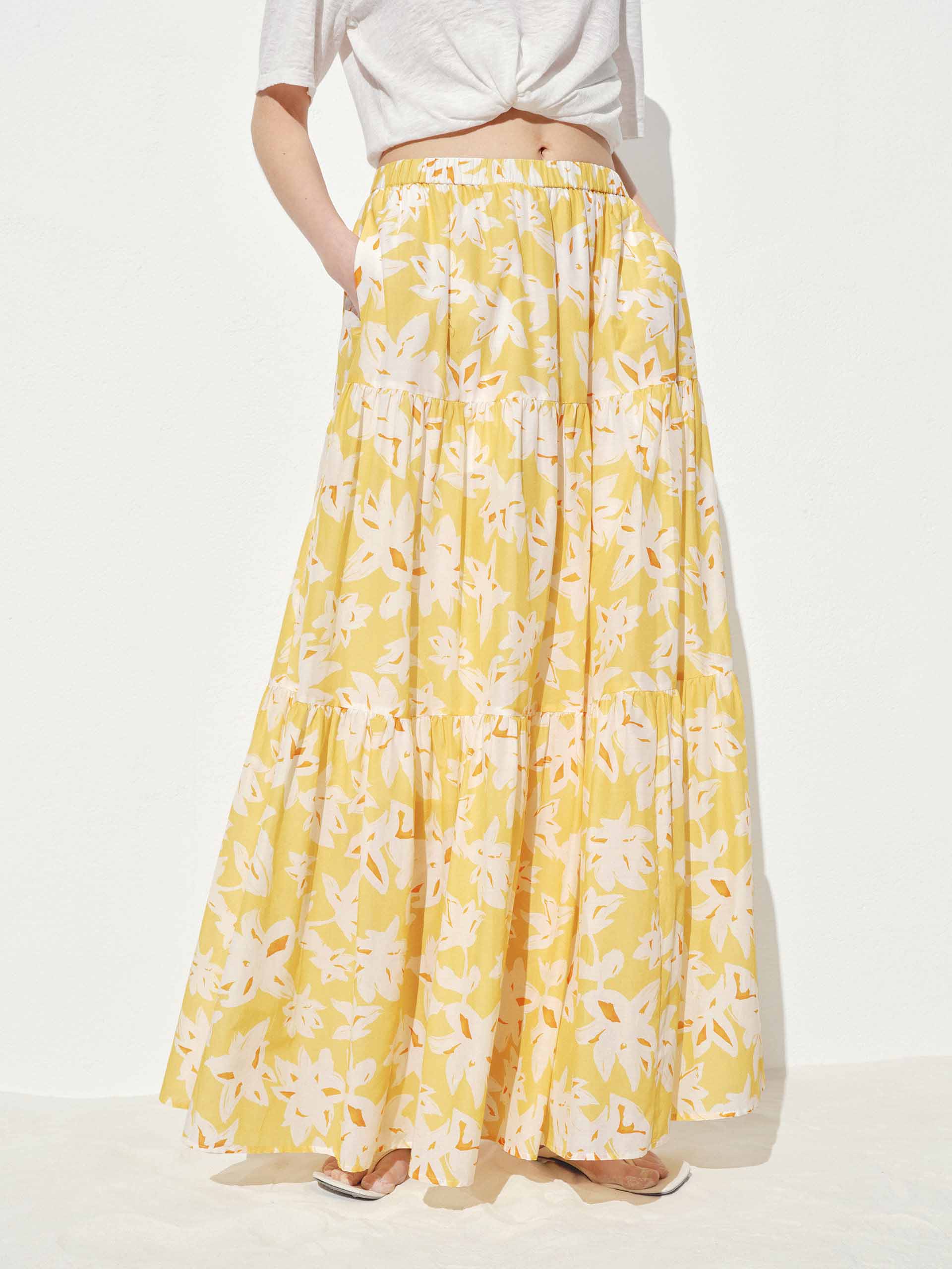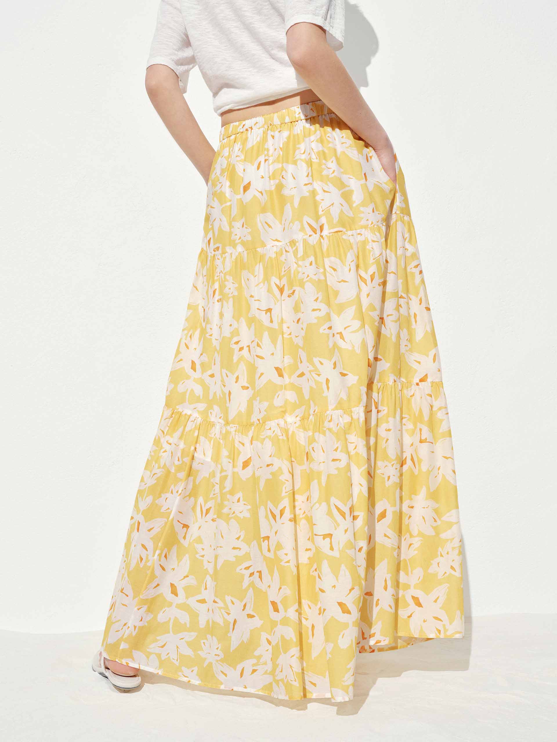 Embrace the romance of spring with this flowy floral maxi skirt. The elasticated waistband offers all-day comfort while creating a flattering silhouette, and side pockets add practical charm to this poetic piece. Delicate pleated detailing amplifies the skirt's movement, making each step a visual delight.