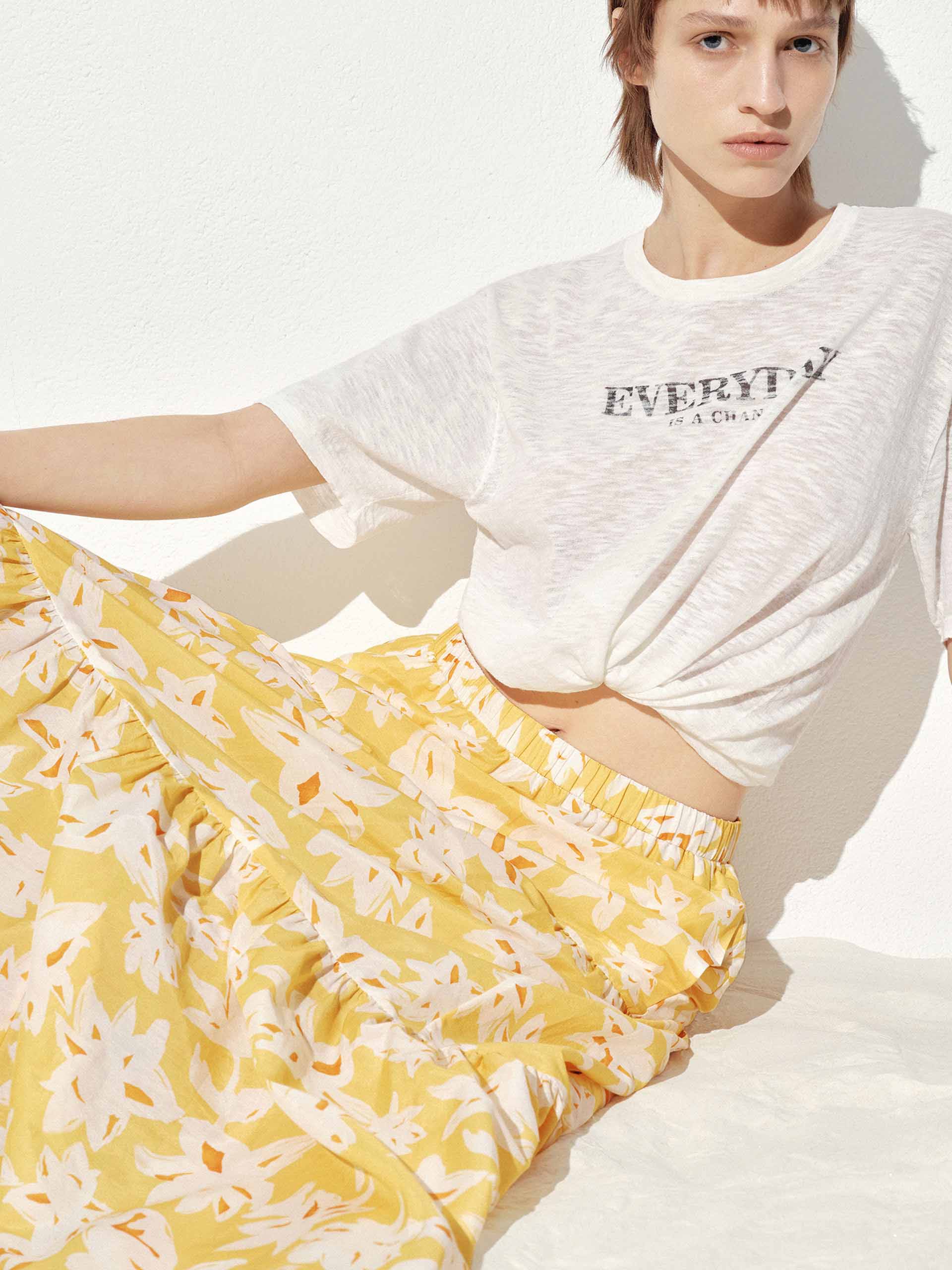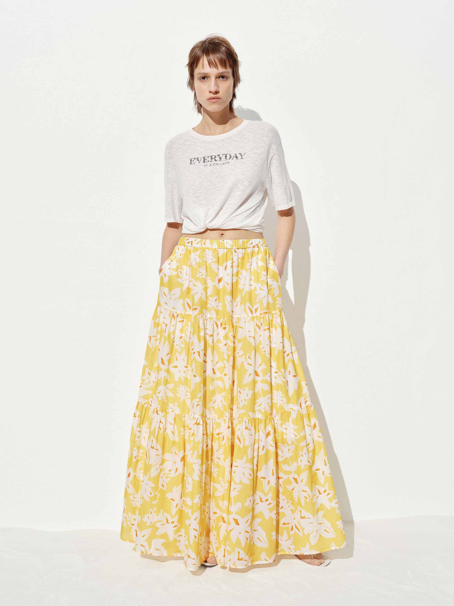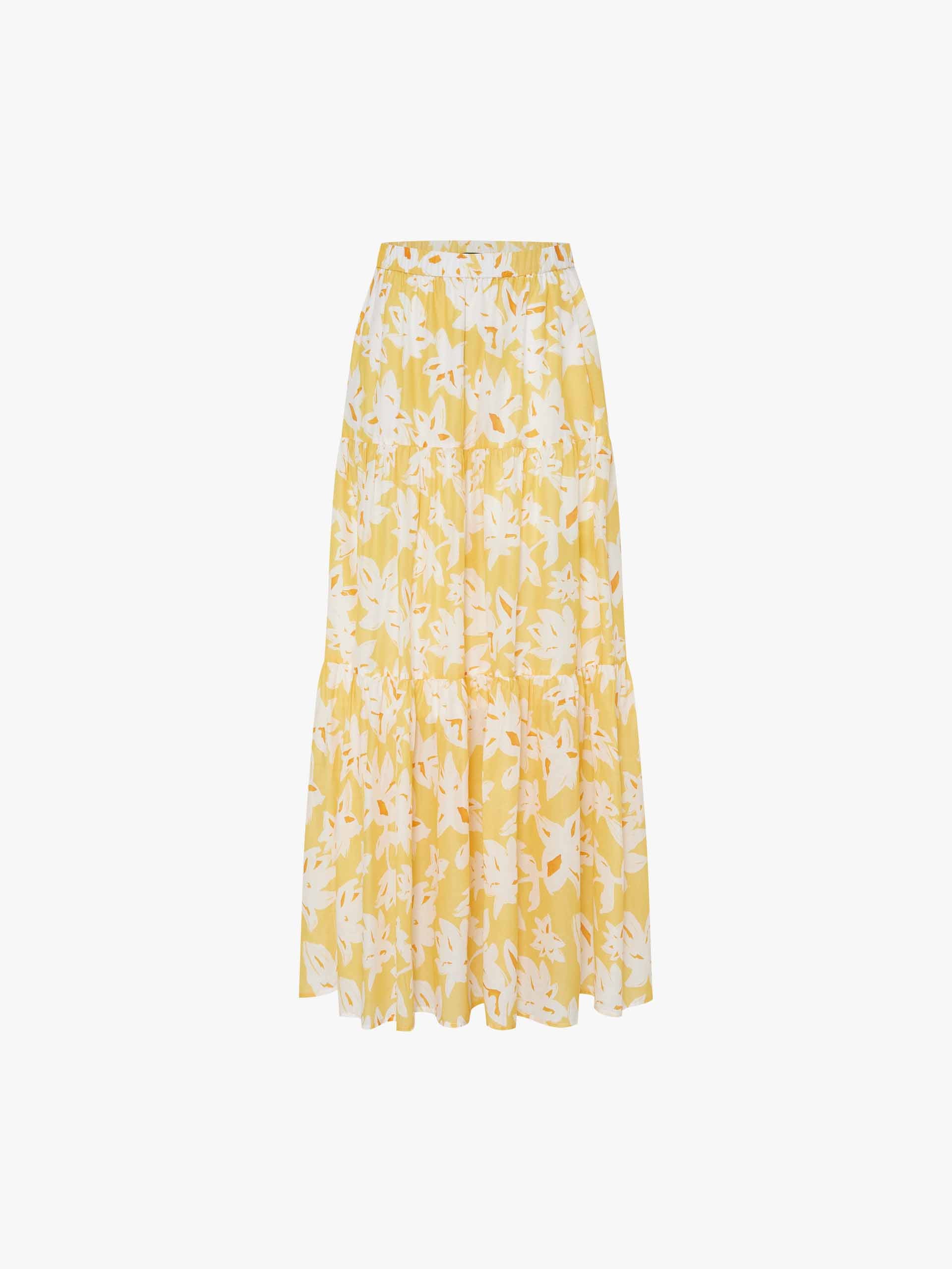 Embrace the romance of spring with this flowy floral maxi skirt. The elasticated waistband offers all-day comfort while creating a flattering silhouette, and side pockets add practical charm to this poetic piece. Delicate pleated detailing amplifies the skirt's movement, making each step a visual delight.