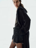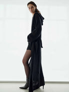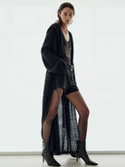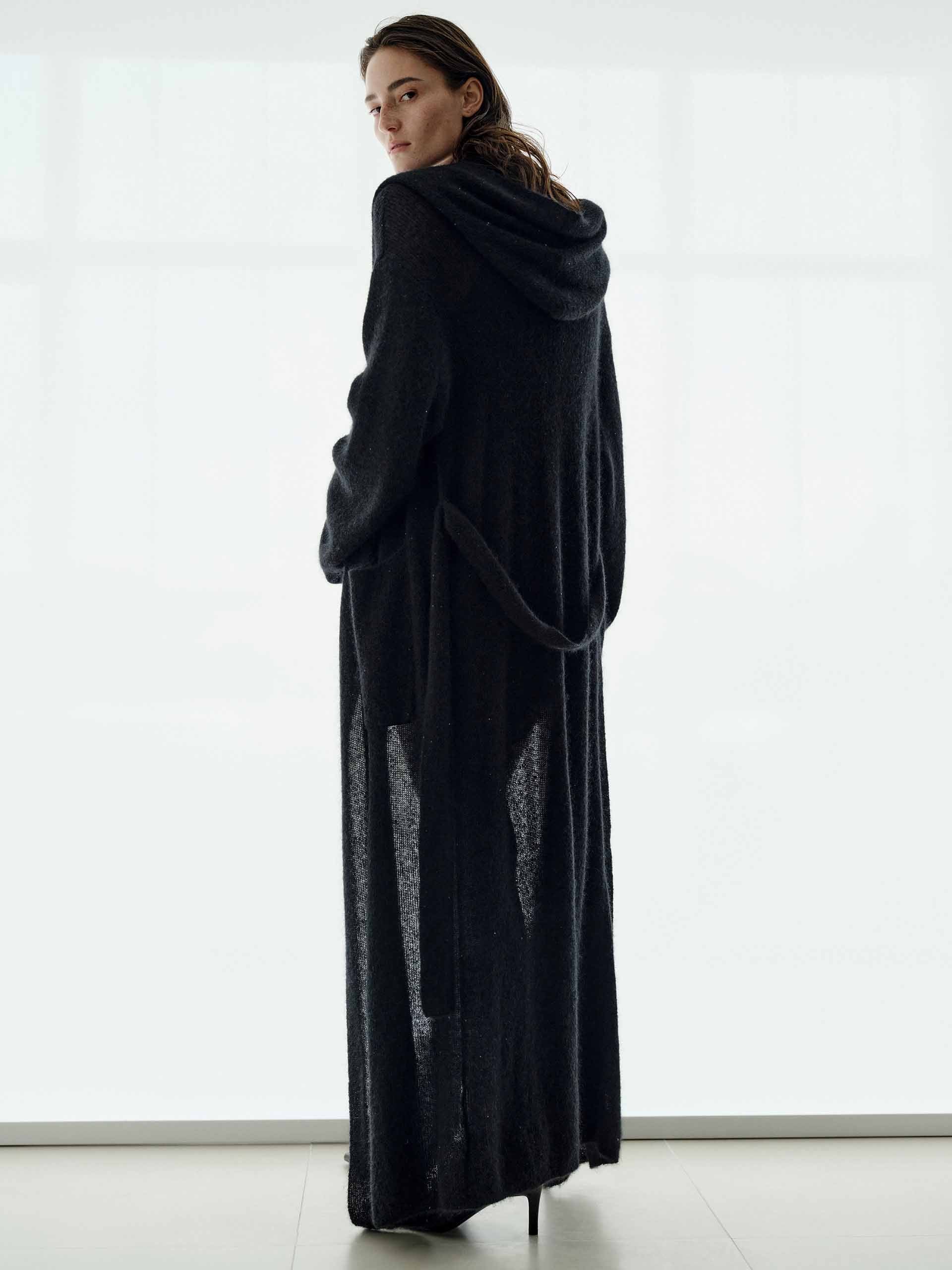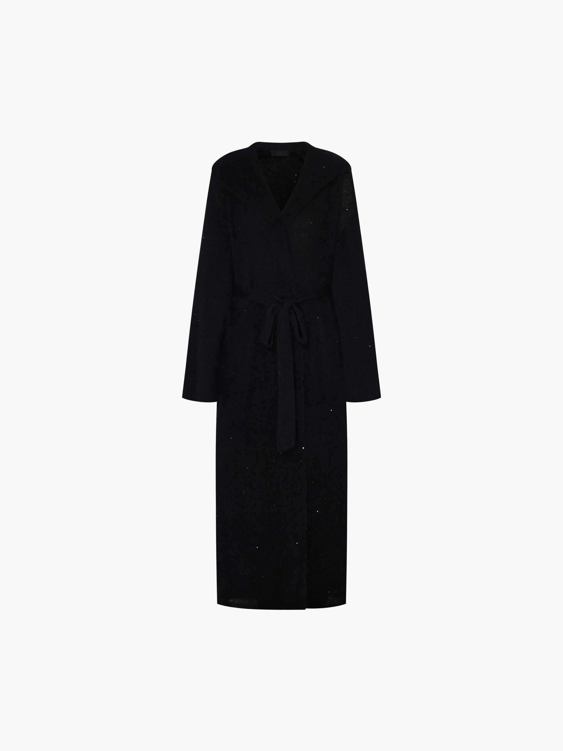 Featuring a hooded detail and long sleeves, this cardigan ensures cozy coverage while adding an element of chic versatility. The dazzling sequin-finished fabric catches the light with every move, creating a subtle yet captivating shimmer. Complete with a functional waist tie design, it allows you to customize the fit and highlight your silhouette.