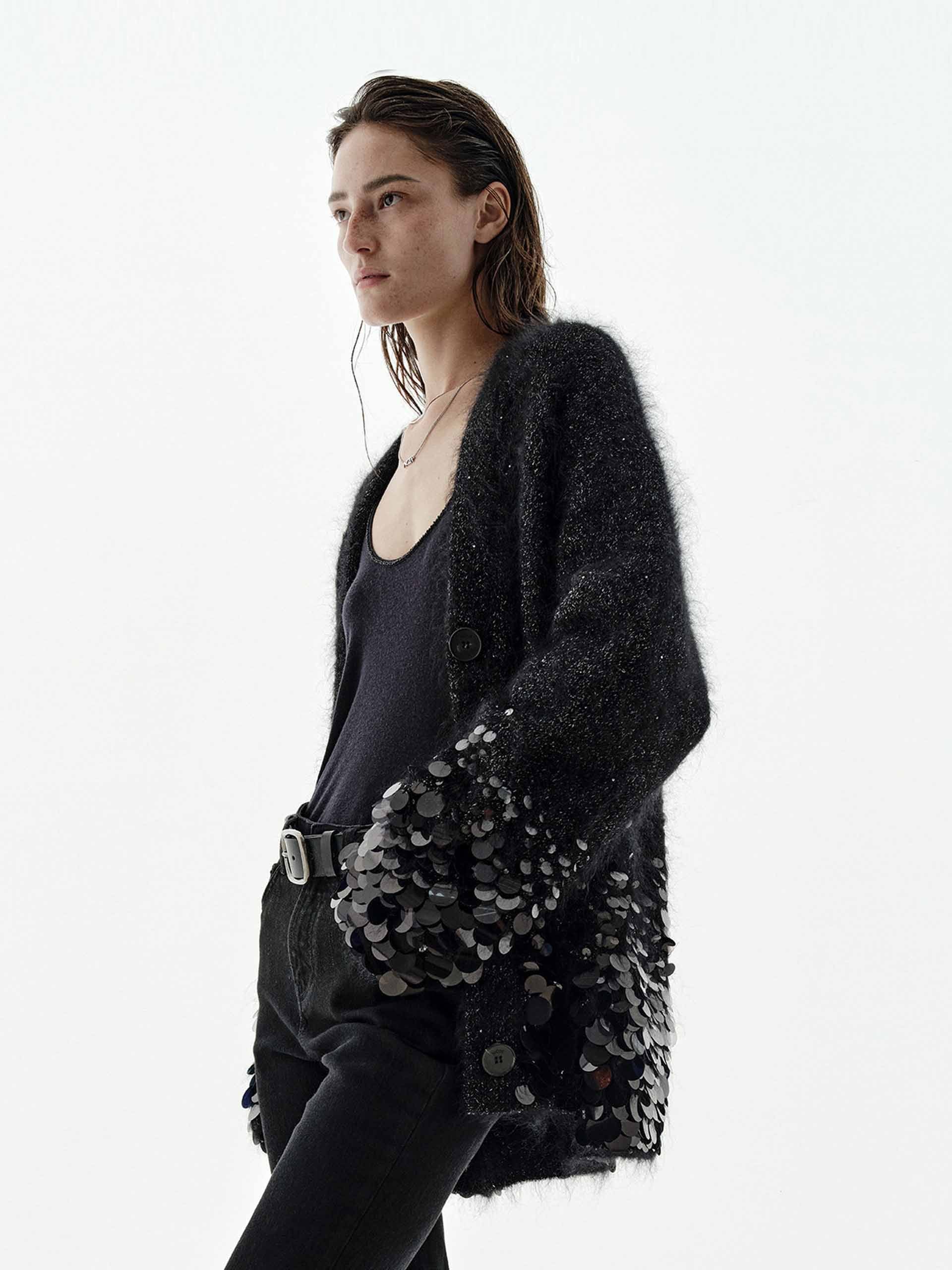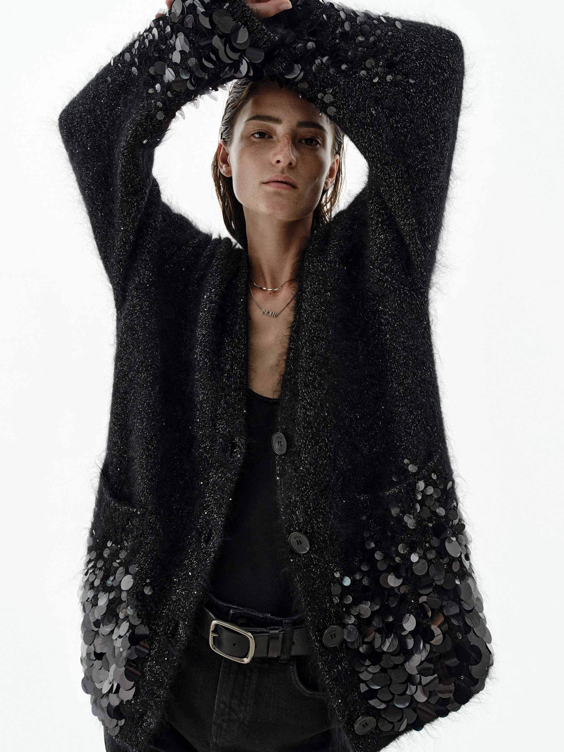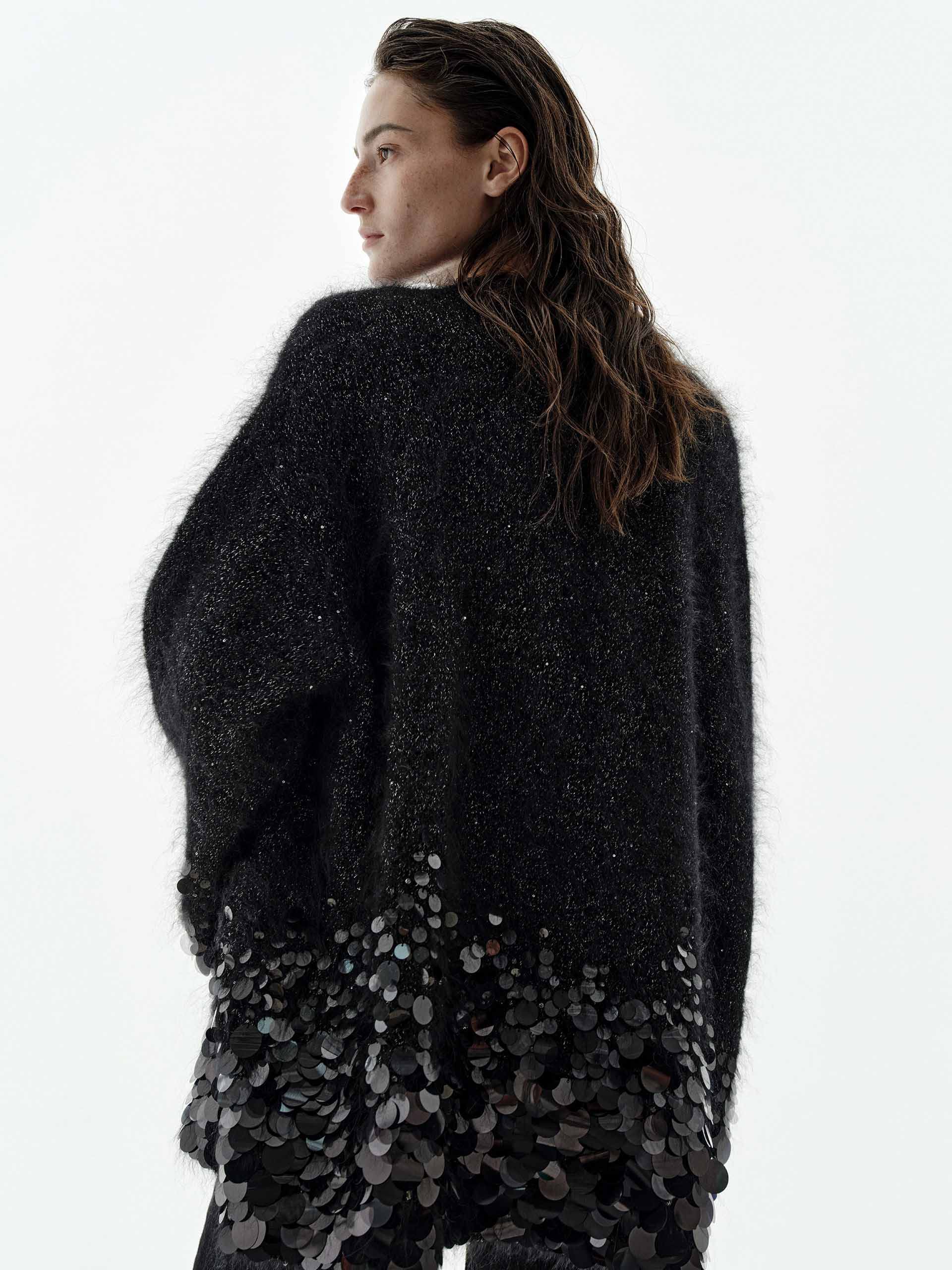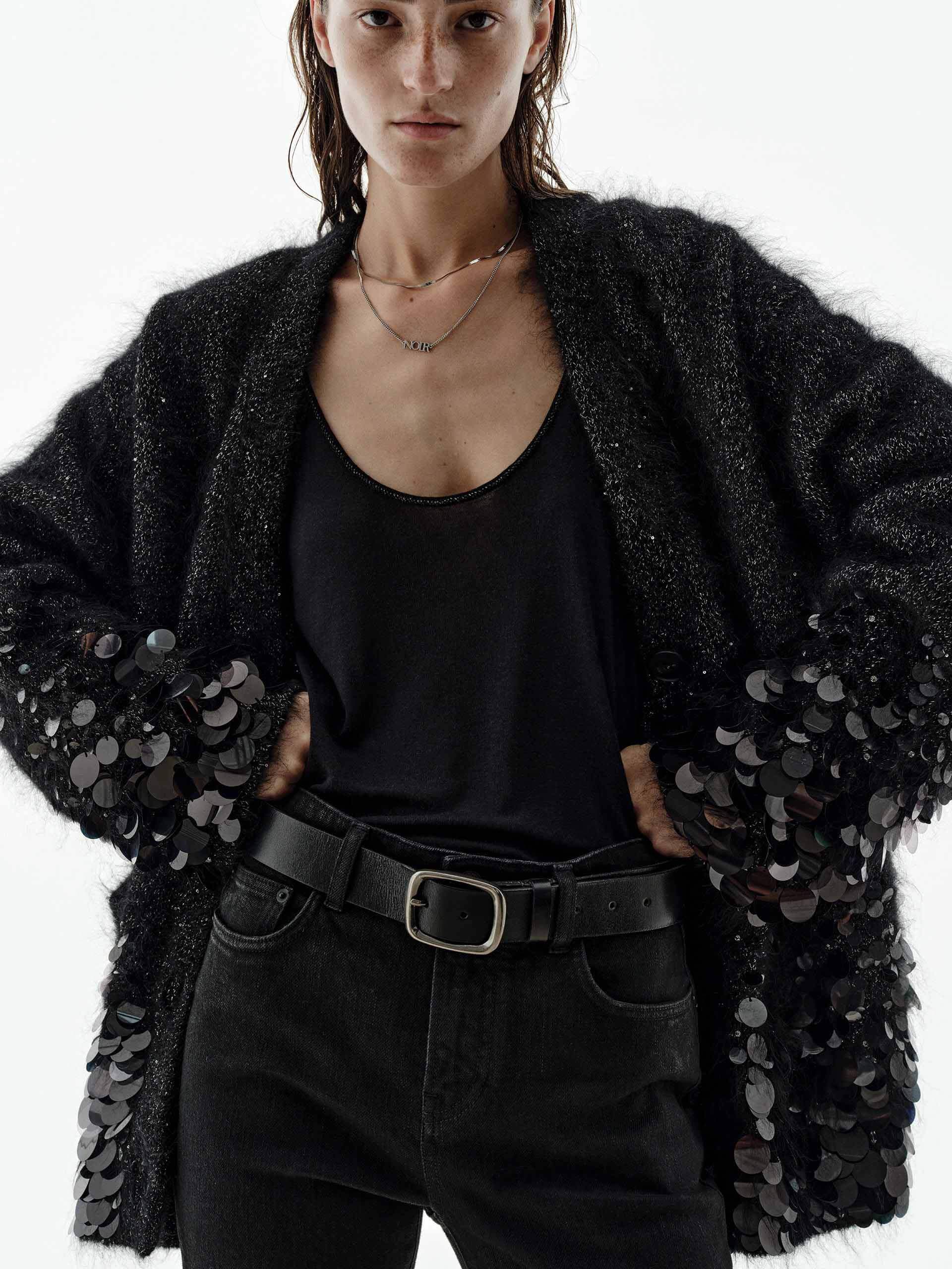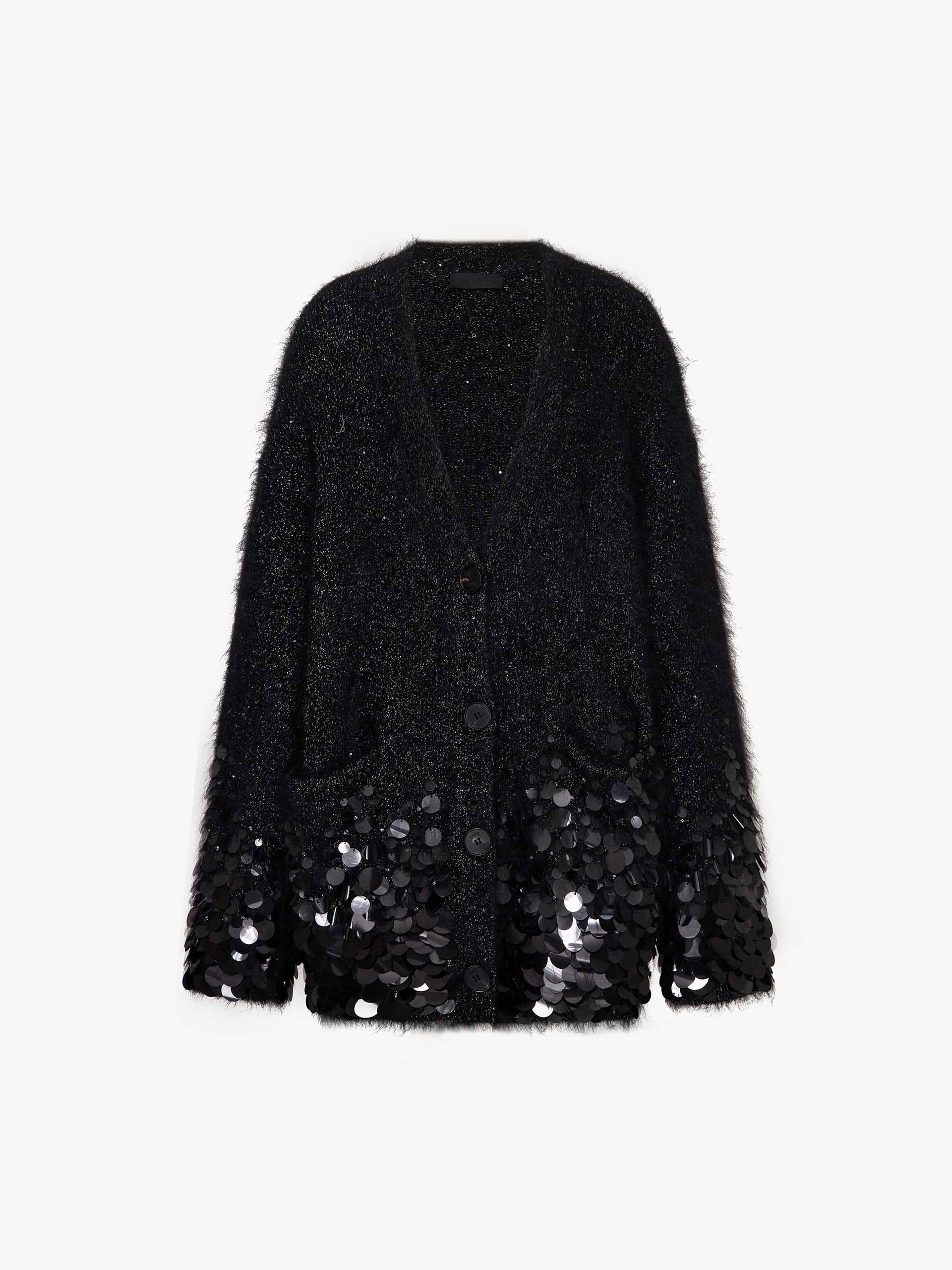 This cardigan effortlessly combines relaxed comfort with dazzling style. The flattering V-neck and practical button closure provide a versatile and polished silhouette. Expertly crafted from a luminous Lurex fabric and finished with a sequin application, this cardigan catches the light from every angle, creating a stunning visual effect that is perfect for elevating any outfit from day to night.
