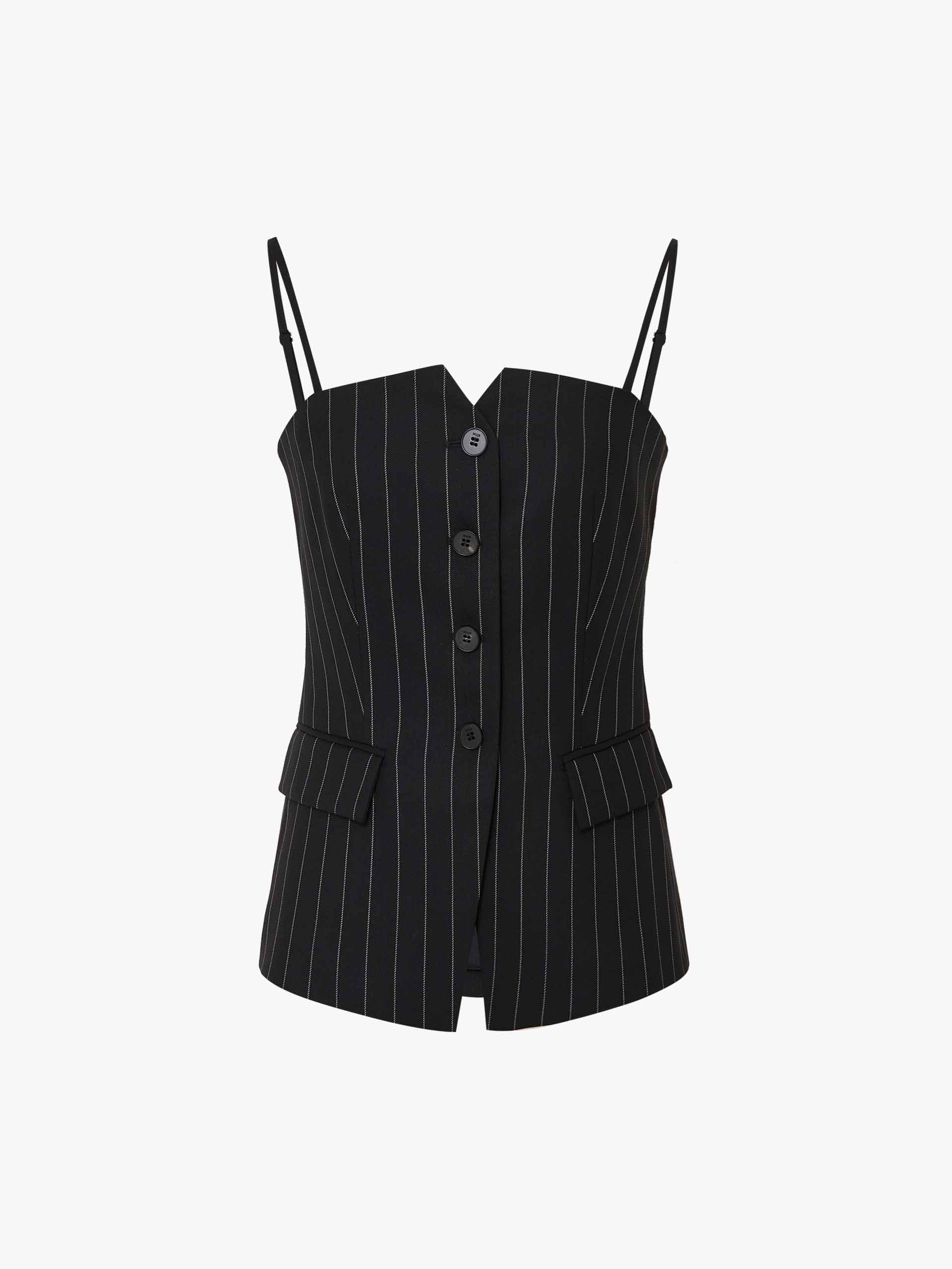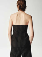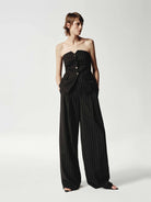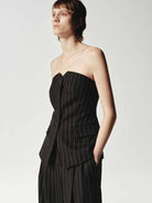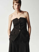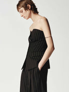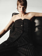 Command attention in this sleek sleeveless waistcoat, where sharp tailoring meets daring femininity. The slim-fit silhouette and cinched waist design sculpt your figure with precision, while the elegant pinstripe pattern adds a touch of timeless sophistication. Designed for both structure and comfort, the inner silicone trim ensures a secure fit along the bust. Complete with a removable shoulder strap, transitions seamlessly from strapless boldness to classic vest styling. Pair with the matching trousers for a more sophisticated and charming look.