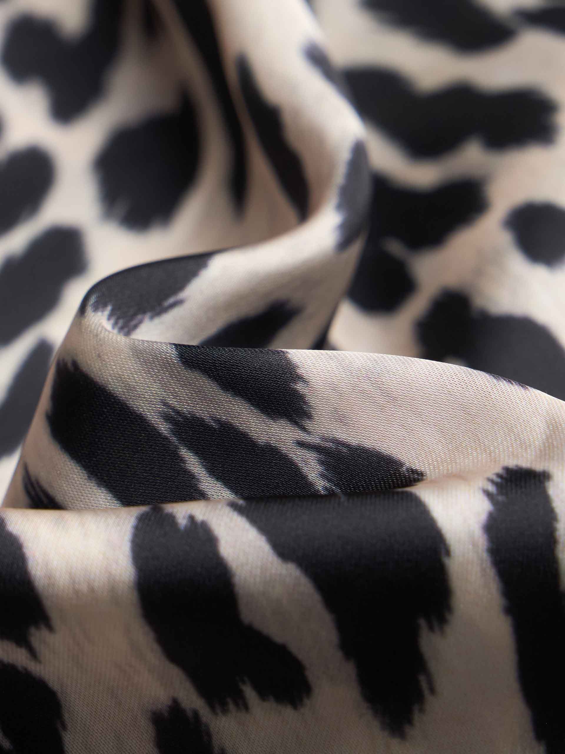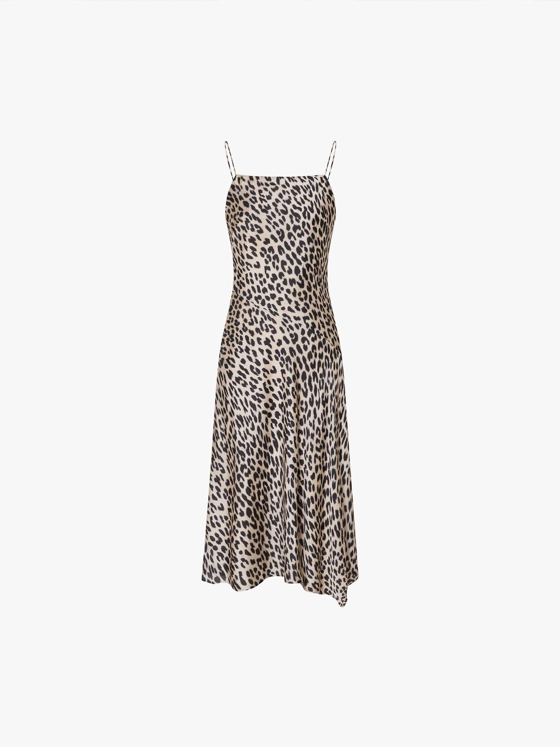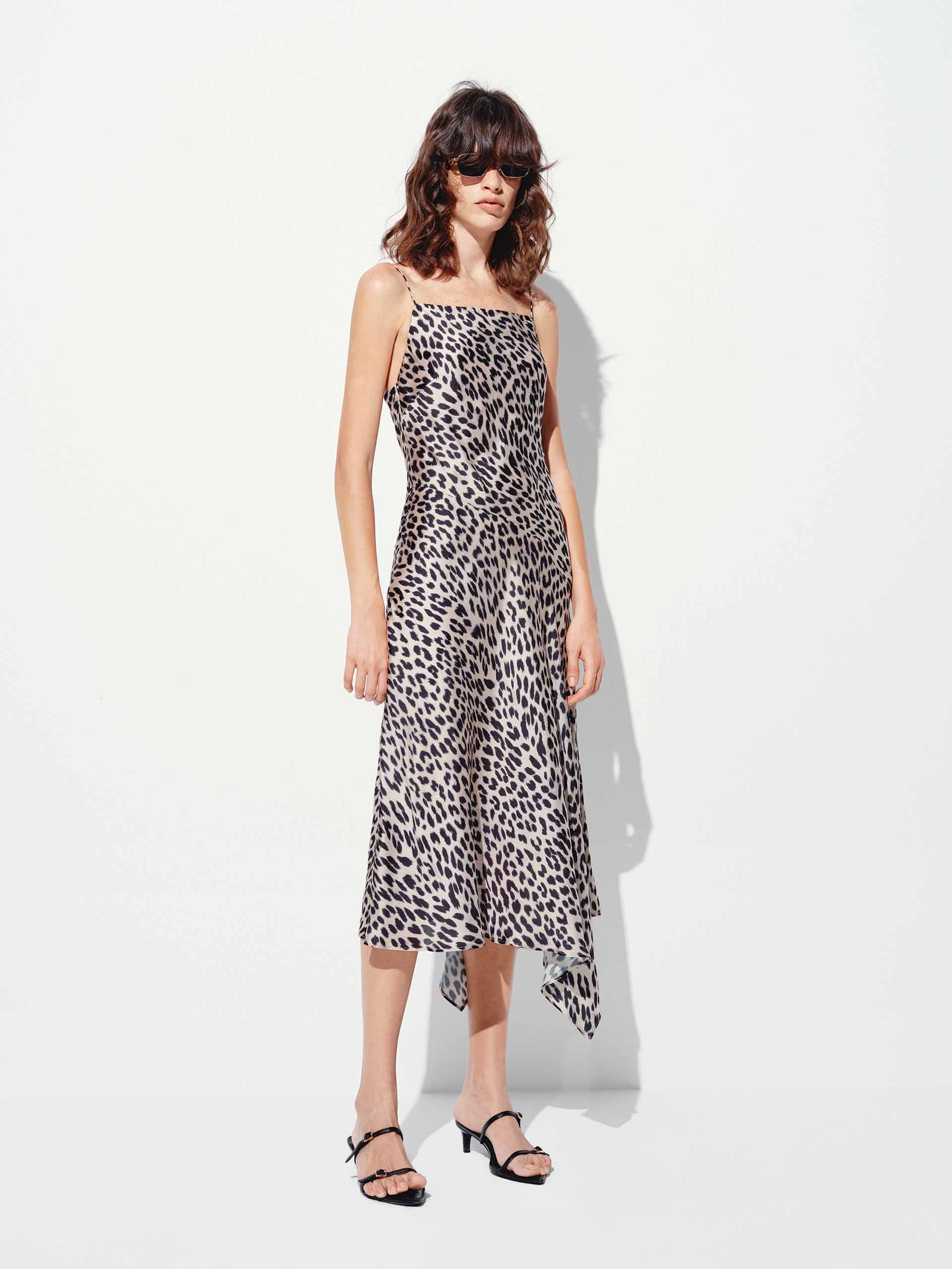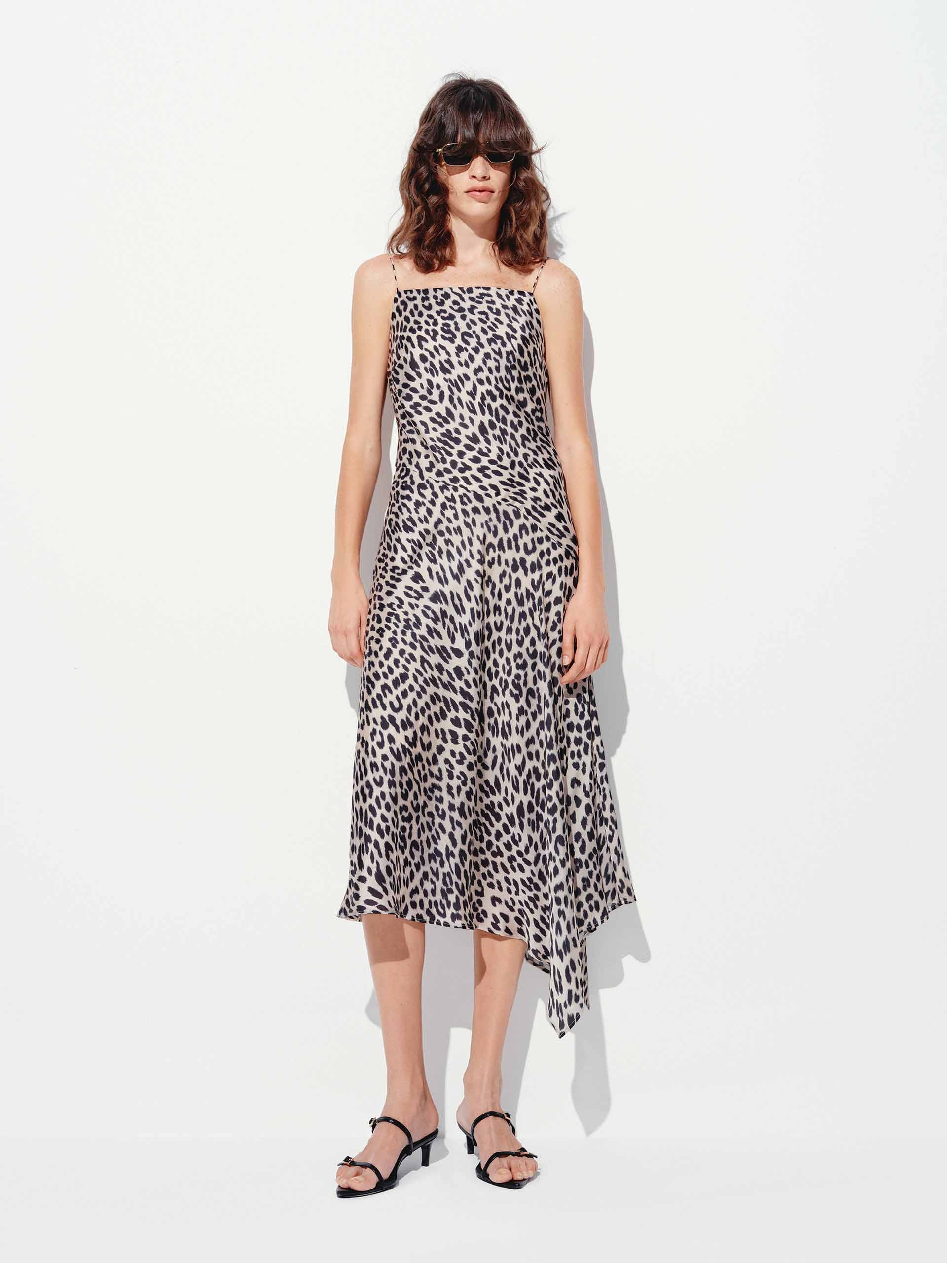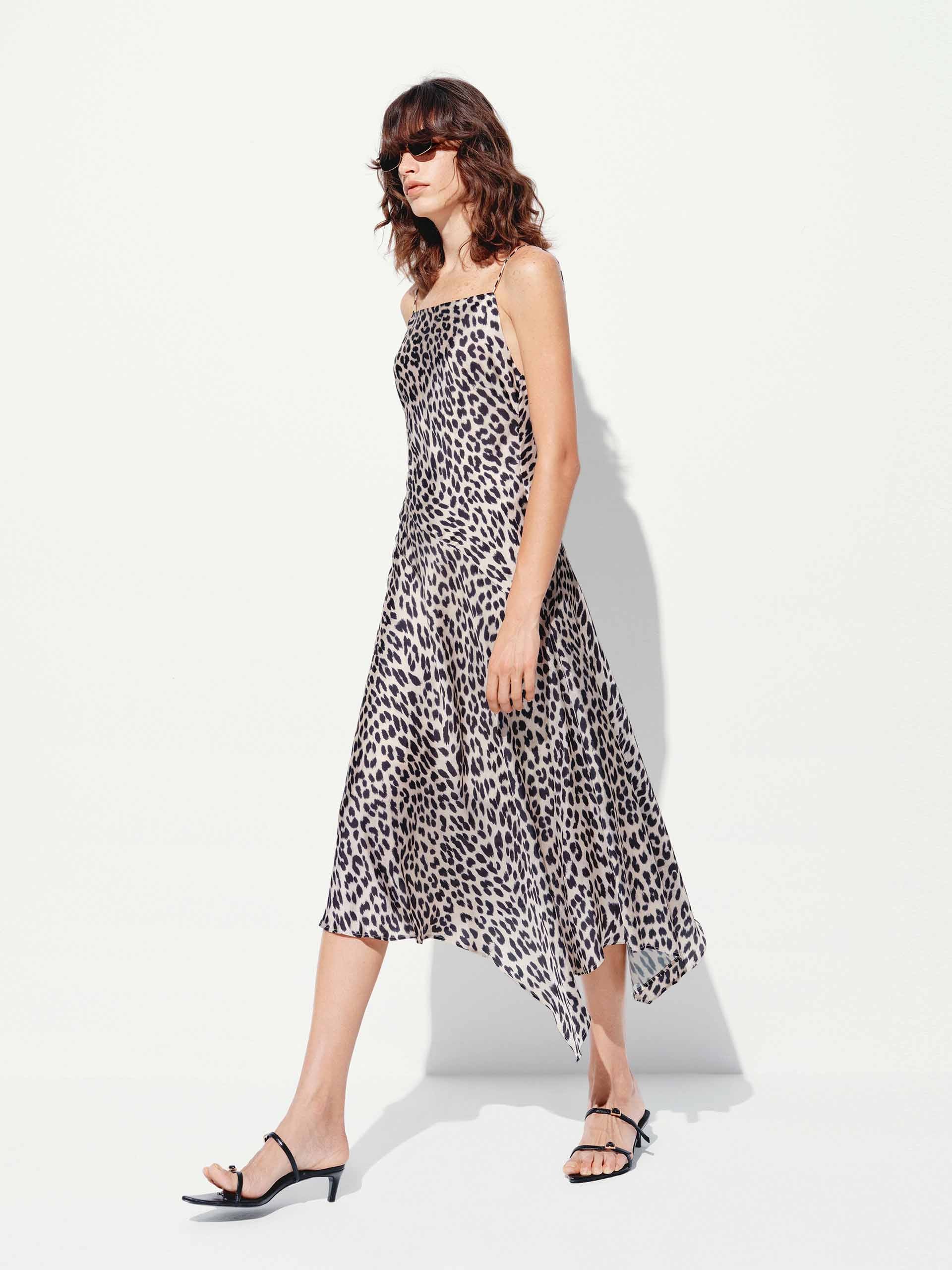 Elevate your style with this chic flowy dress, designed to make a statement with its bold leopard print and effortless silhouette. The regular fit ensures all-day comfort, while the midi length strikes the perfect balance between elegance and modernity. Featuring spaghetti straps and a playful asymmetrical hem, this dress adds a touch of dynamic movement to your look, making it ideal for both casual outings and evening events.